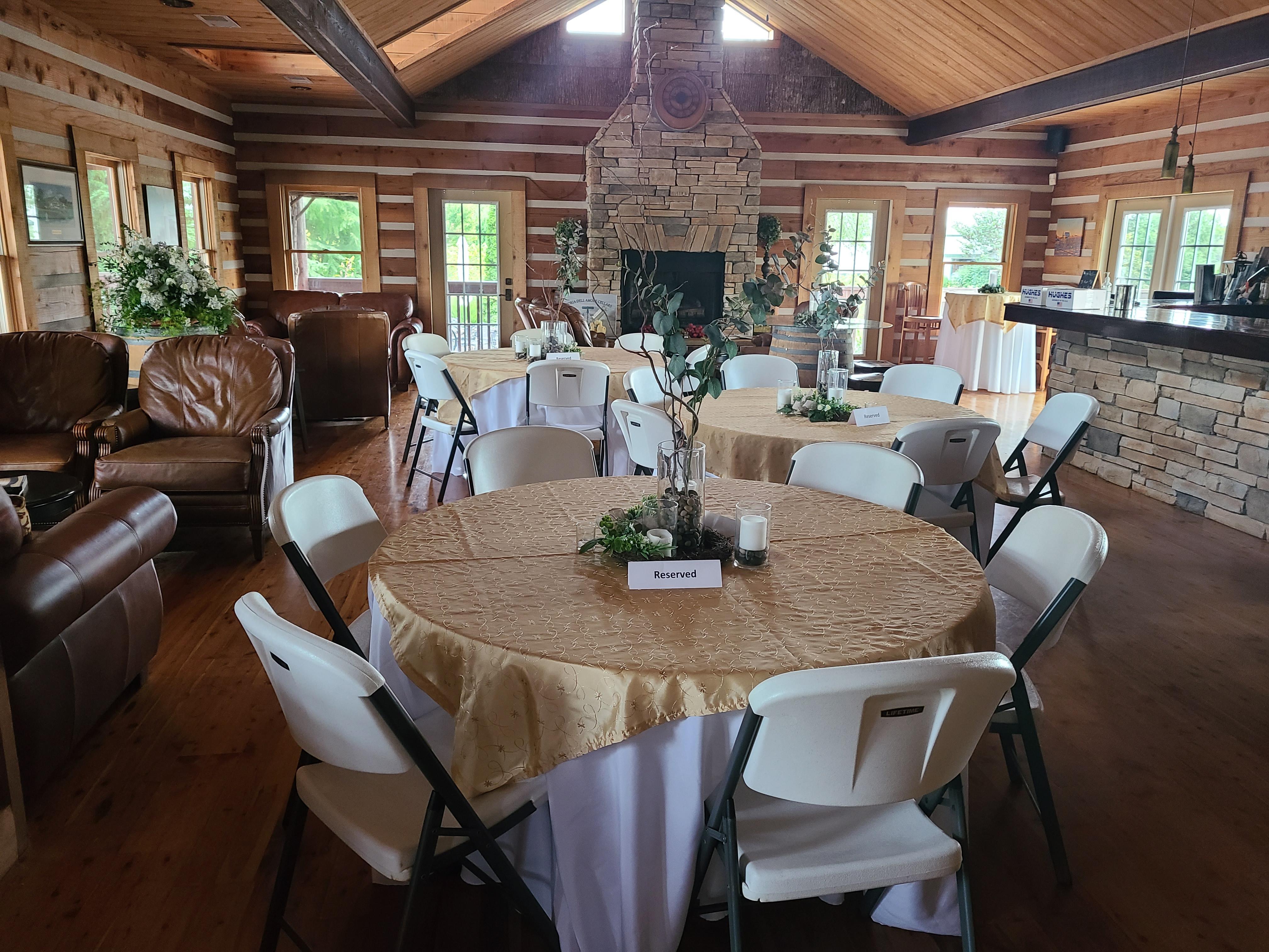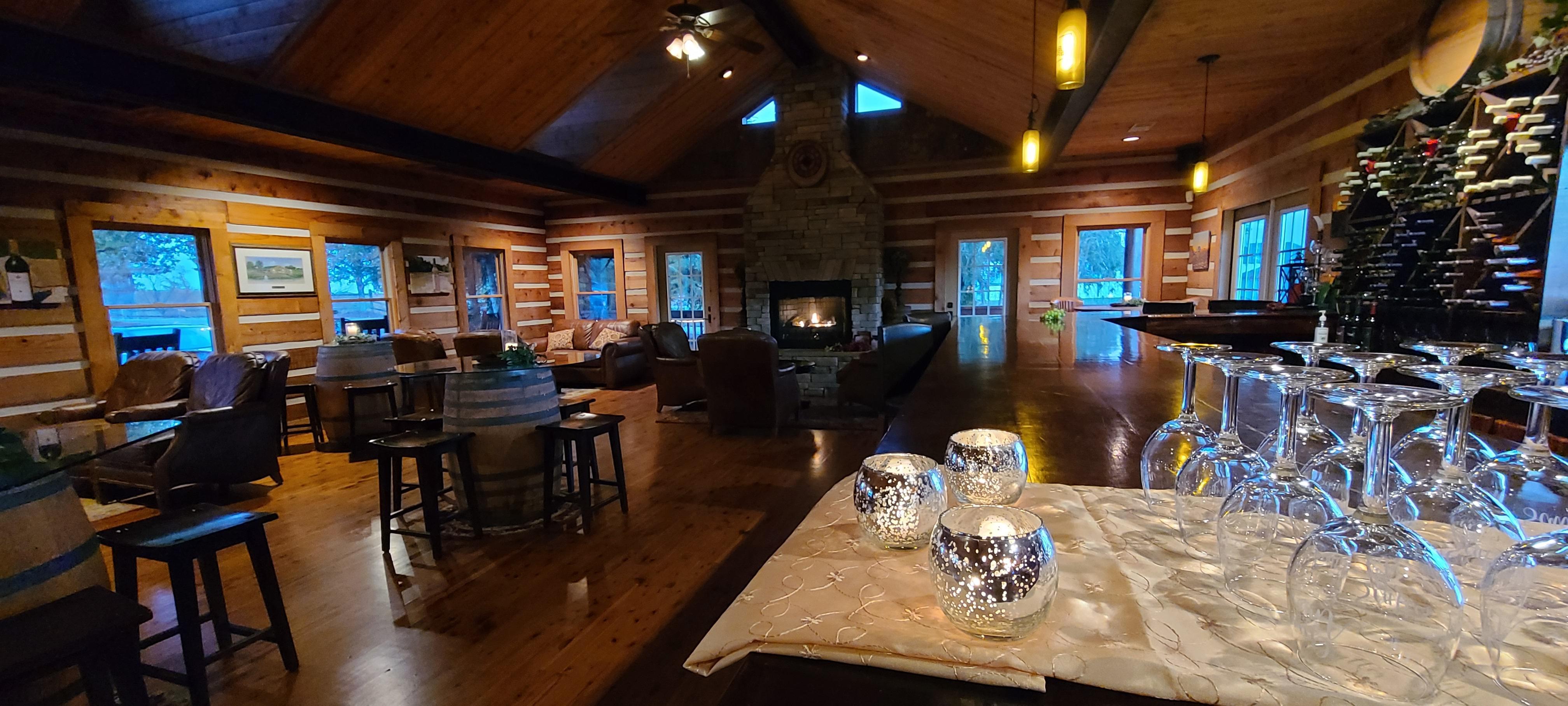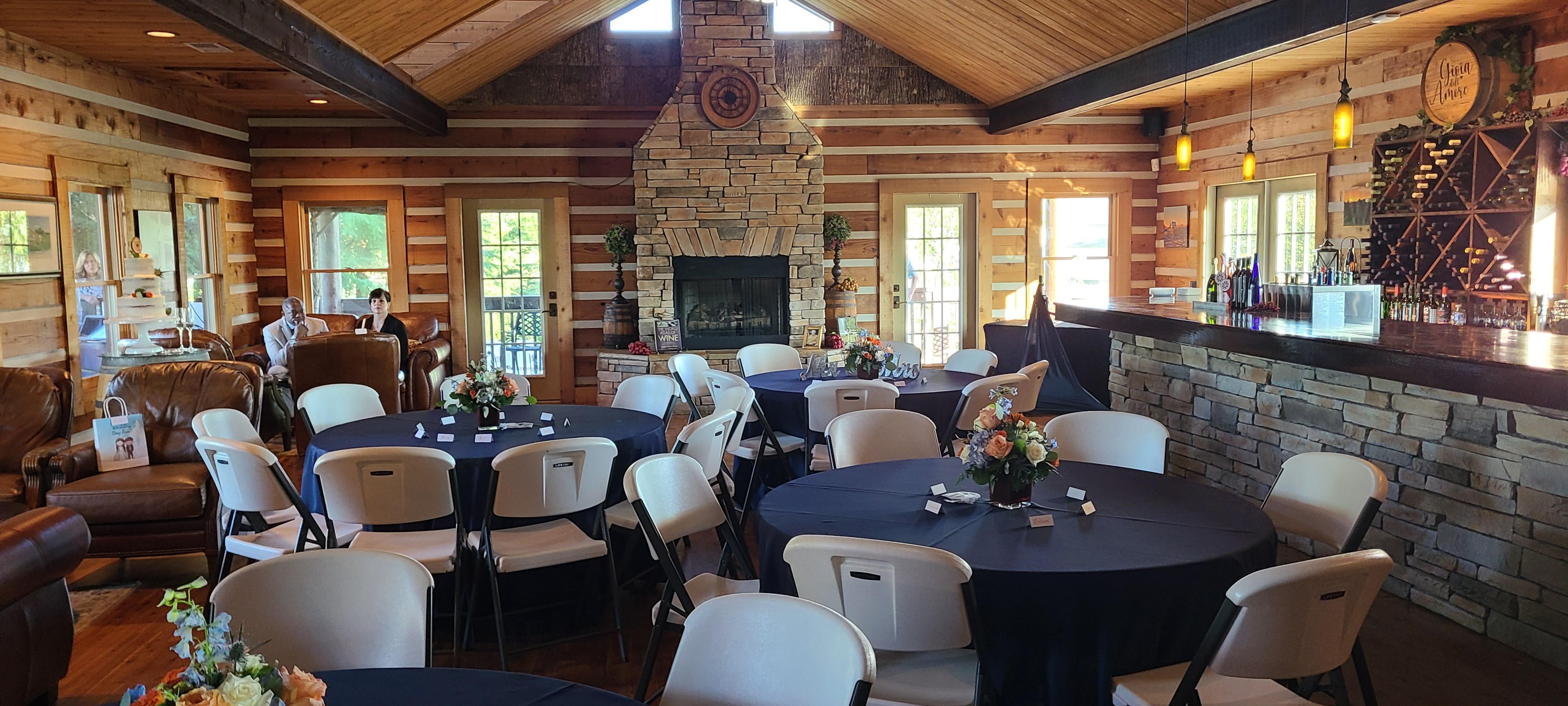 Escape to a cozy, cabin-inspired retreat in our tasting room, available for your special events on weekdays or after 7:00 pm on weekends. The bar area, complete with a crackling indoor fireplace, sets a warm, inviting atmosphere perfect for celebrating the joy of your love. Step outside to the quaint patio with its peaceful koi pond or enjoy the fresh air on the wrap-around deck, where moments of tranquility meet the beauty of nature.