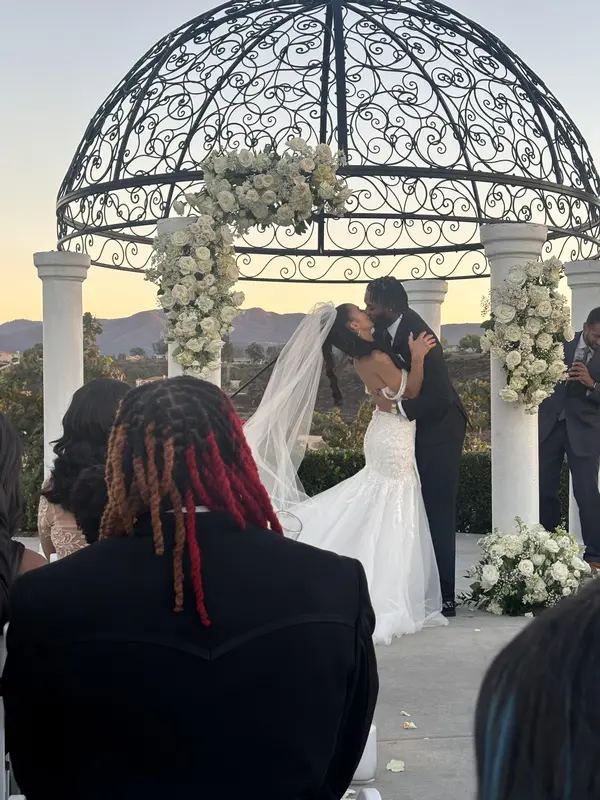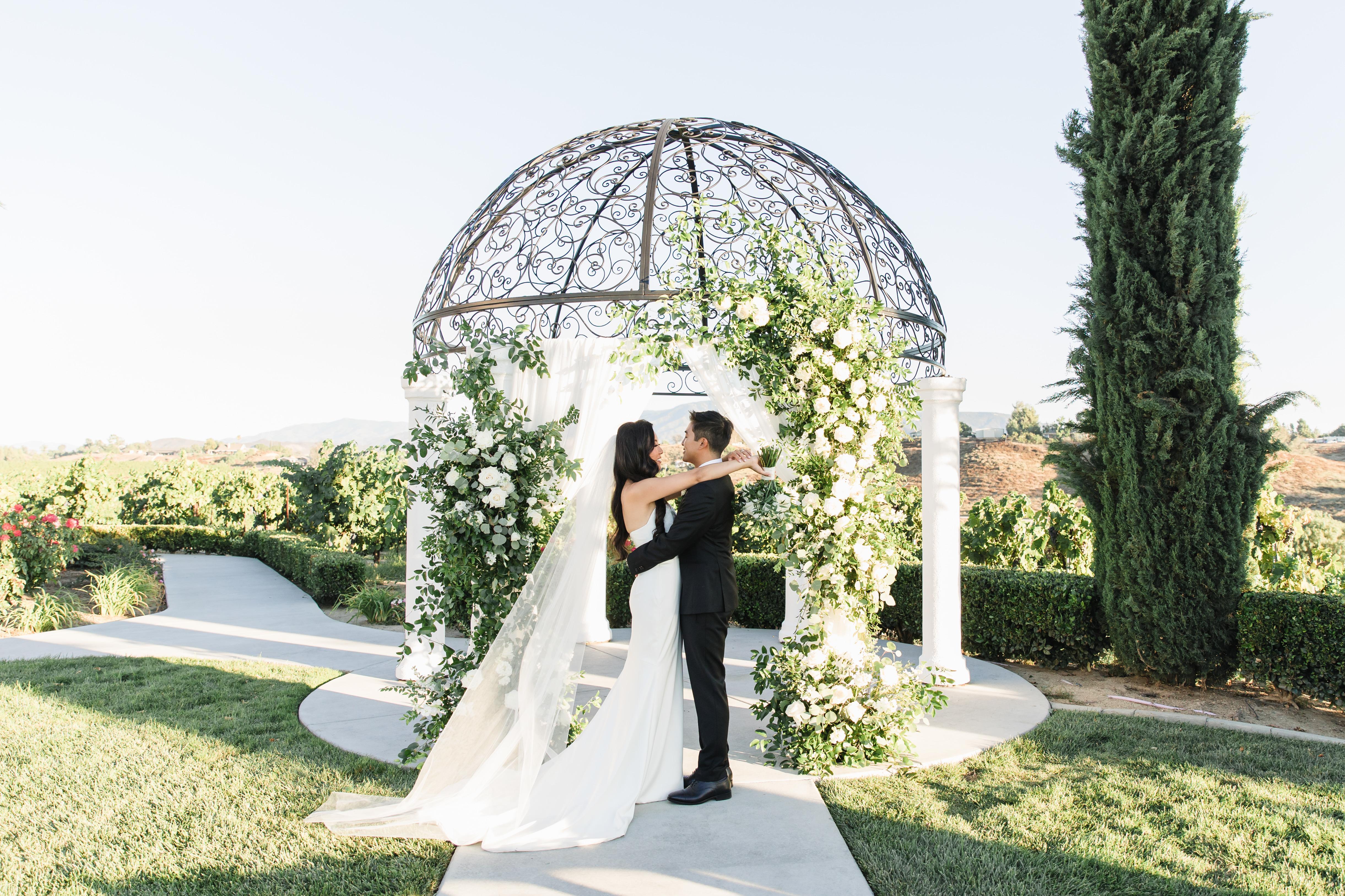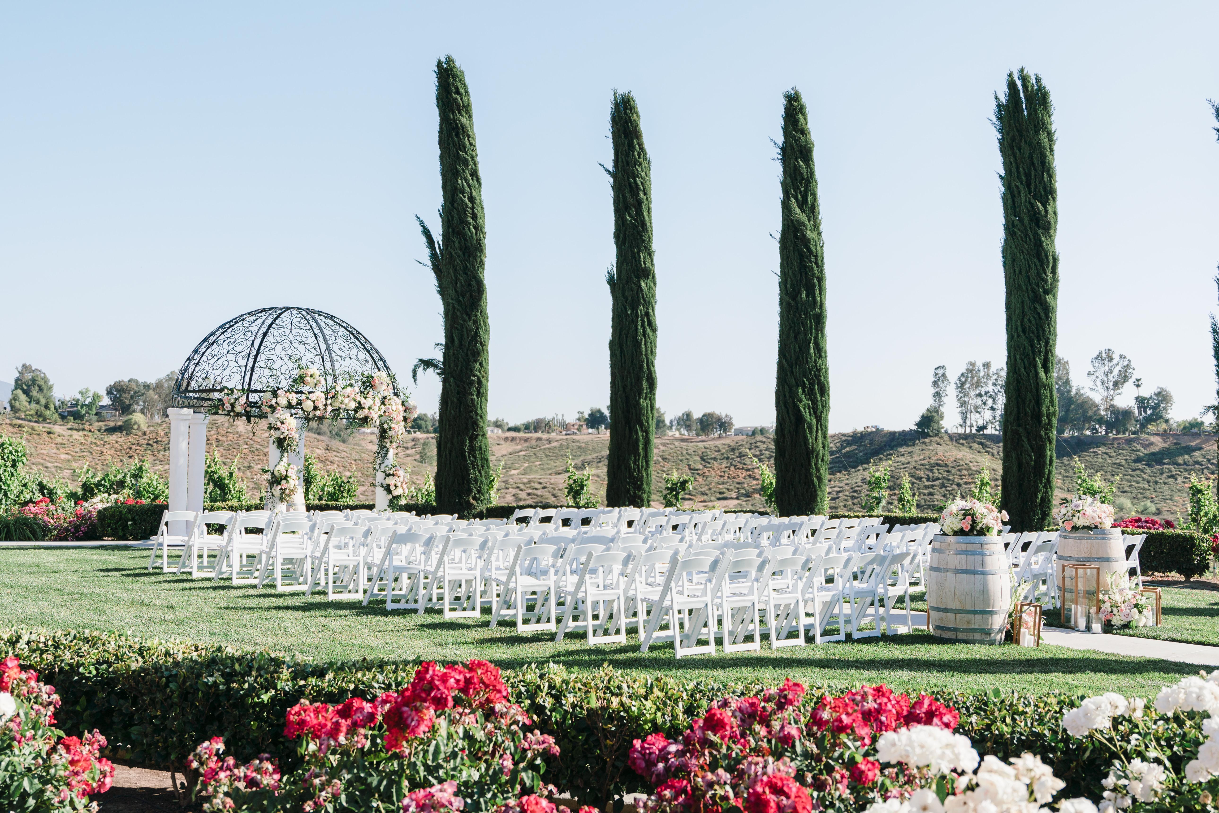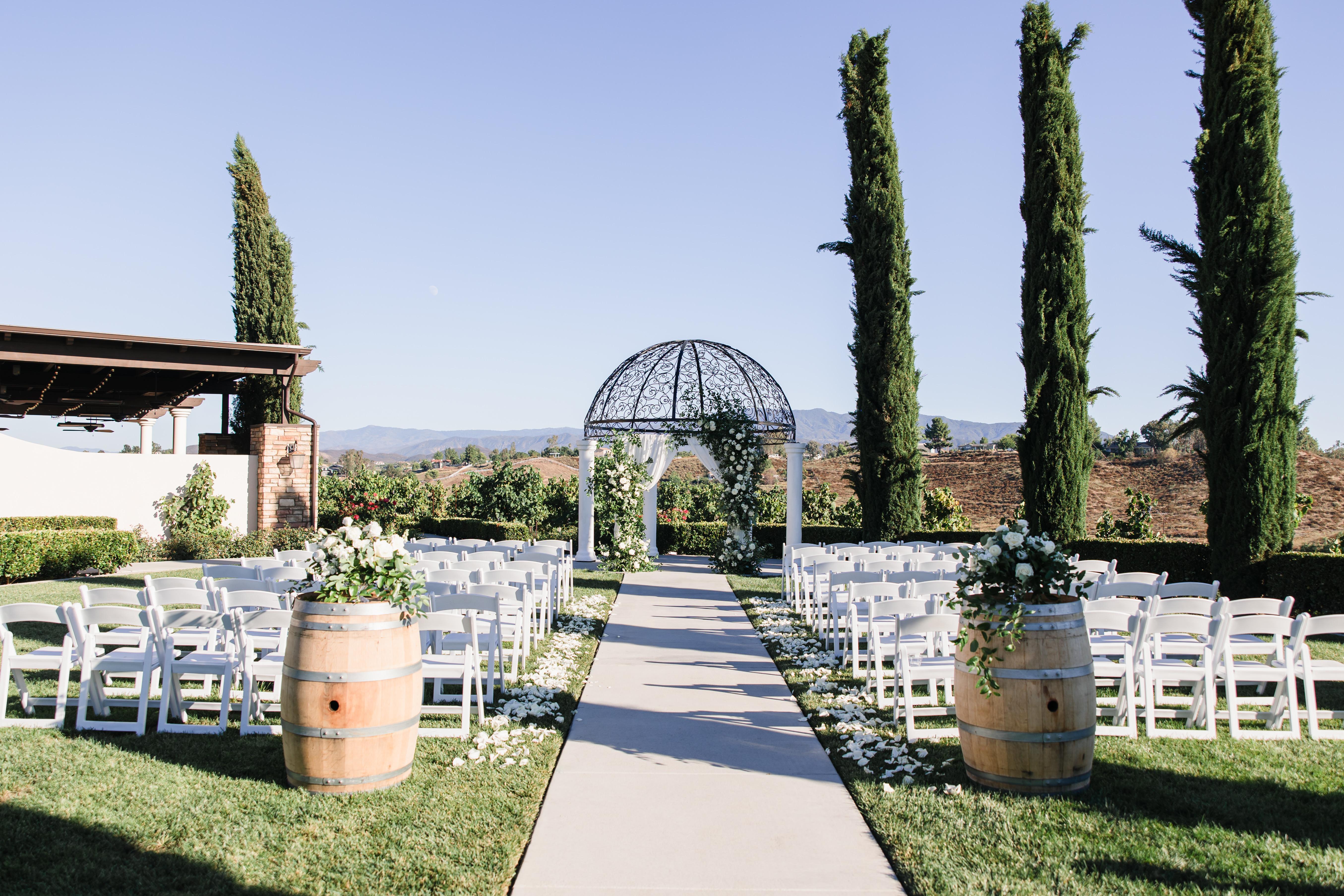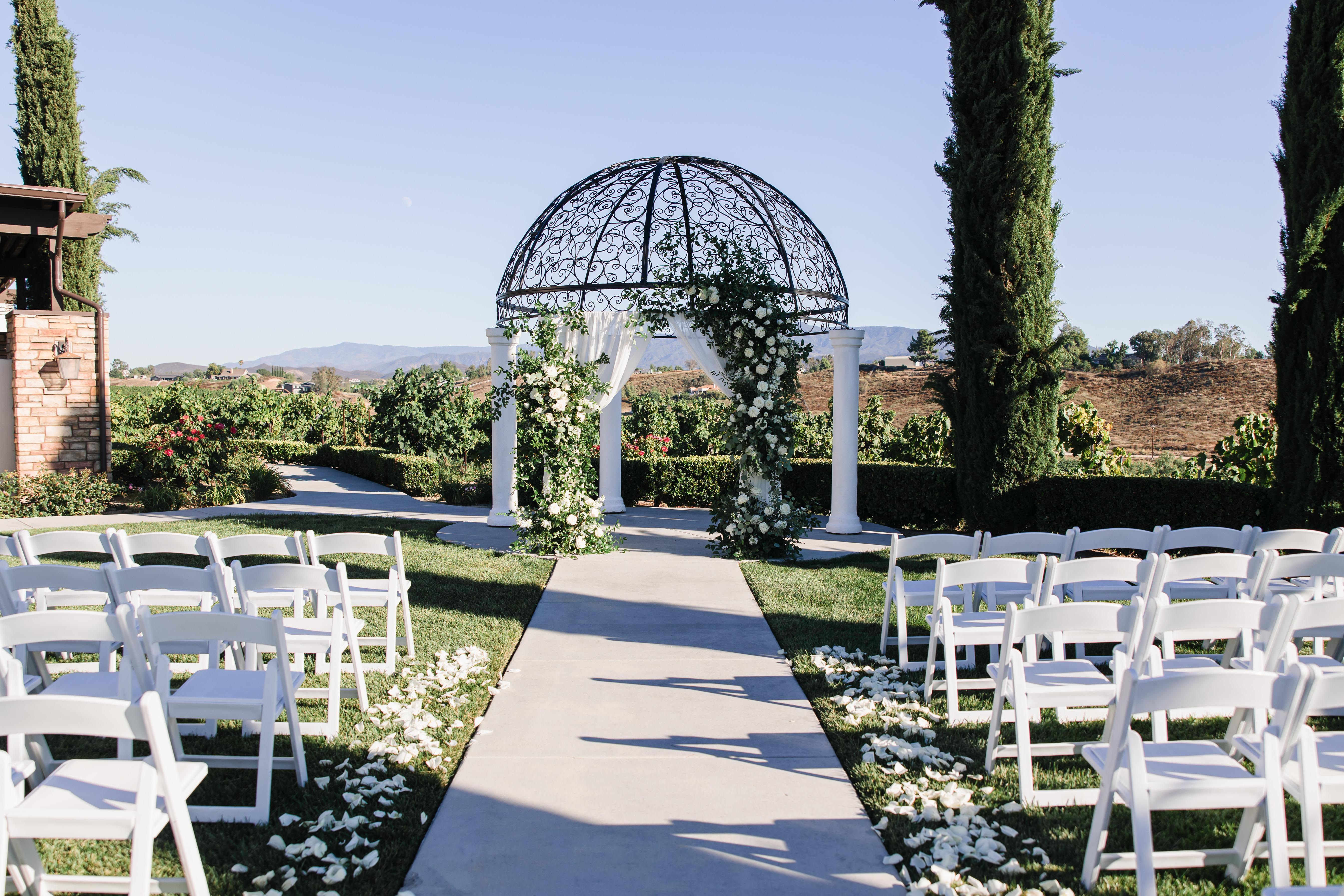 Exchange your vows amidst the picturesque landscape of a sprawling winery in the heart of Temecula's wine country. To the right, majestic cypress trees stand tall, adding a touch of timeless elegance. Across the expanse of green grass, a grand wrought iron dome with white pillars creates a striking focal point. Against the backdrop of rolling vineyards, guests enjoy panoramic views of meticulously tended vines, gently swaying in the breeze and filling the air with the promise of possibility.
