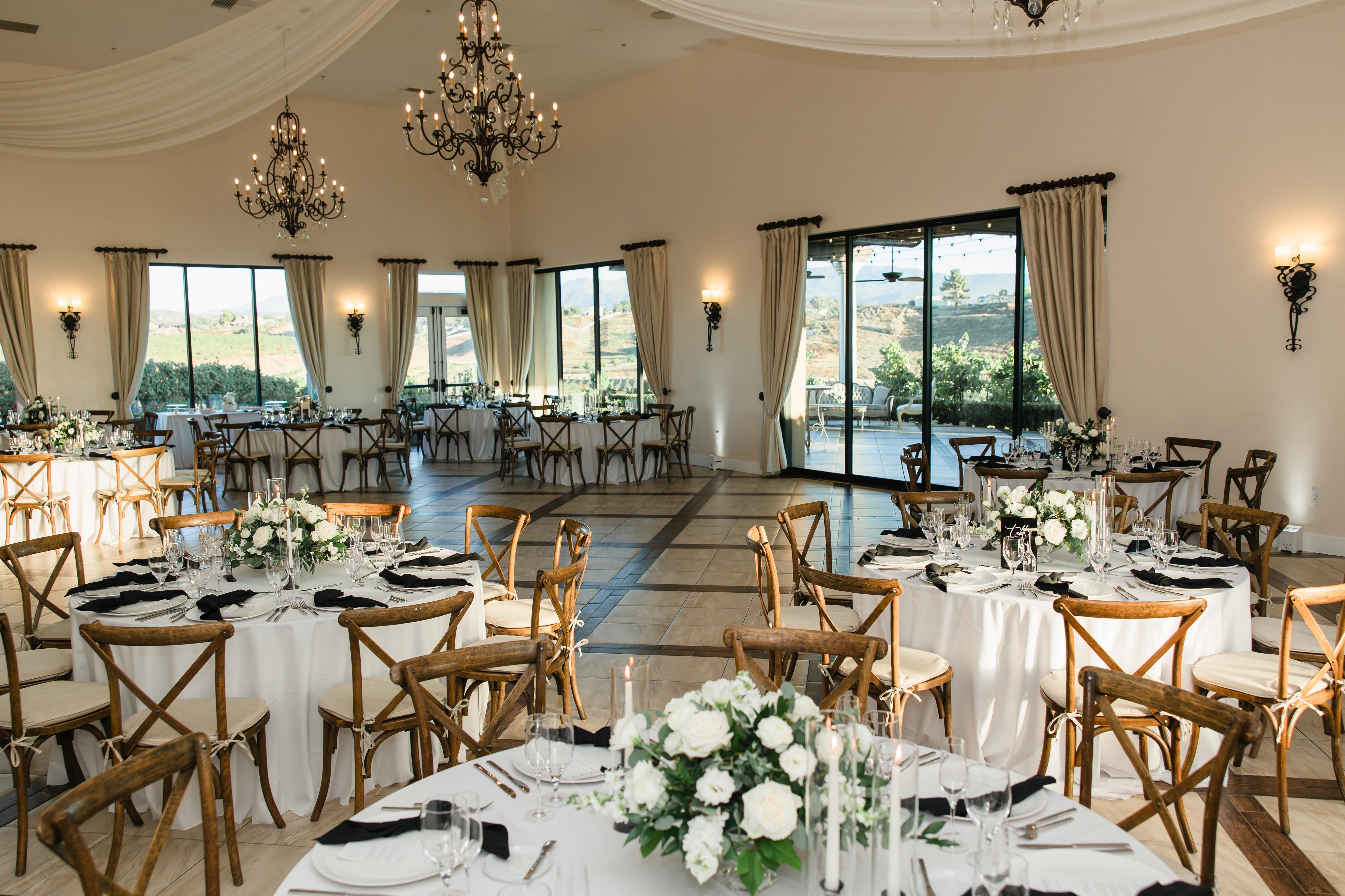 Step into the spacious grand hall, characterized by its high ceilings, wrought iron details, and tiled floor. Large windows offer views of the vineyards, seamlessly blending indoor and outdoor ambiance. The reception area extends onto a generous covered terrace, illuminated by bistro lighting, where guests can enjoy the scenic beauty of the vineyards while celebrating.