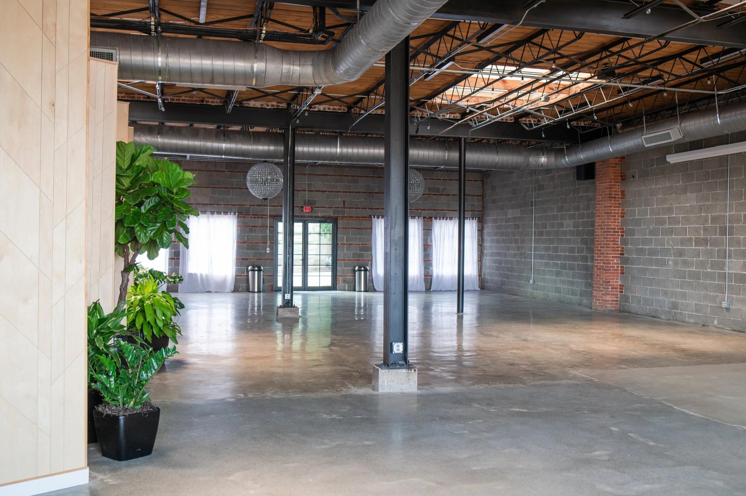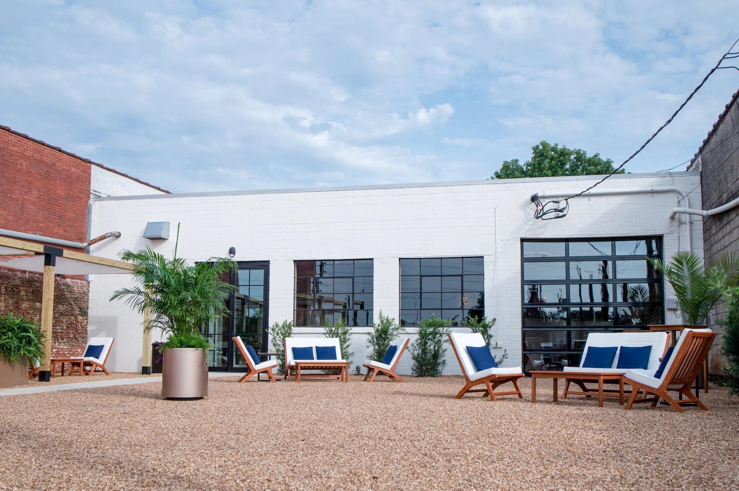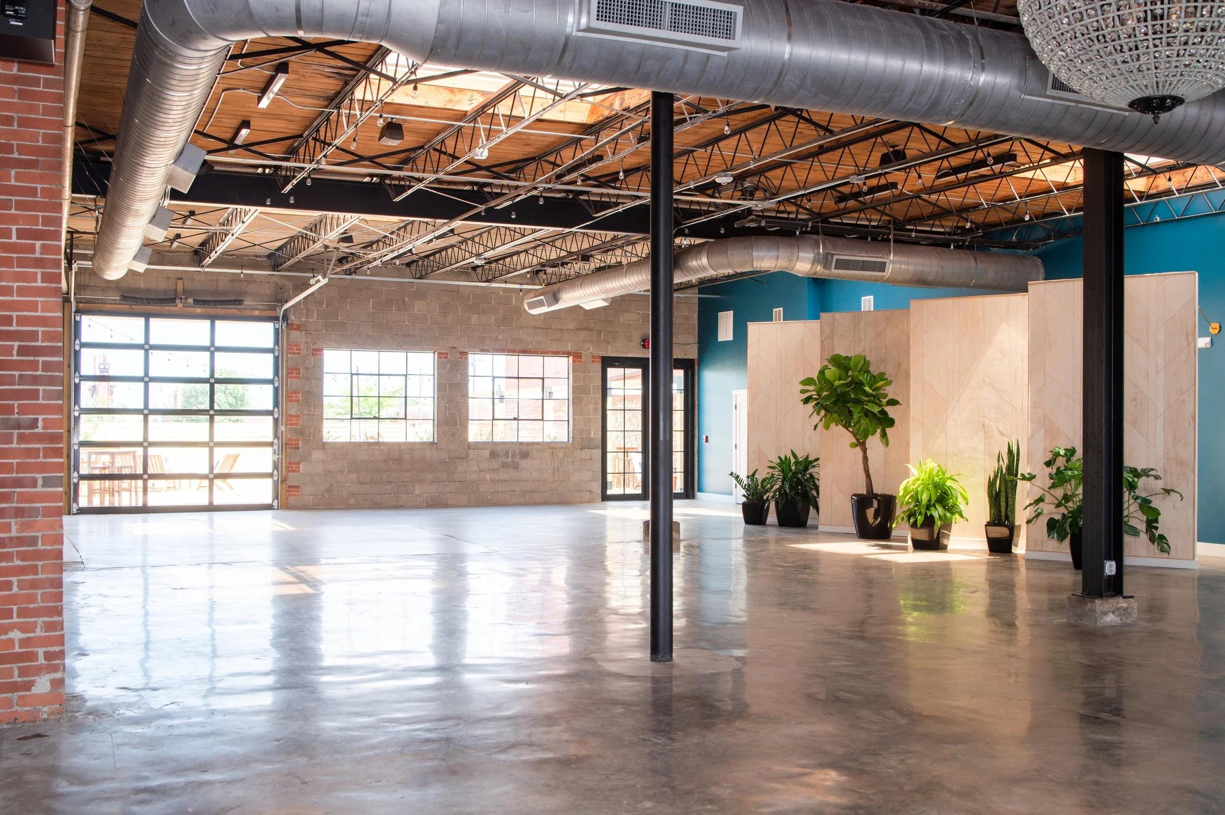 This venue features a stunning, open-plan industrial-chic interior. Polished concrete floors and high, exposed-beam ceilings with visible ductwork create a modern, airy feel. The space is defined by its versatile textures, from exposed cinder block and brick walls to contemporary light-wood partitions and bold, colorful accent walls. Massive industrial-style windows and a full roll-up garage door flood the room with natural light. These doors open directly onto a private, enclosed outdoor courtyard. This charming gravel patio features modern lounge furniture, a partial pergola, and string bistro lights, perfect for an open-air ceremony or cocktail hour with a seamless indoor-outdoor flow.