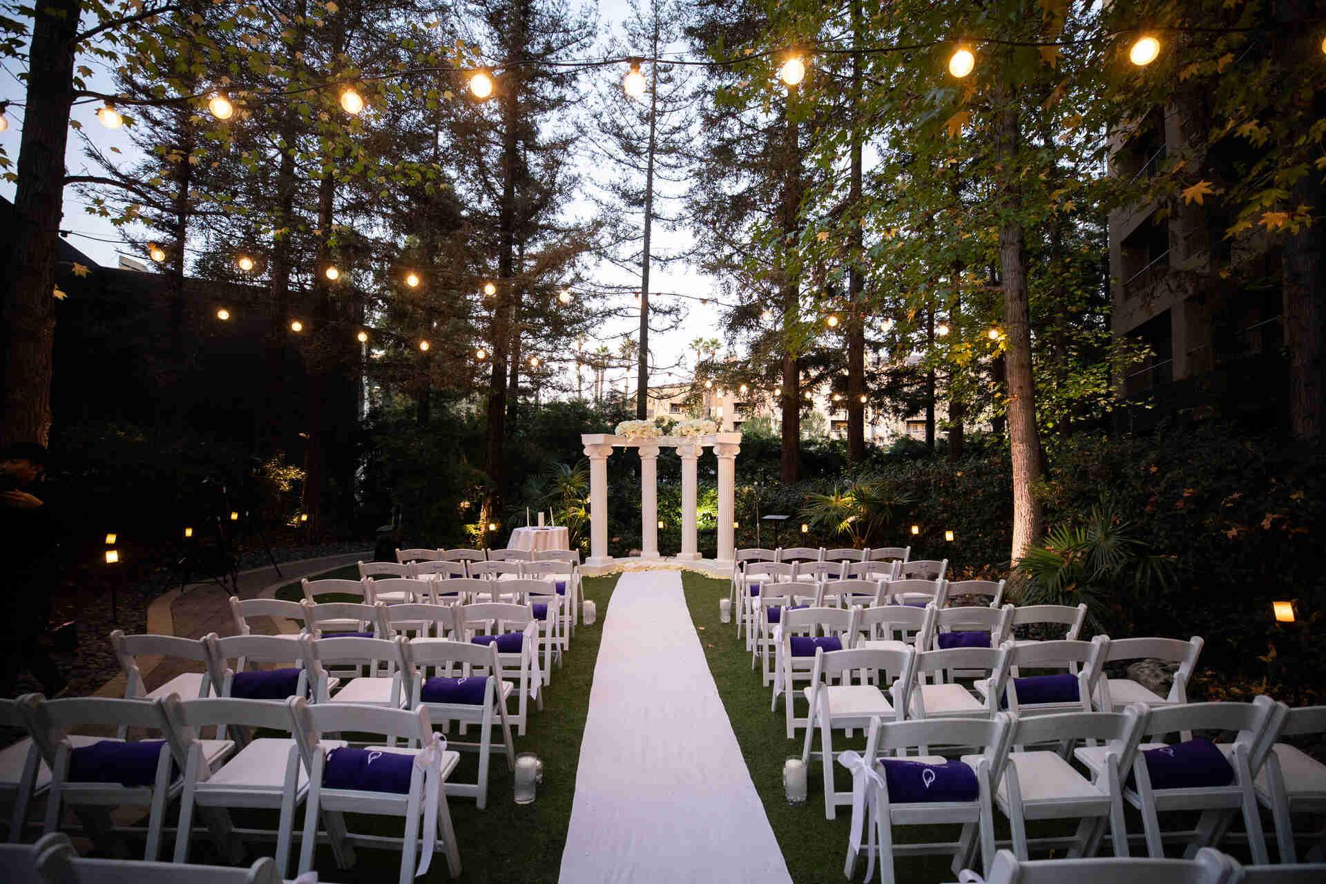 - White Folding Chairs - White Modern Columns - Isle Runner - Sound System with the Microphone - Welcome Champagne for your Guests