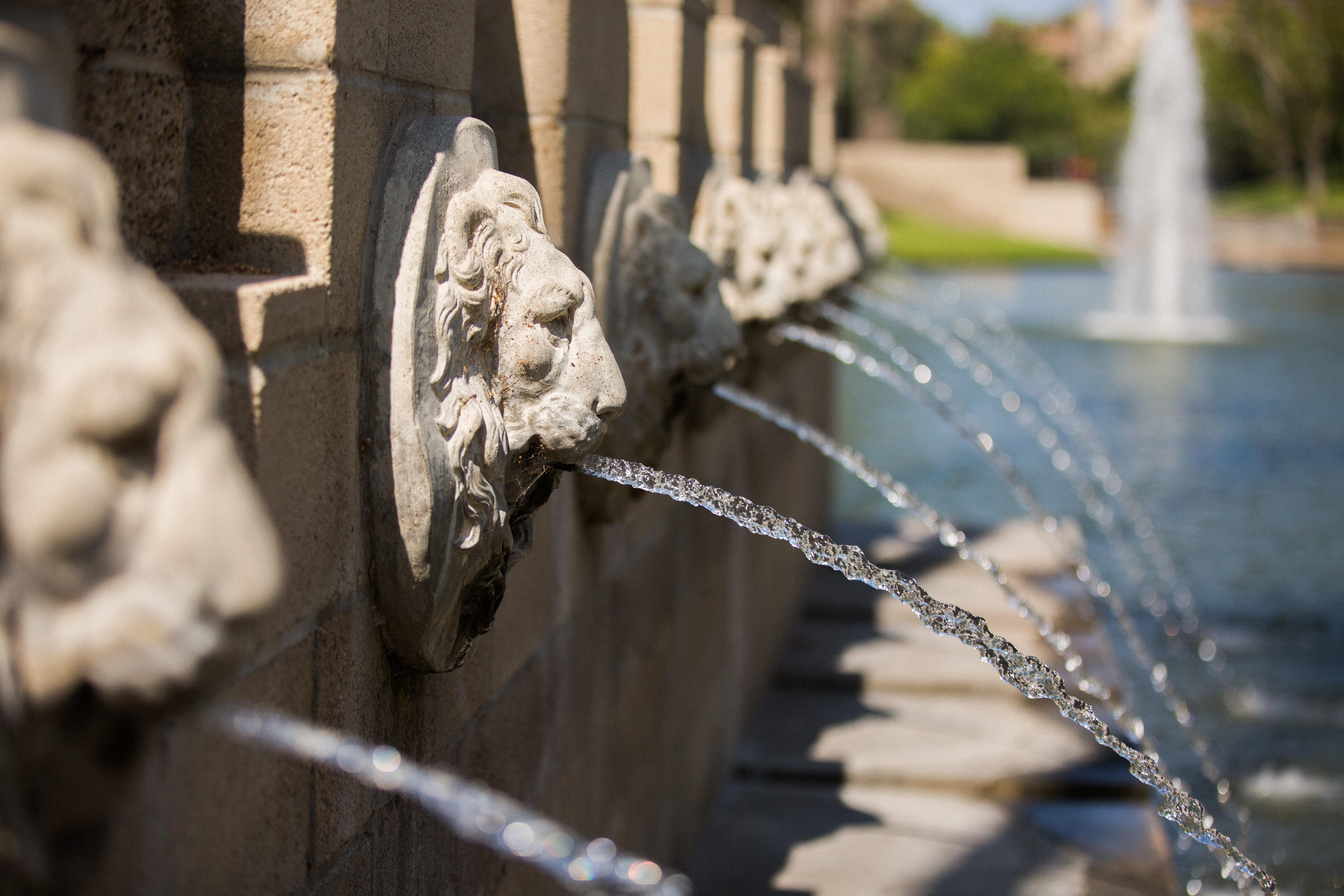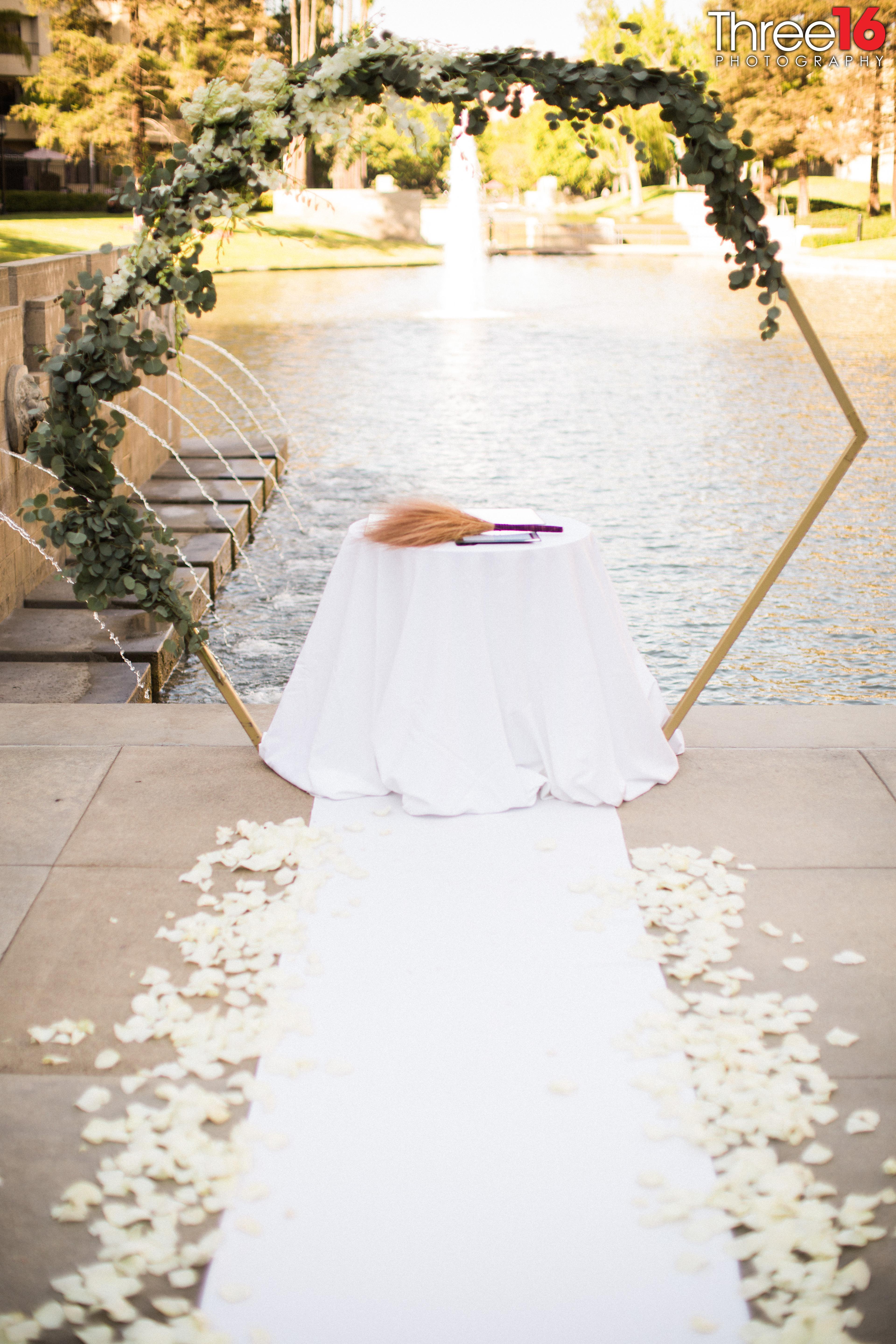 Lakeside ceremony space offers a breathtaking waterfront setting where your love story unfolds against the gentle sounds of flowing fountains and the natural beauty of towering palm trees. This serene outdoor venue features elegant stonework, decorative water features with ornate lion head fountains, and a picturesque bridge backdrop that creates the perfect romantic atmosphere.