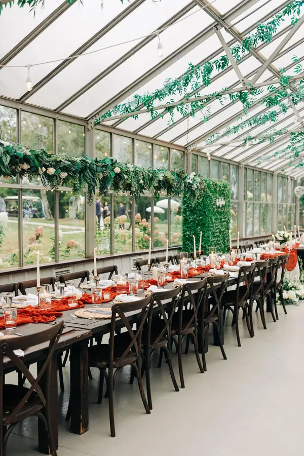 - Chandeliers - Fans in the summer, heaters in the winter - Bistro lighting (dimmable in the greenhouse) - Concrete floors - Tables and Chairs for up to 200 guests (farmhouse tables and resin x-back chairs at no additional cost.