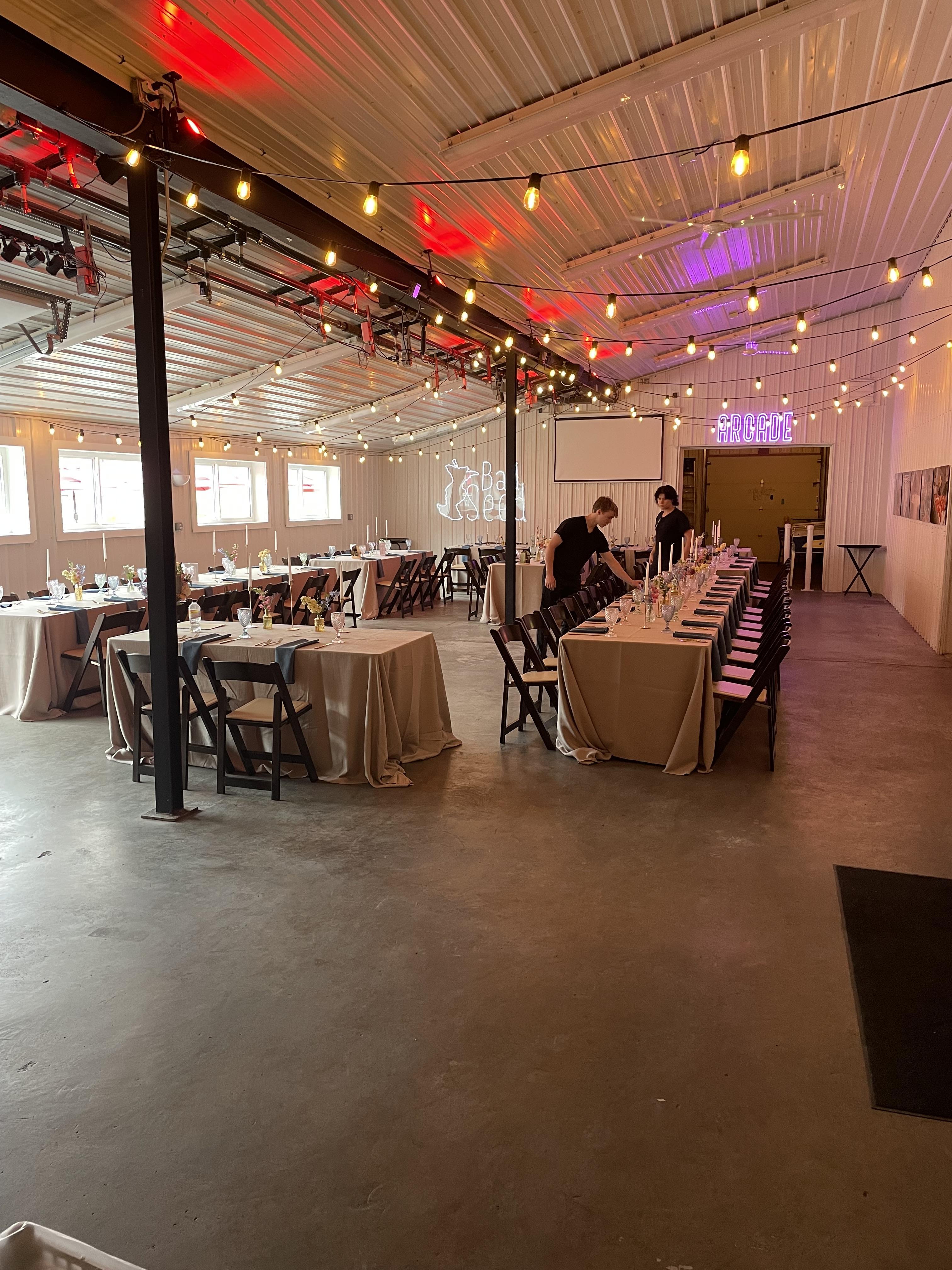 String lighting and colored uplighting, 200 amp electrical service, large stage for bands/DJ's, back up generator, potable water, bathrooms, heat and Air conditioning. We also include tables and chairs!
