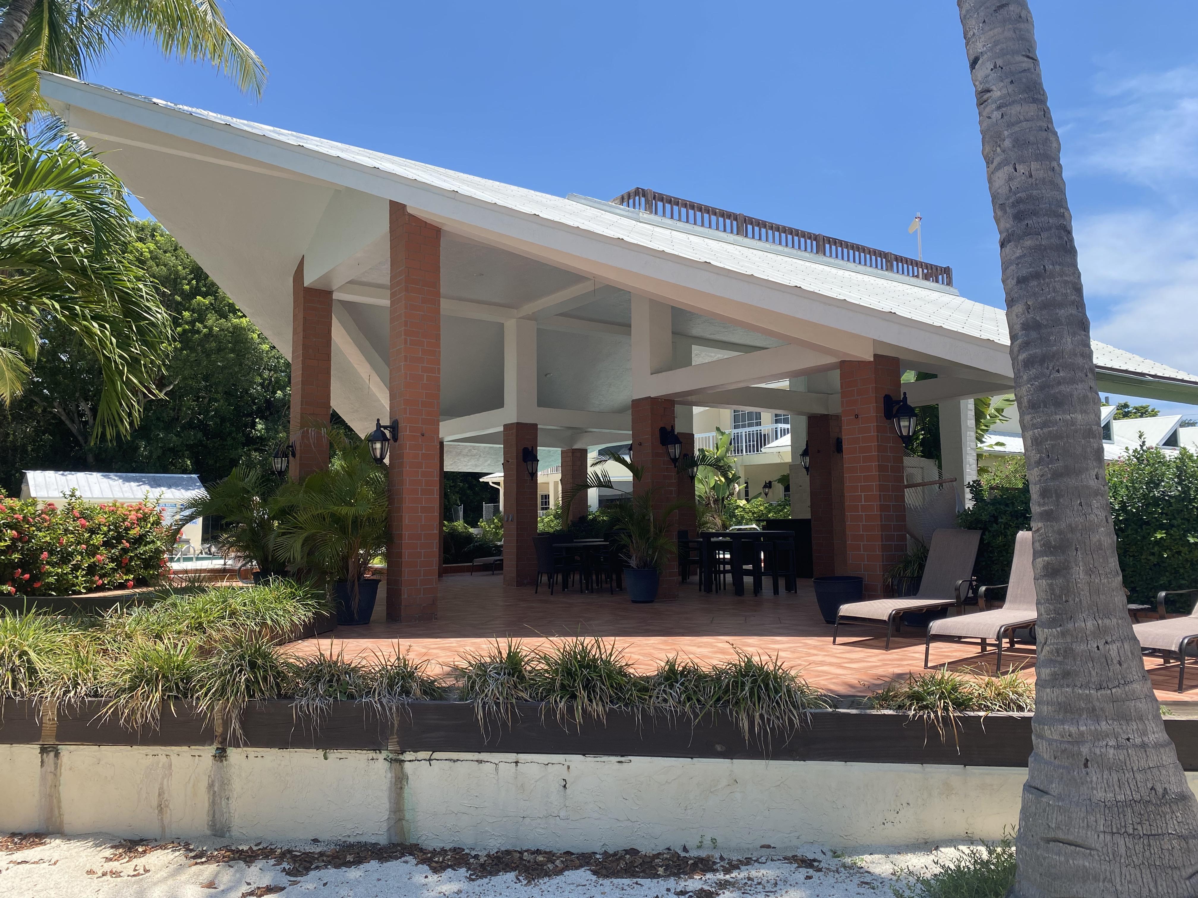 Our covered pavilion is located centrally in the backyard adjacent to the beach, pool and other buildings.