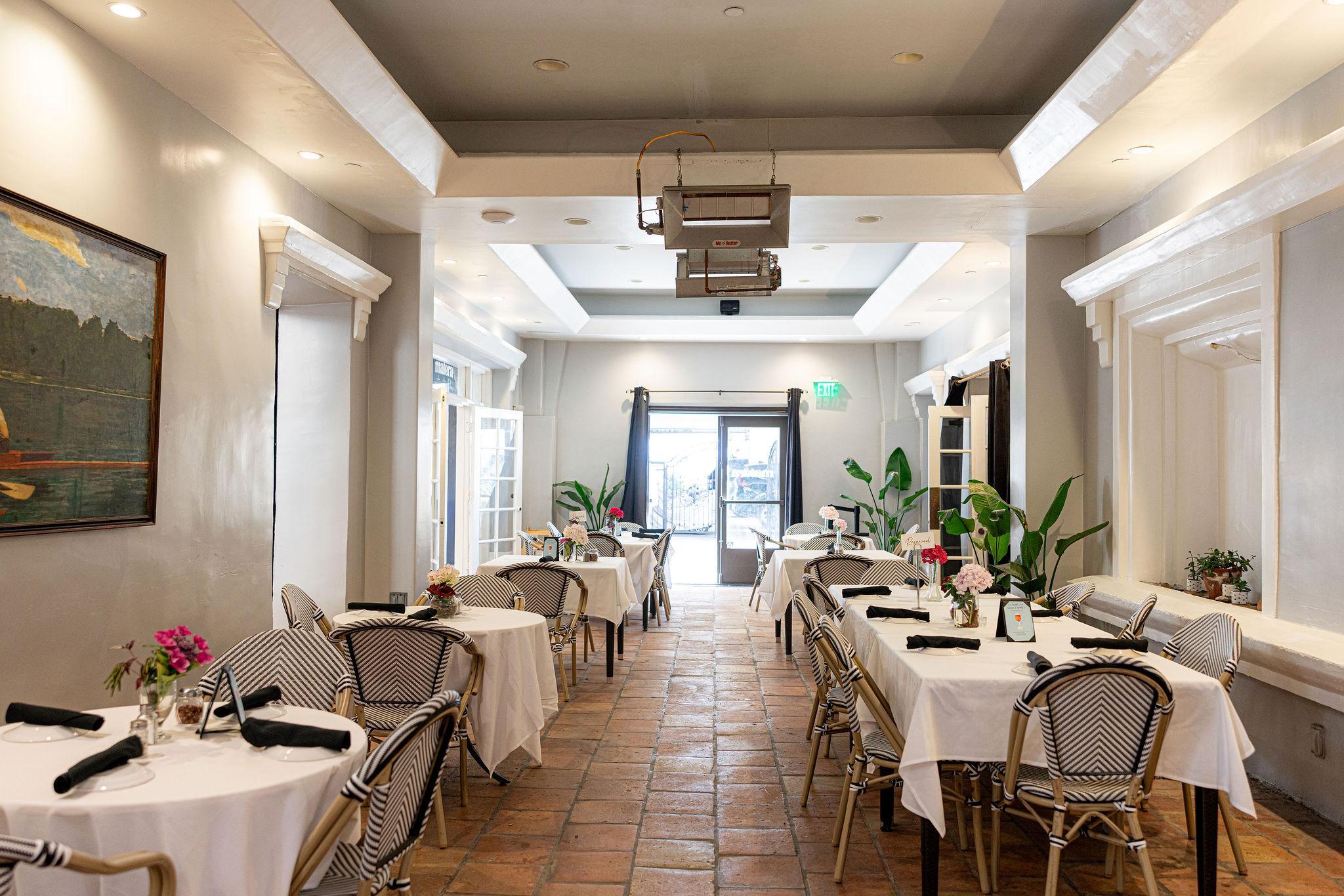 This 1800 square foot space features tile floors, a sound system, AC, and white French doors opening to a central courtyard and beautiful bar and dining area.