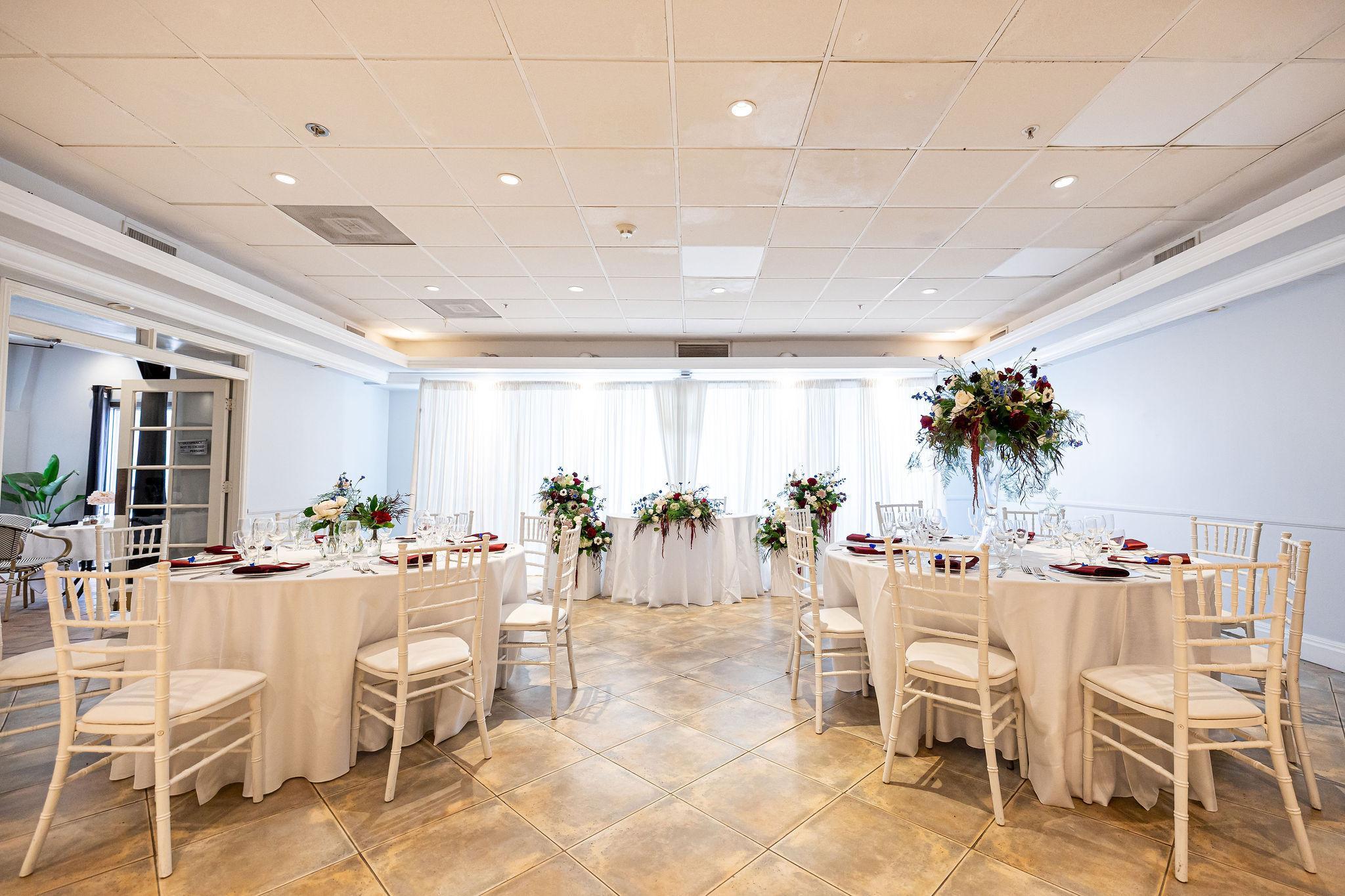 This 2,000 square foot space features Spanish tile floors, high ceilings, lighting with dimmers, white columns and arches, and an an ultra chic full service bar that can accommodate an additional 80 guests.