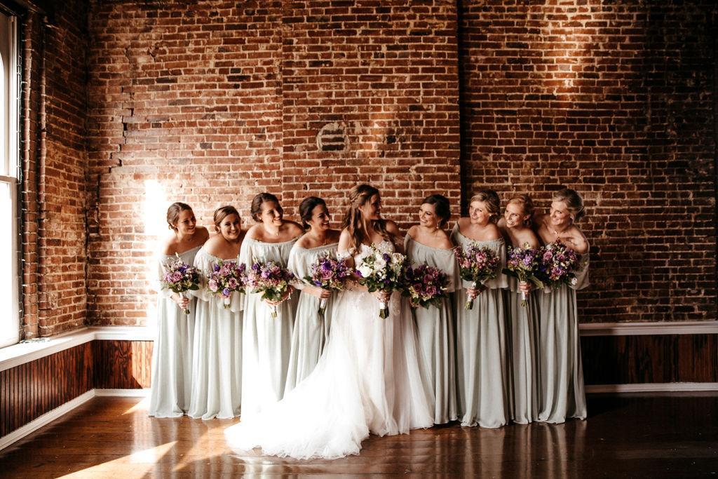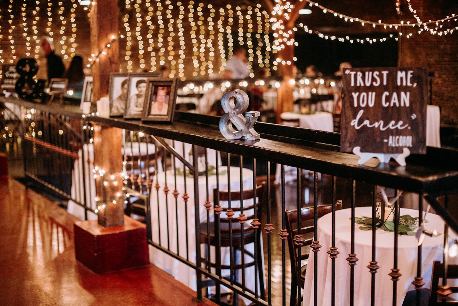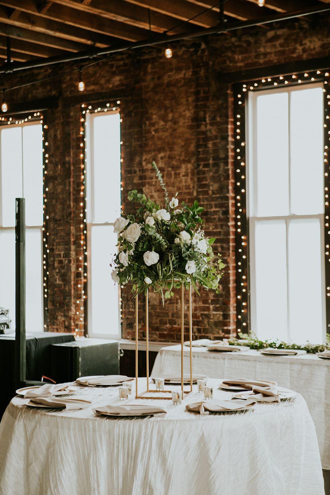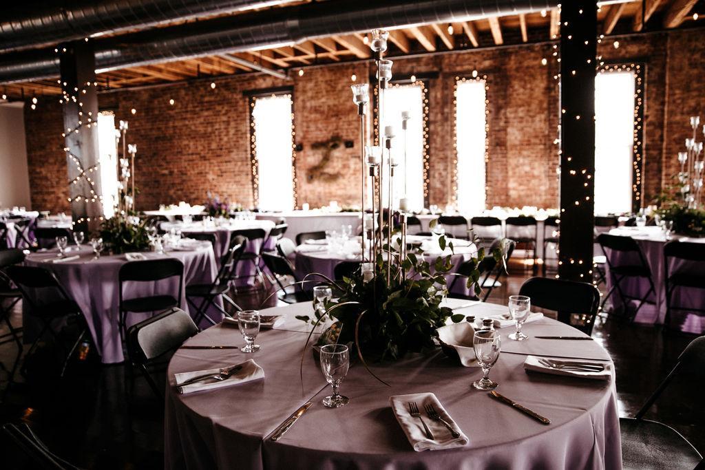 Exposed ceiling and brick walls, windows allowing tons of natural light to come through, string lights with Edison bulbs hung along the ceiling, string lights around each window and column, wood floors, and a separate room with a custom wooden bar. Ceremony-style seating or cocktail-style for up to 250 guests. Reception seating with a dance floor for up to 170 guests.