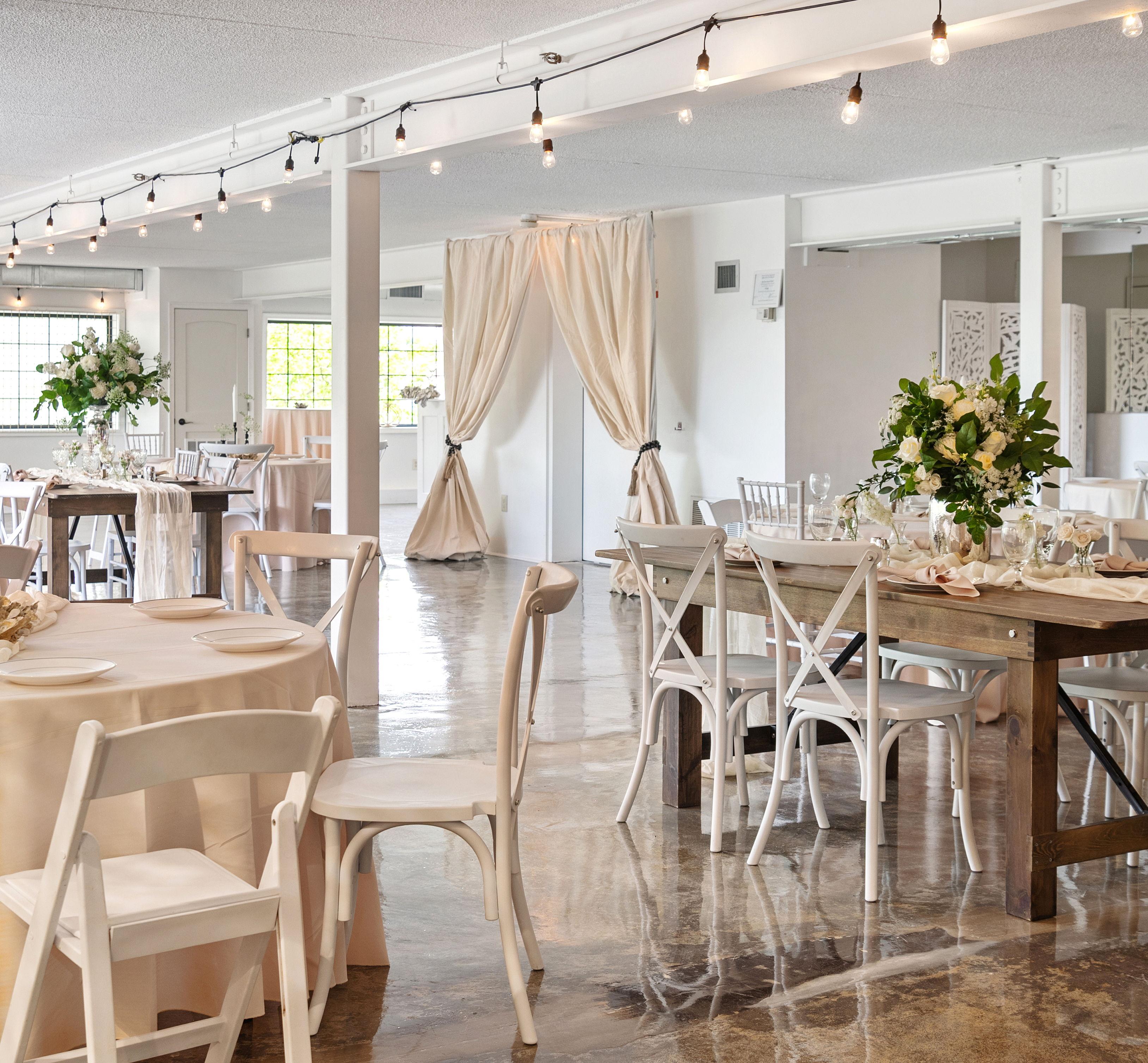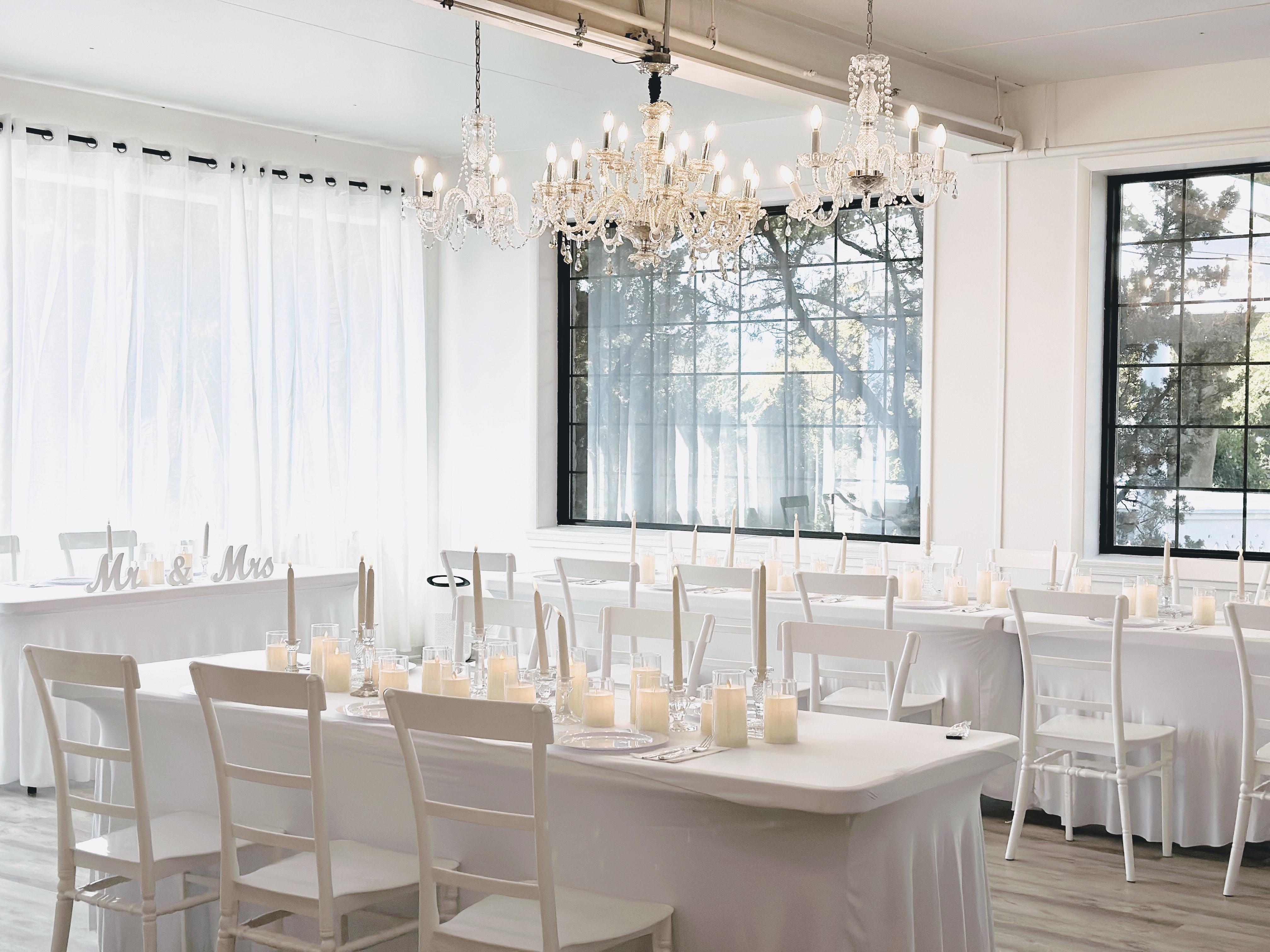Included in the Coastal 59 Venue: Industrial Charm – Black-trimmed windows with ample natural light. Scenic Views – Lush greenery in spring and summer, bay views in fall and winter. Warm Lighting – Café ceiling lights and black crystal chandeliers. Versatile Setup – Round tables and three rustic barn-style rectangle tables. Eclectic Seating – A stylish blend of white chairs. Elegant Bar Area – Sleek white bar. Private Bridal Suite On-site restrooms for guest comfort.