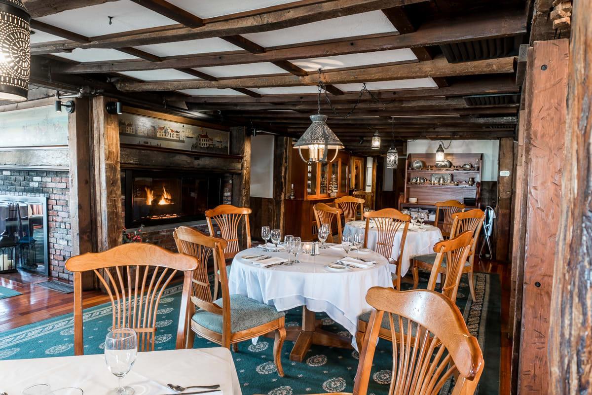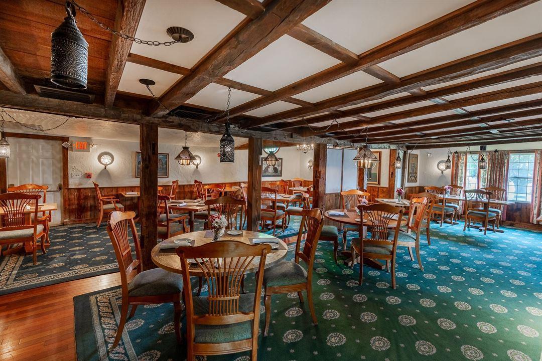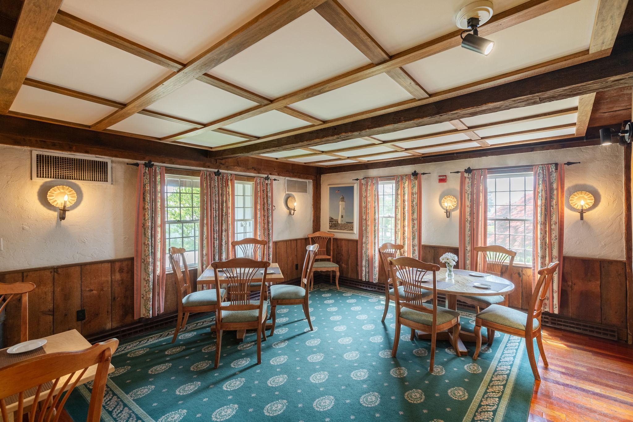 The New England room at Barker House is a beautiful, winsome space that captures traditional charm and elegance. This room, dating back to 1634, creates an inviting atmosphere ideal for any gathering, featuring large windows framed with traditional New England-style shutters and beams made from dark, rich wood that draw the eye upward. The wall color is warm and neutral, adding to the cozy appeal. When you visit, take a peek at this room's historic beauty. It's an absolute must-see!