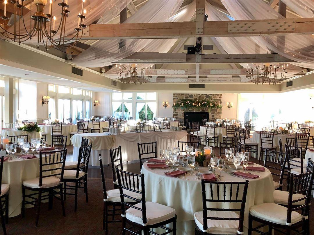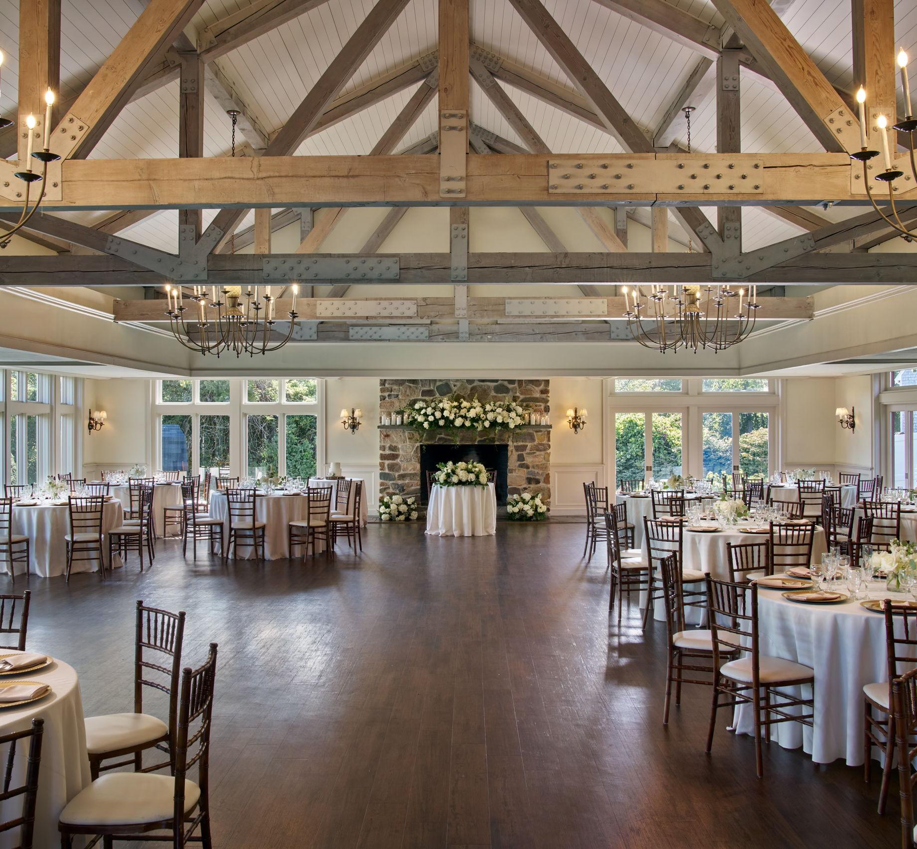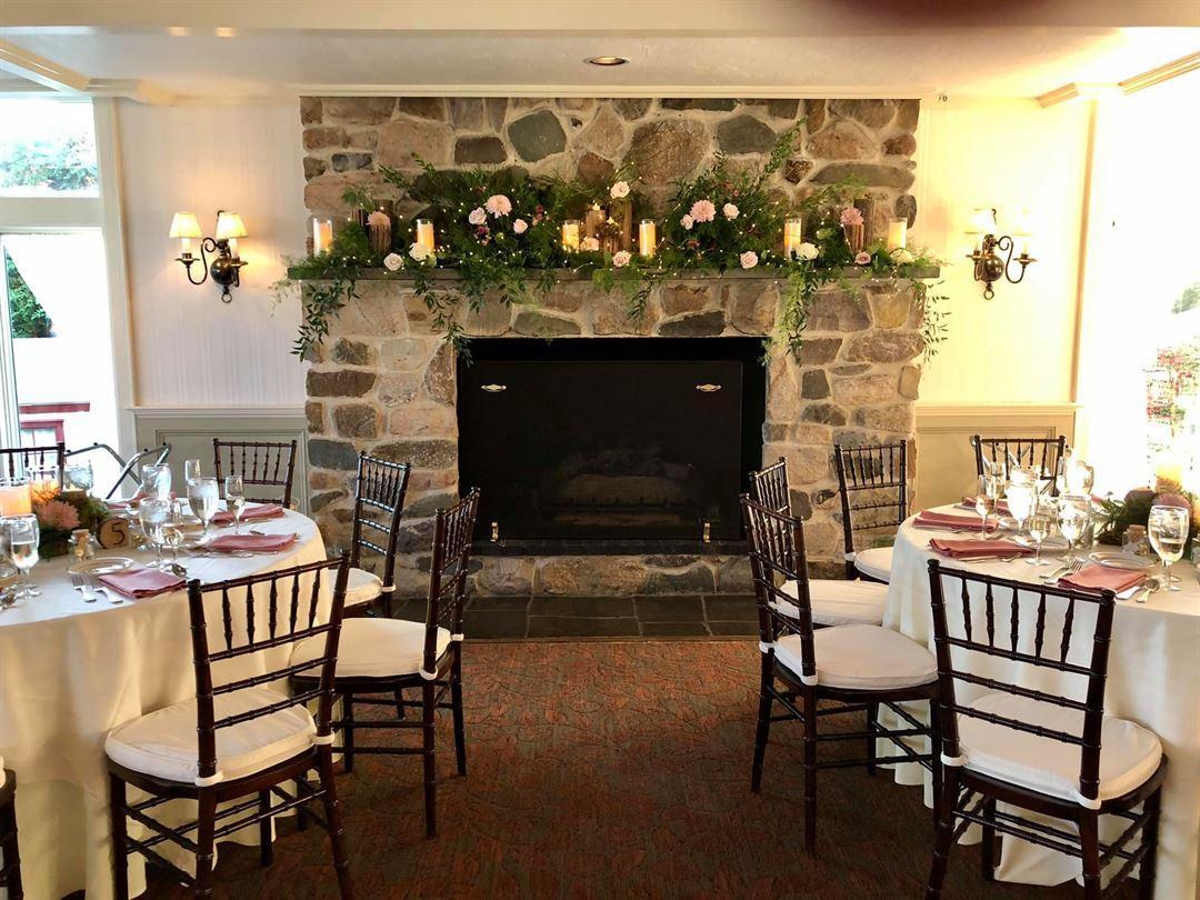 The Williams Room is a unique event space with beautiful architecture and stunning design elements. The room boasts elevated ceilings, oversized windows, and white wood rafters, creating a light and bright atmosphere for any special occasion. The room's focal point is the large stone hearth, which provides a warm and welcoming ambiance. The room also features a beautiful hardwood dance floor and wrought iron chandeliers, adding a touch of elegance to the space, great for any special occasion.