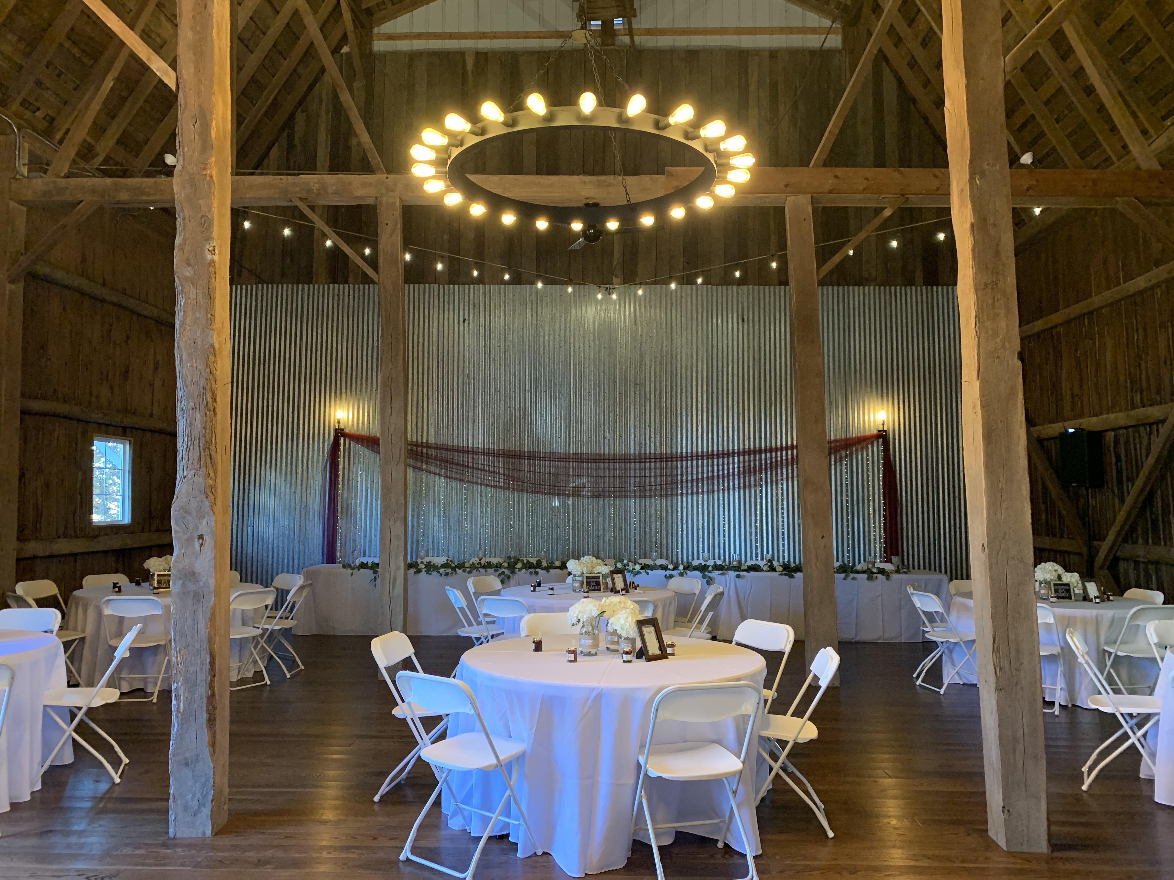 2 large Wagon Wheel Chandeliers on dimmers 1 crystal Chandelier on a dimmer Round 5' banquet tables with white to the floor linens Rectangle 8' tables for head table with white to the floor linens 2 bathrooms total with one being ADA compliant Open balcony to lower level Open staircase to lower level