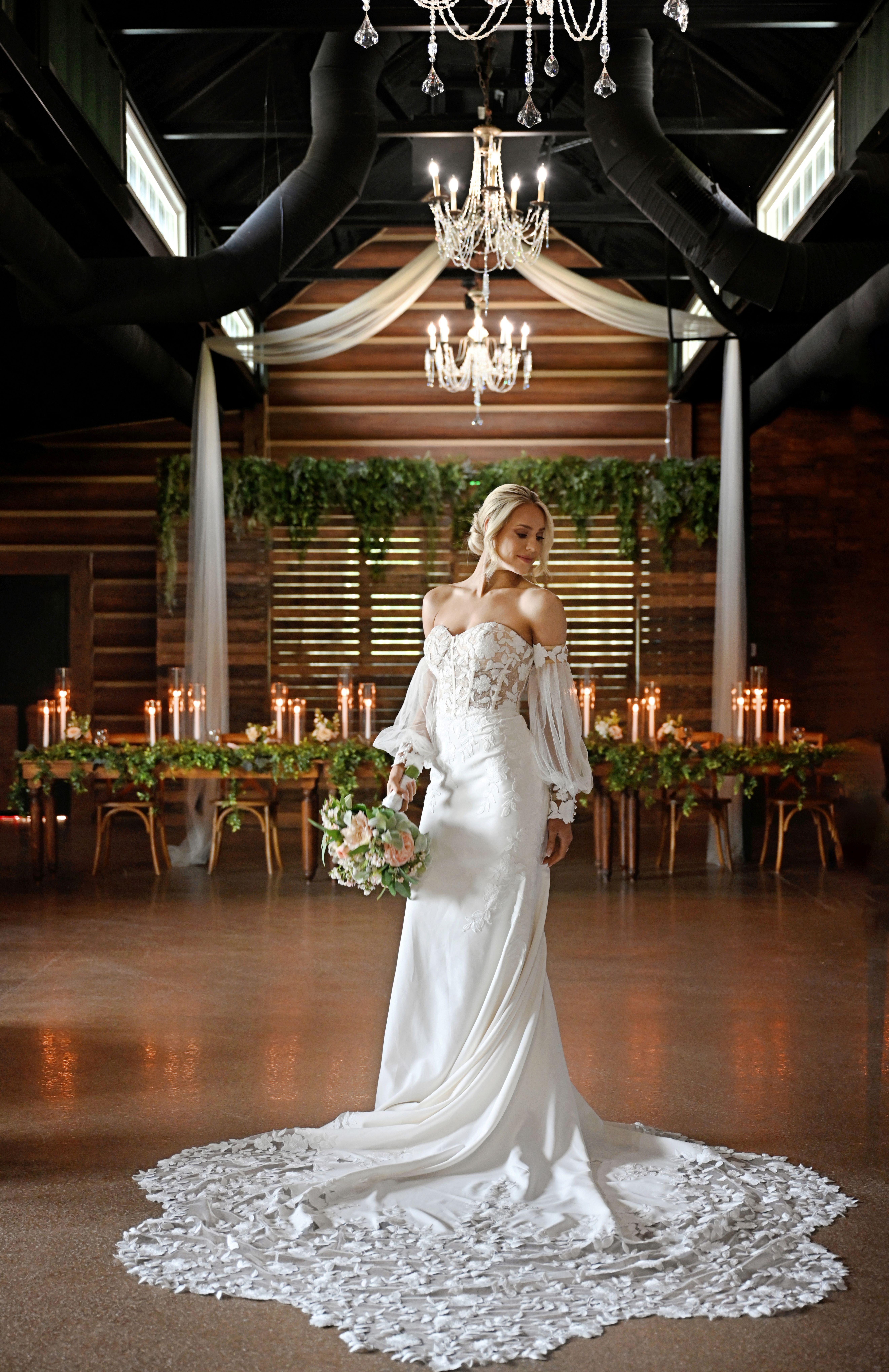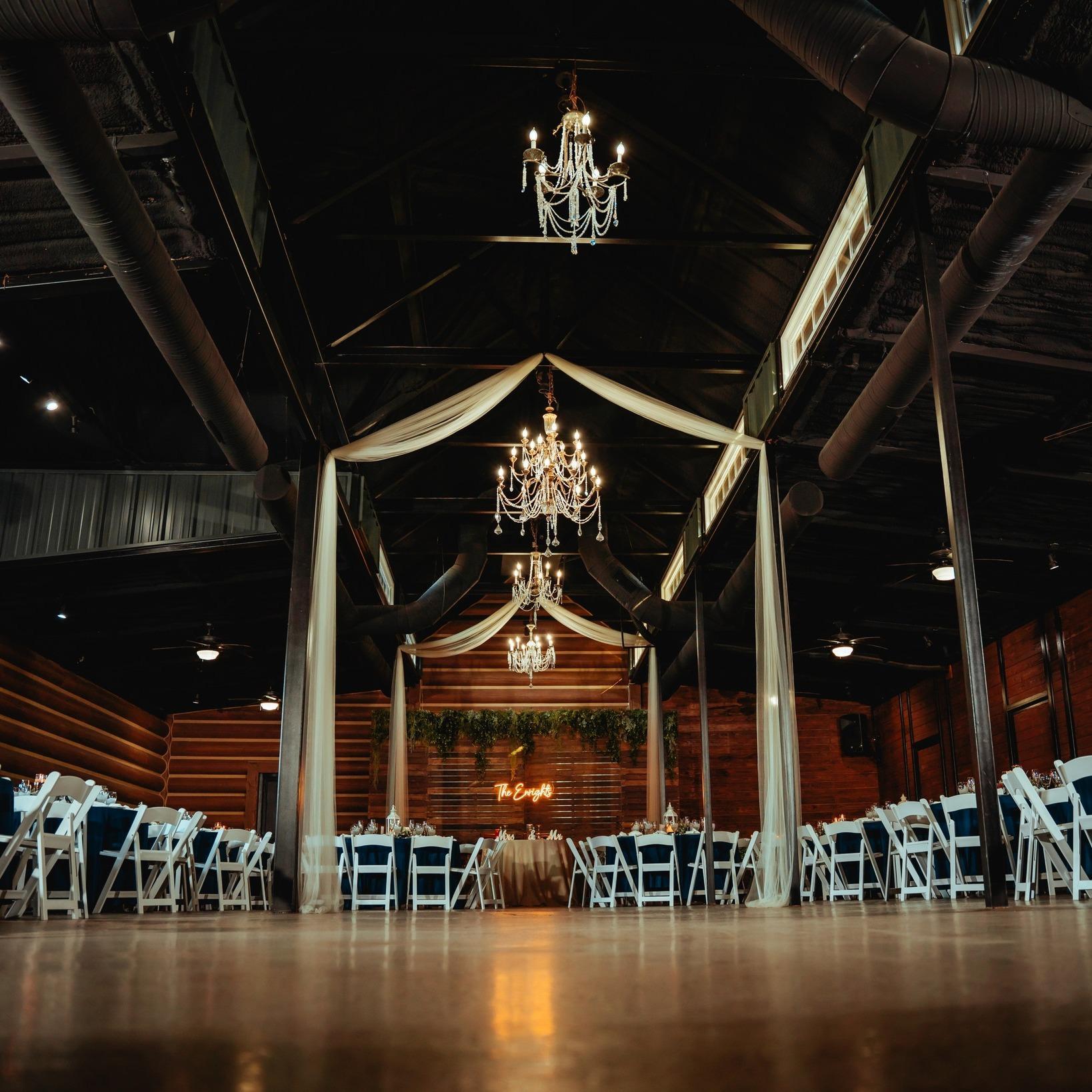 The reception hall at Barnett Estates is a stunning space that combines industrial elegance with country chic charm. Adorned with sparkling crystal chandeliers, the space exudes a timeless beauty that complements our industrial country chic aesthetic. Whether you’re planning a grand wedding reception or an intimate gathering, our reception hall offers the ideal setting to bring your vision to life.