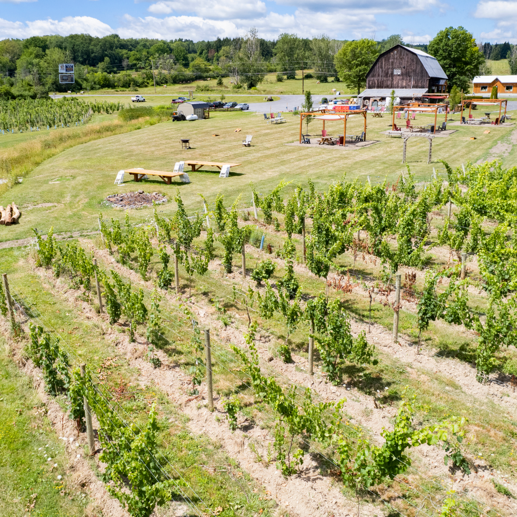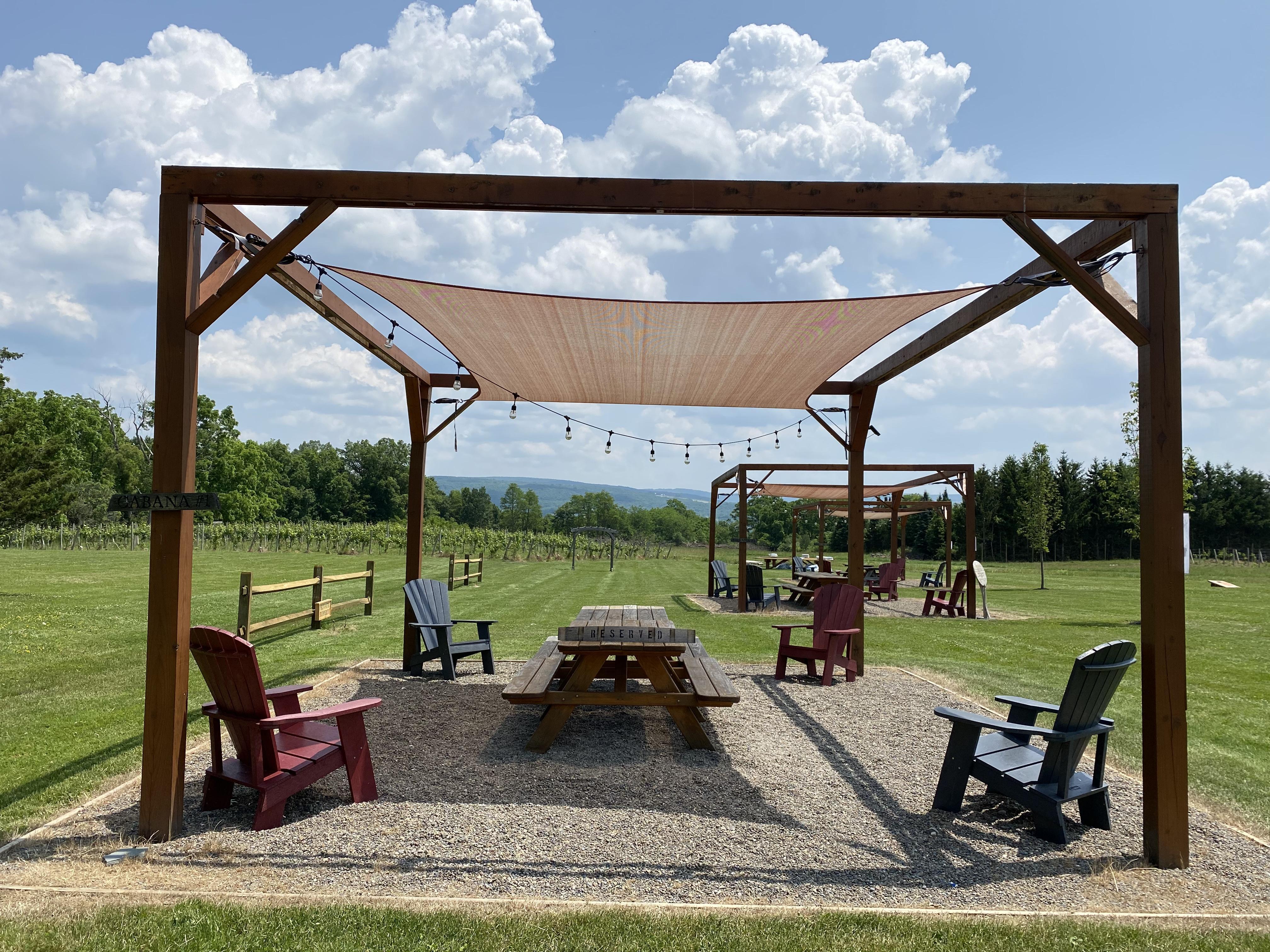 - Three built in cabana spaces that can be decorated and provide additional, more intimate seating. - A smaller tent for smaller guest counts/additional space to mingle. - Built in outdoor bar for full service drinks. Catering vendor experienced in setting up outdoors in this space as well. - Optional fire pits. -Built in, long, raw wood tables by our vineyard.
