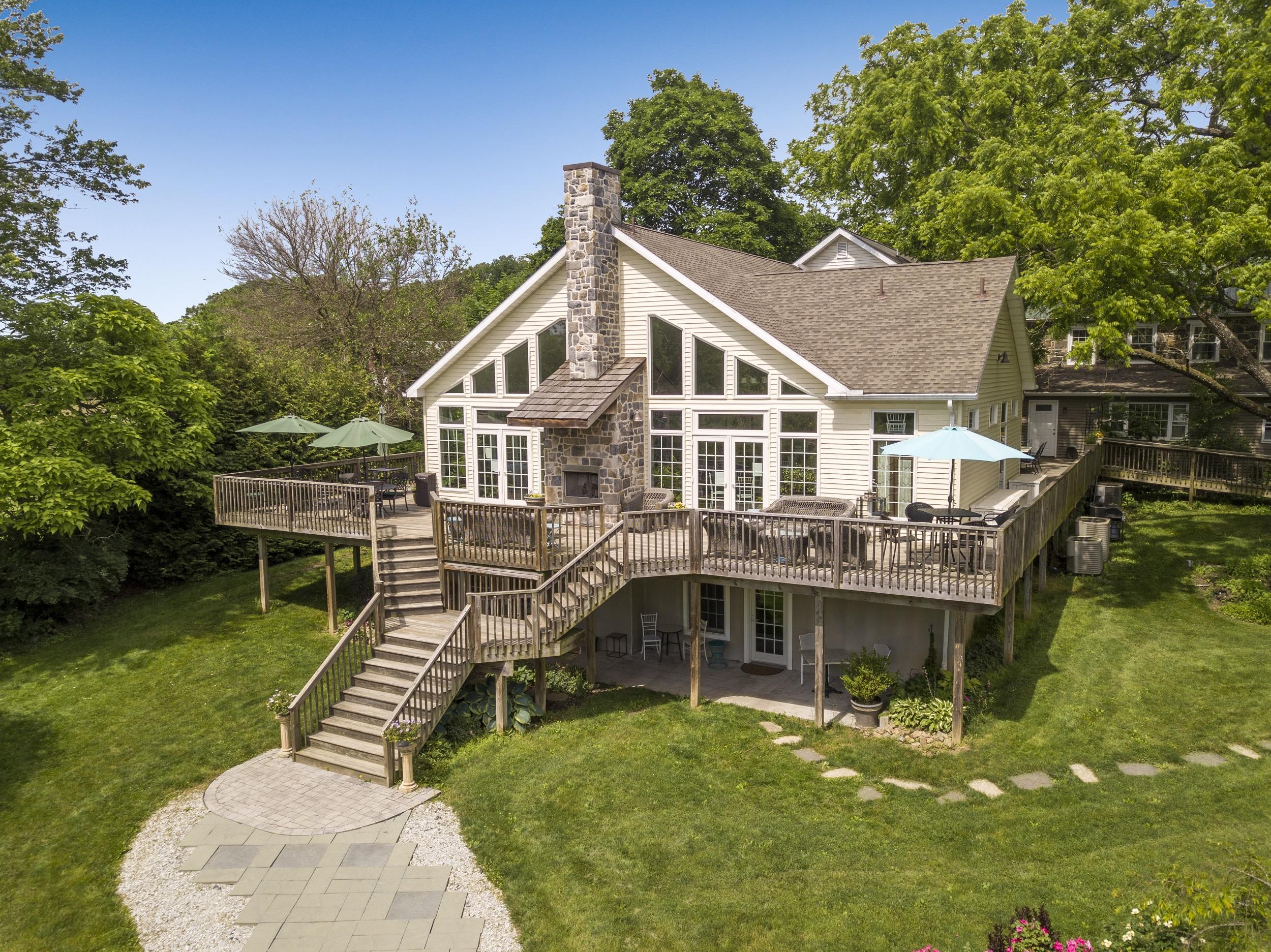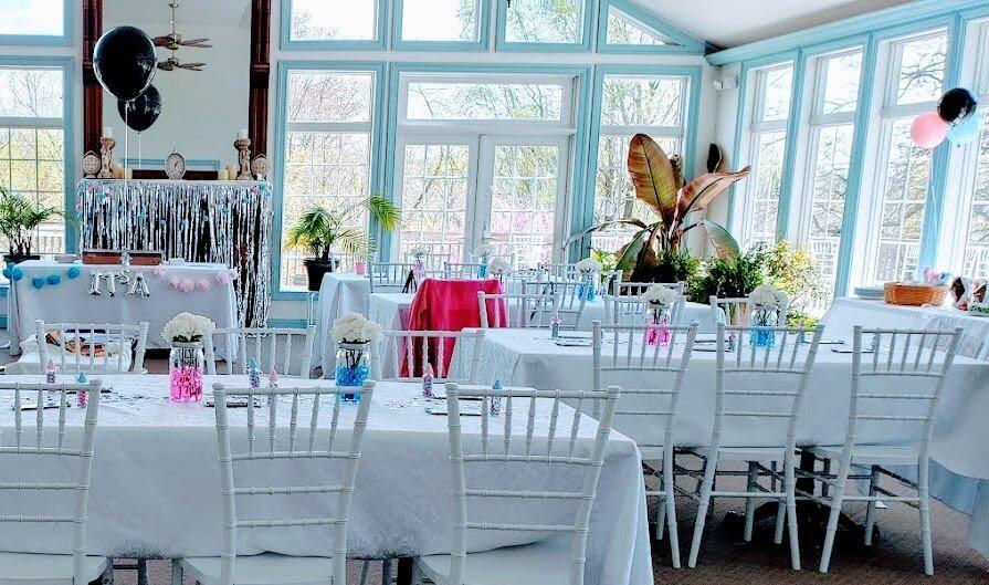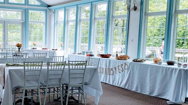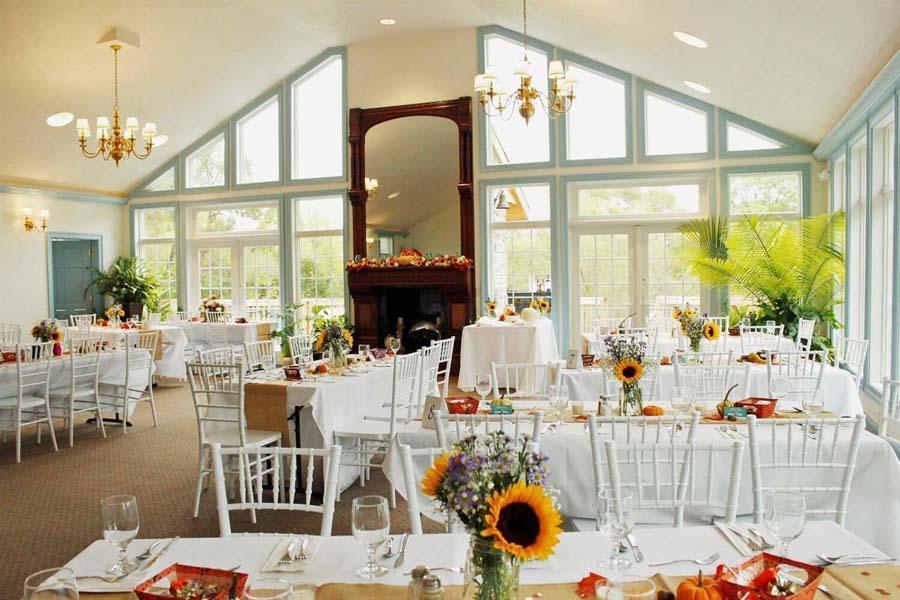 Cathedral Ceiling Antique Fireplace Chandeliers, Ceiling Fans, and Recessed Lights on Dimmers Walls of Windows overlooking gardens Wrap-around deck with umbrella tables and a gas fireplace Flexible table arrangements White Chiavari Chairs White or Ivory Tablecloths 2 ADA-compliant, modern restrooms