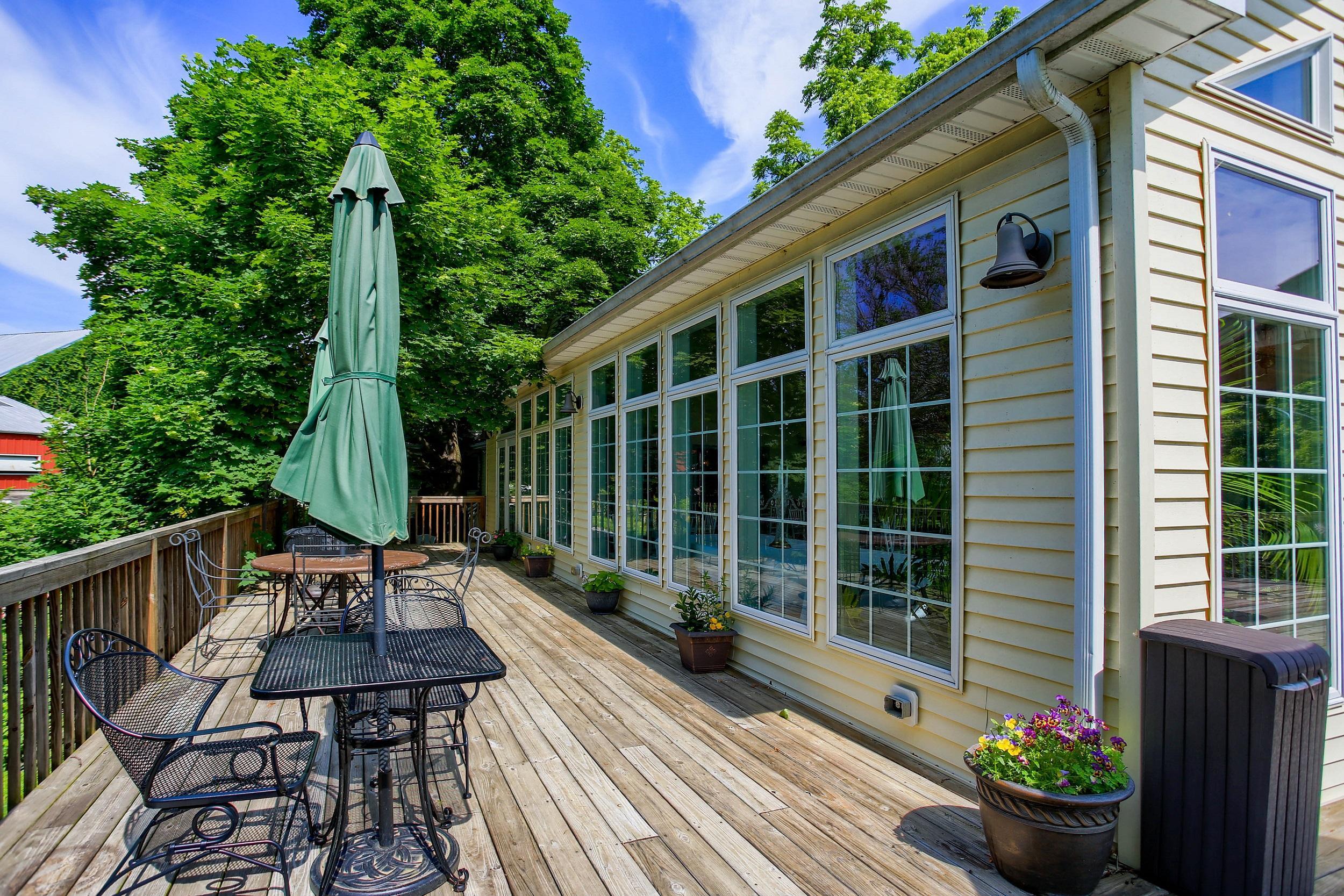 Our indoor Solarium venue is an airy, light-filled room with a cathedral ceiling that can accommodate weddings and events up to 79 guests. This is an all-season venue that will delight your guests no matter the weather. The Solarium has a spacious wrap-around deck so your event can be both inside and outside in good weather. The Solarium is part of the Farmhouse building which includes ten bed and breakfast guest rooms, keeping you & your guests warm in cozy for winter weddings.