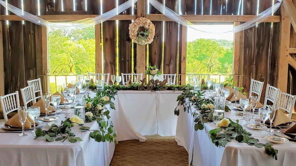 The Historic Barn sparkles with string lights which make the warm 200 year-old wood glow. The space seats up to 140 with room for a dance floor & buffet. There's a DJ loft above two modern ADA-compliant restrooms. The Tack Room guest room is underneath the barn, with easy access for the couple to sneak away for a private moment during the party and french doors onto the horse corral. The large barn doors open to overlook sunsets on the pasture.