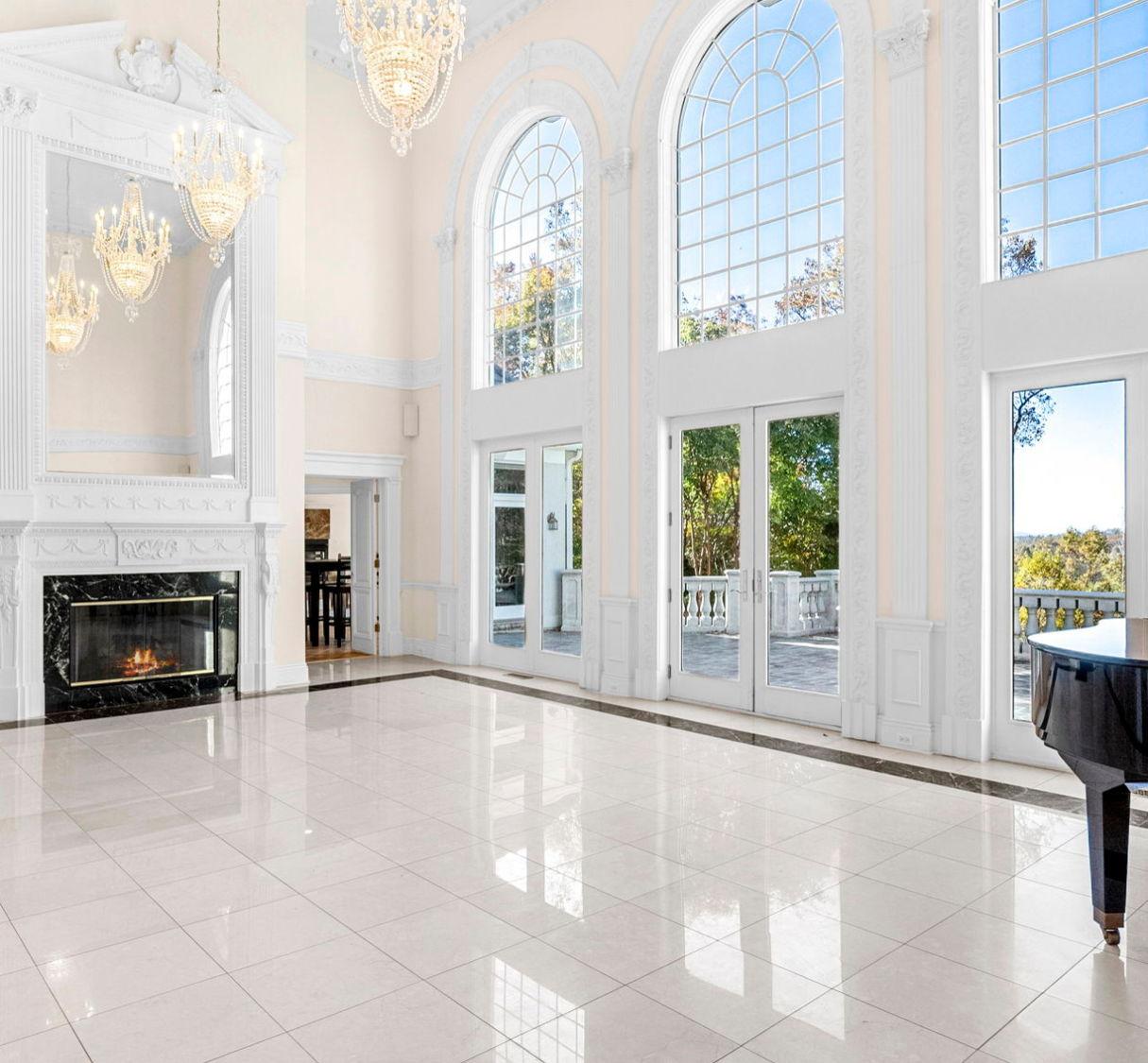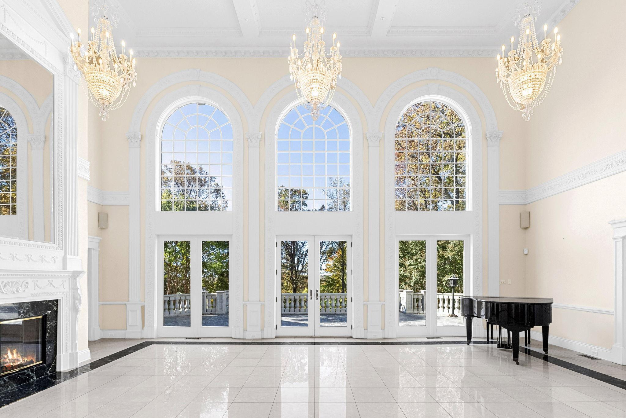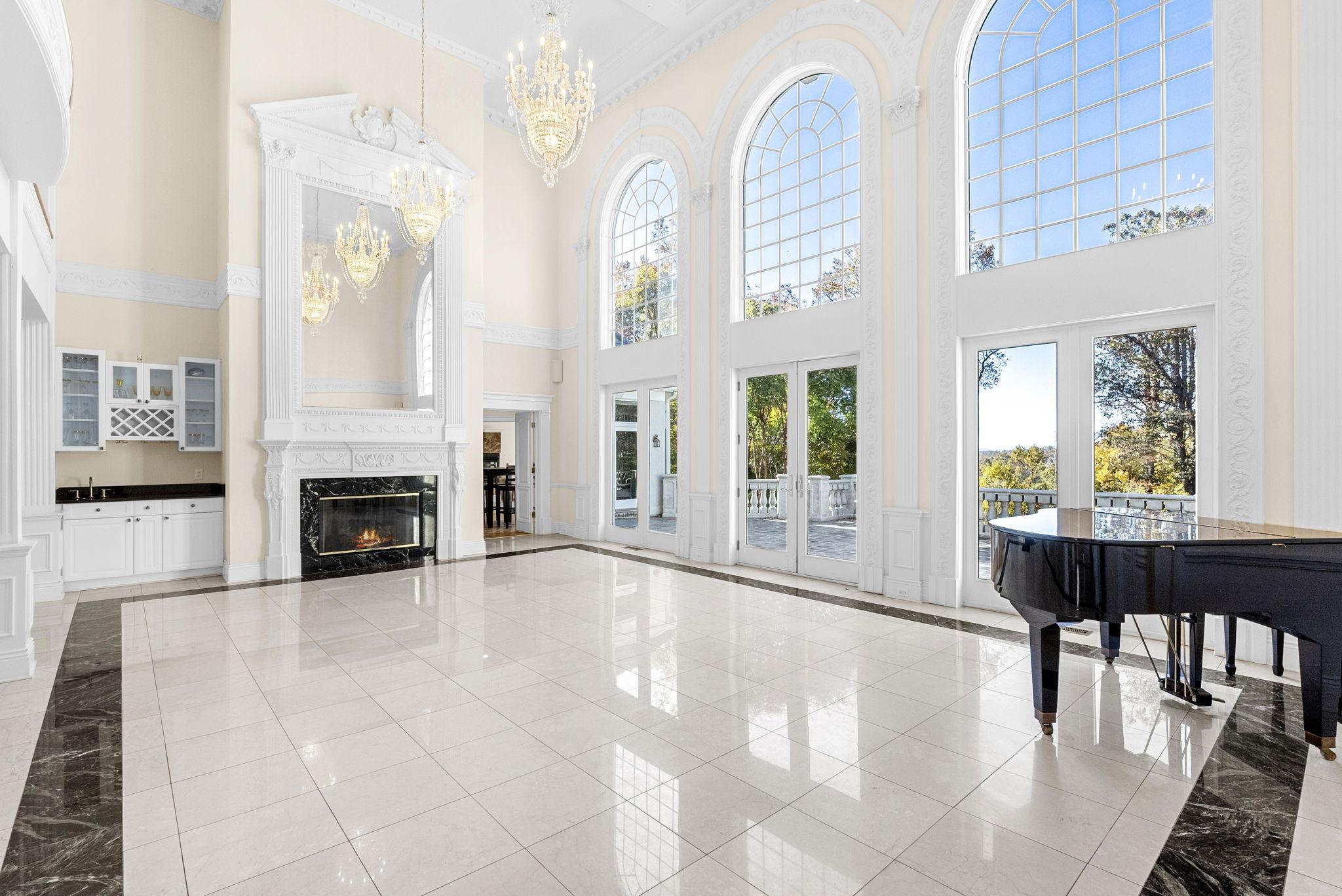 Located in the heart of the home, this area boasts soaring ceilings, crystal chandeliers, and expansive windows that flood the room with natural light. With direct access to the patio, guests can comfortably float from a luxurious space to the outdoor area where the views and lush landscape will become the star.