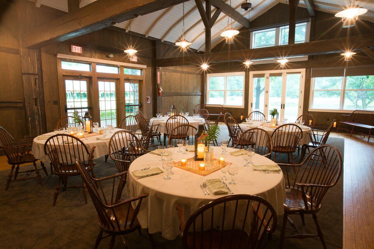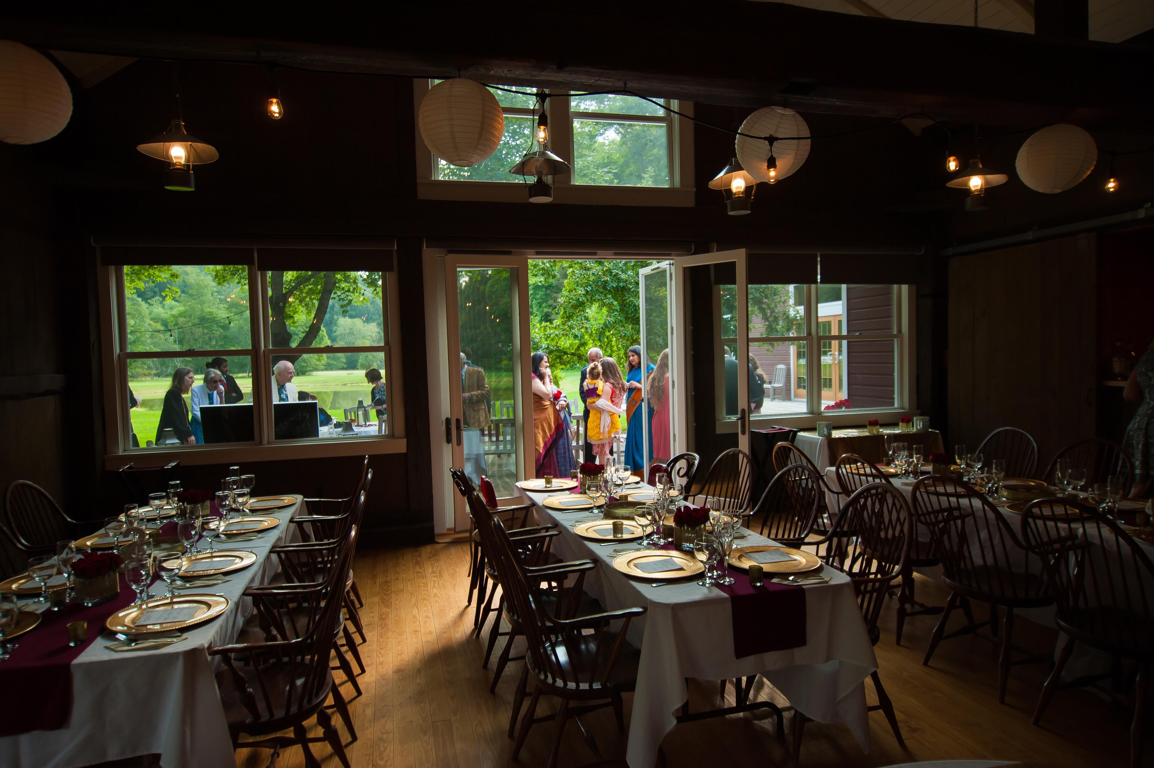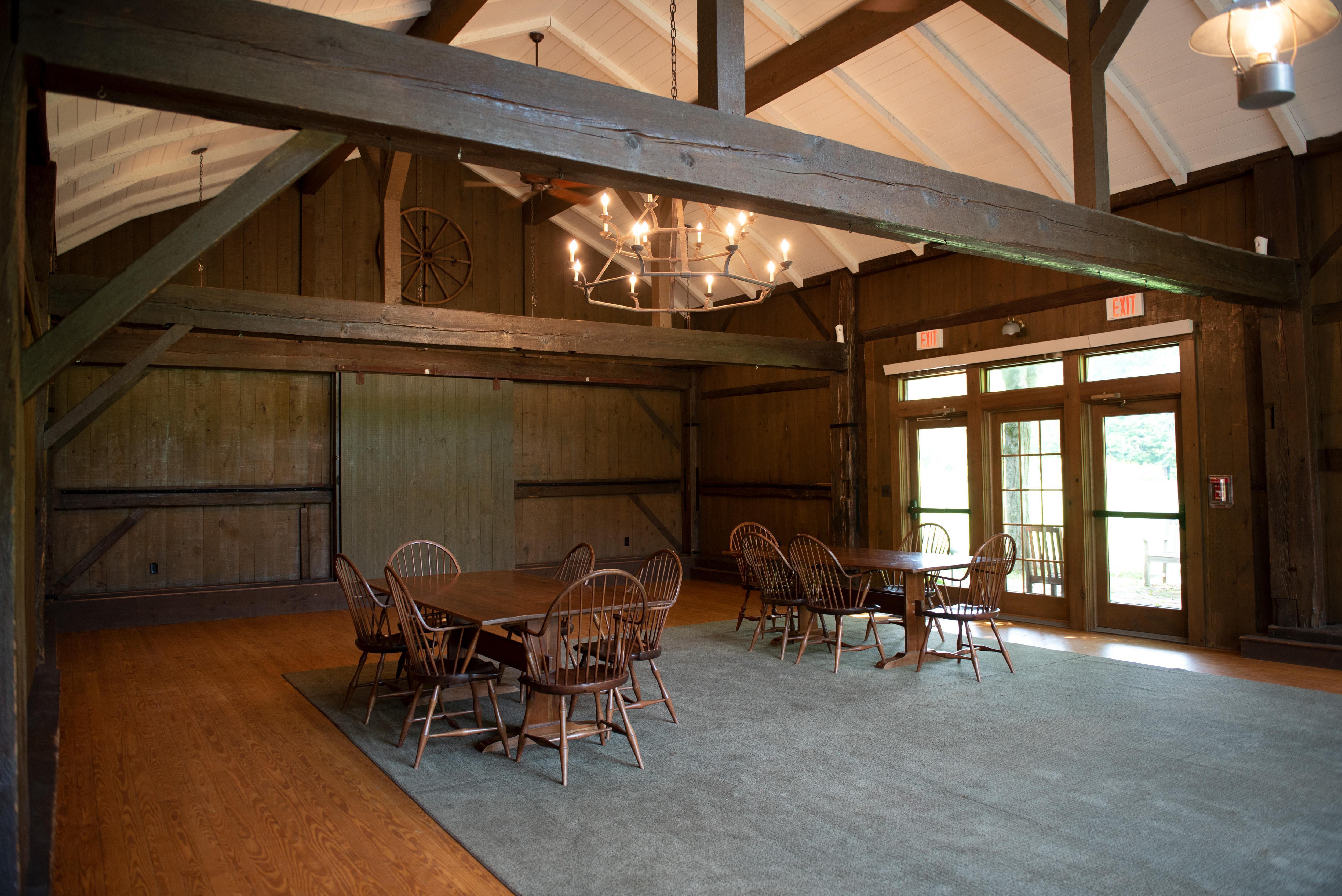 Our spacious barn, located in our Clubhouse right next to the pond, is the ideal setting for a small indoor ceremony or a lively, late-night after party. Open the doors and enjoy the patio with views of the pond and meadow.