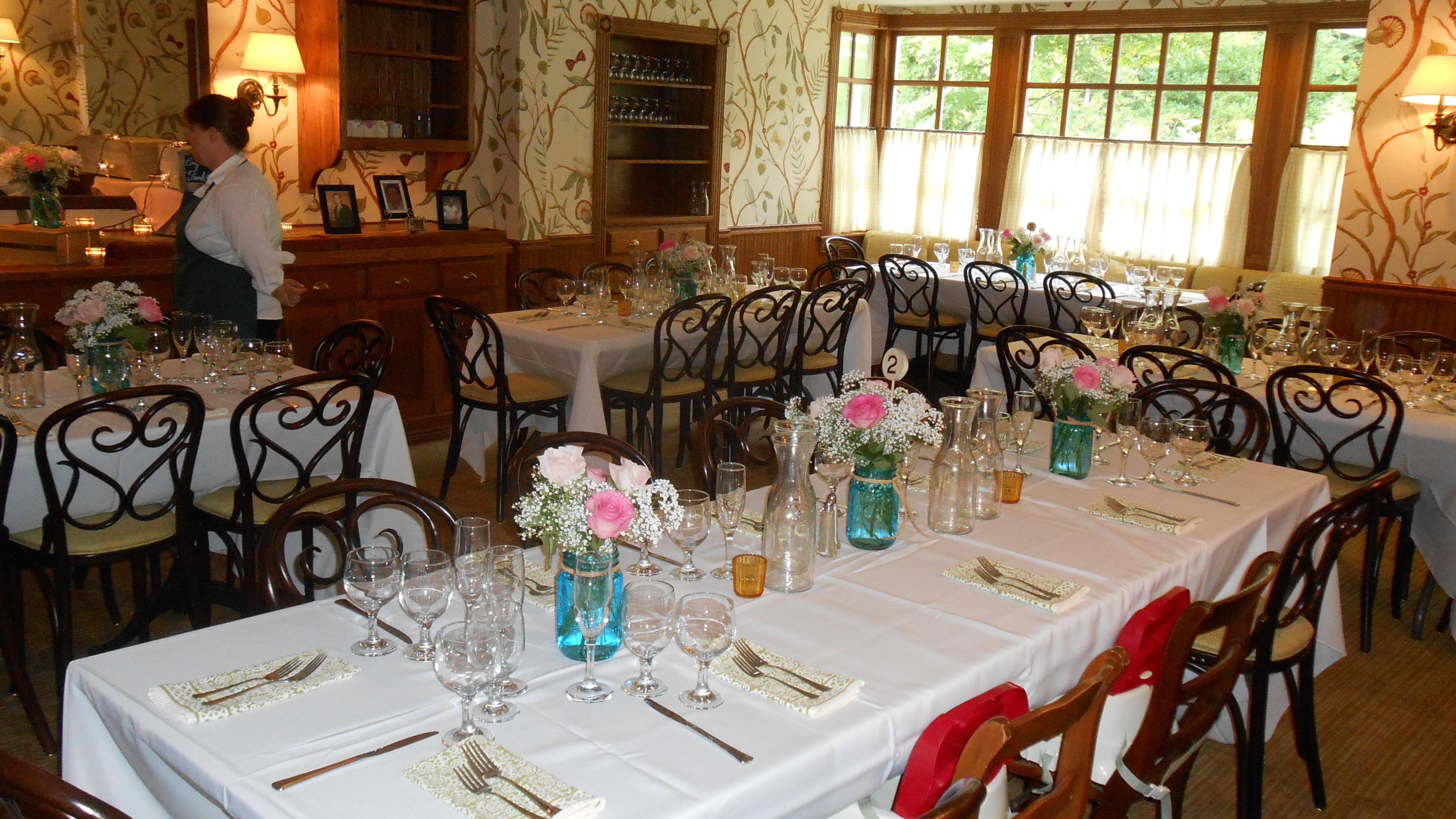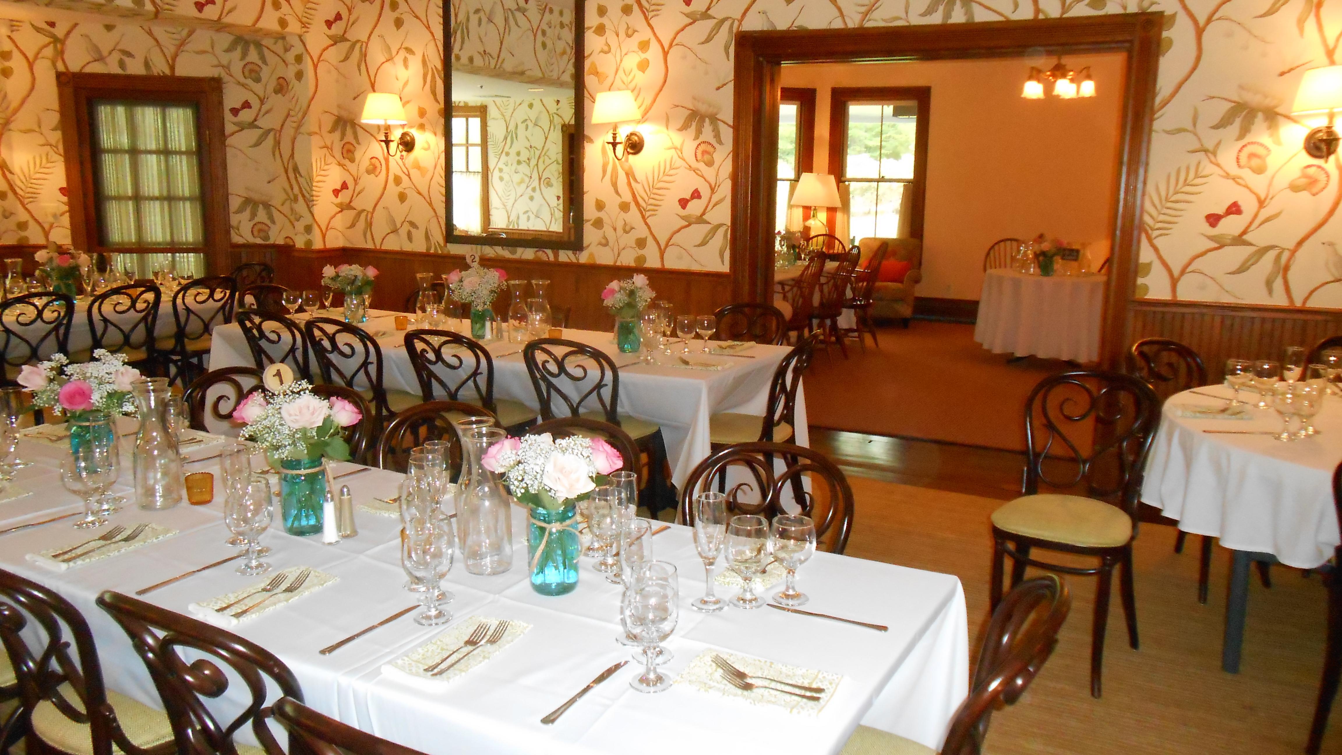 Perfect for indoor dining, our living room and dining room offer a warm country setting for your special meal. Separated by original pocket doors, the rooms can accommodate up to 75 guests. Plan your reception or farewell breakfast in our cozy main floor rooms.