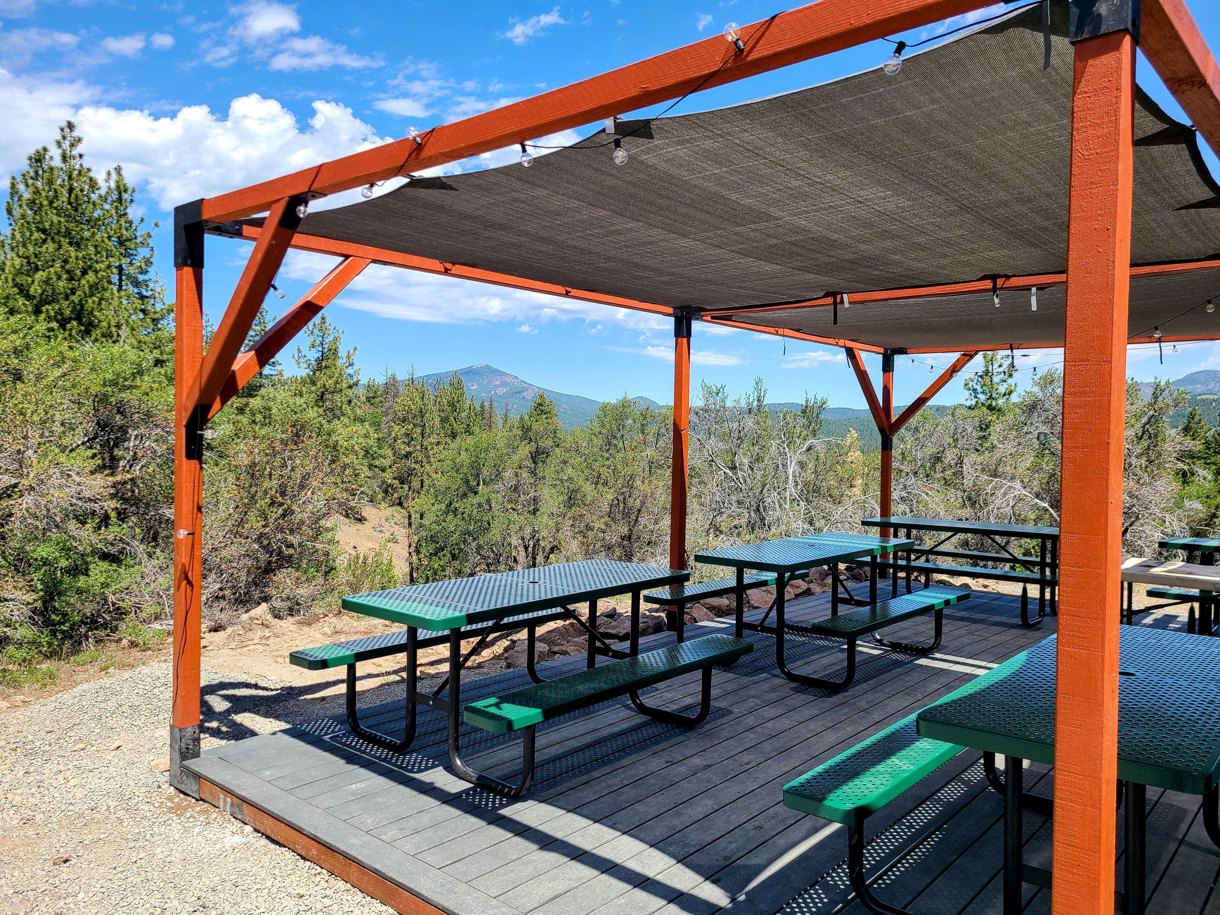 A space for an intimate ceremony or a catered dinner, this is a deck with optional sun shades, nighttime-lighting, and a view of peaks in either direction.