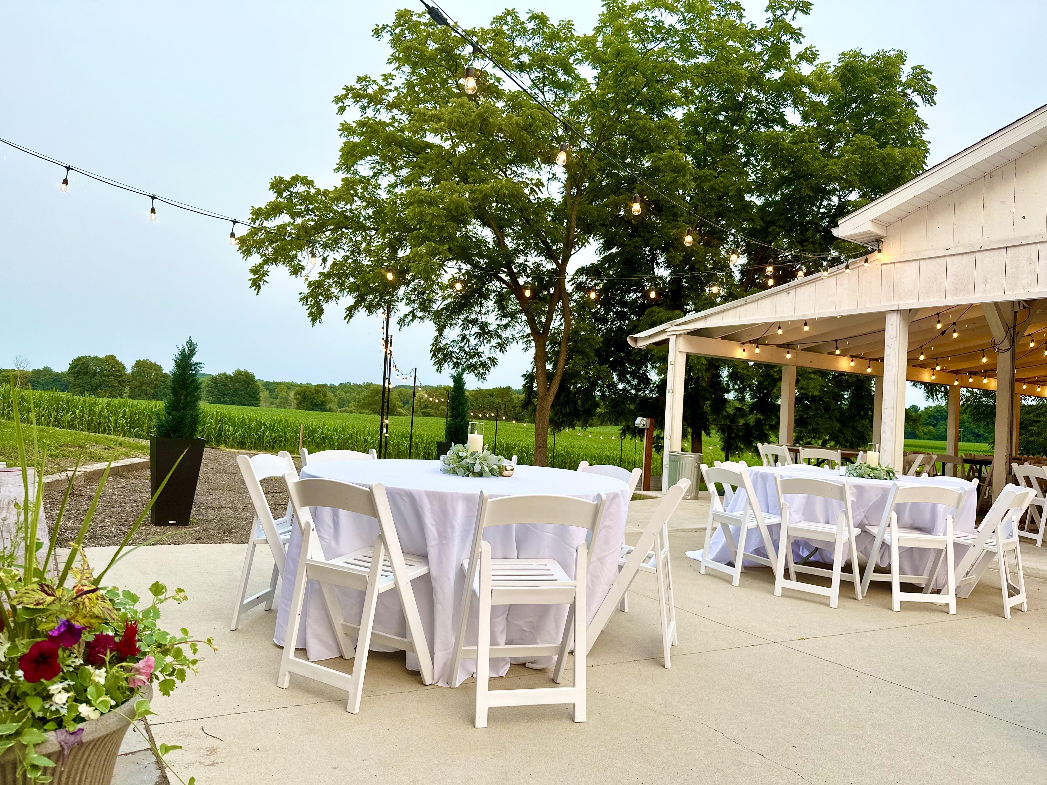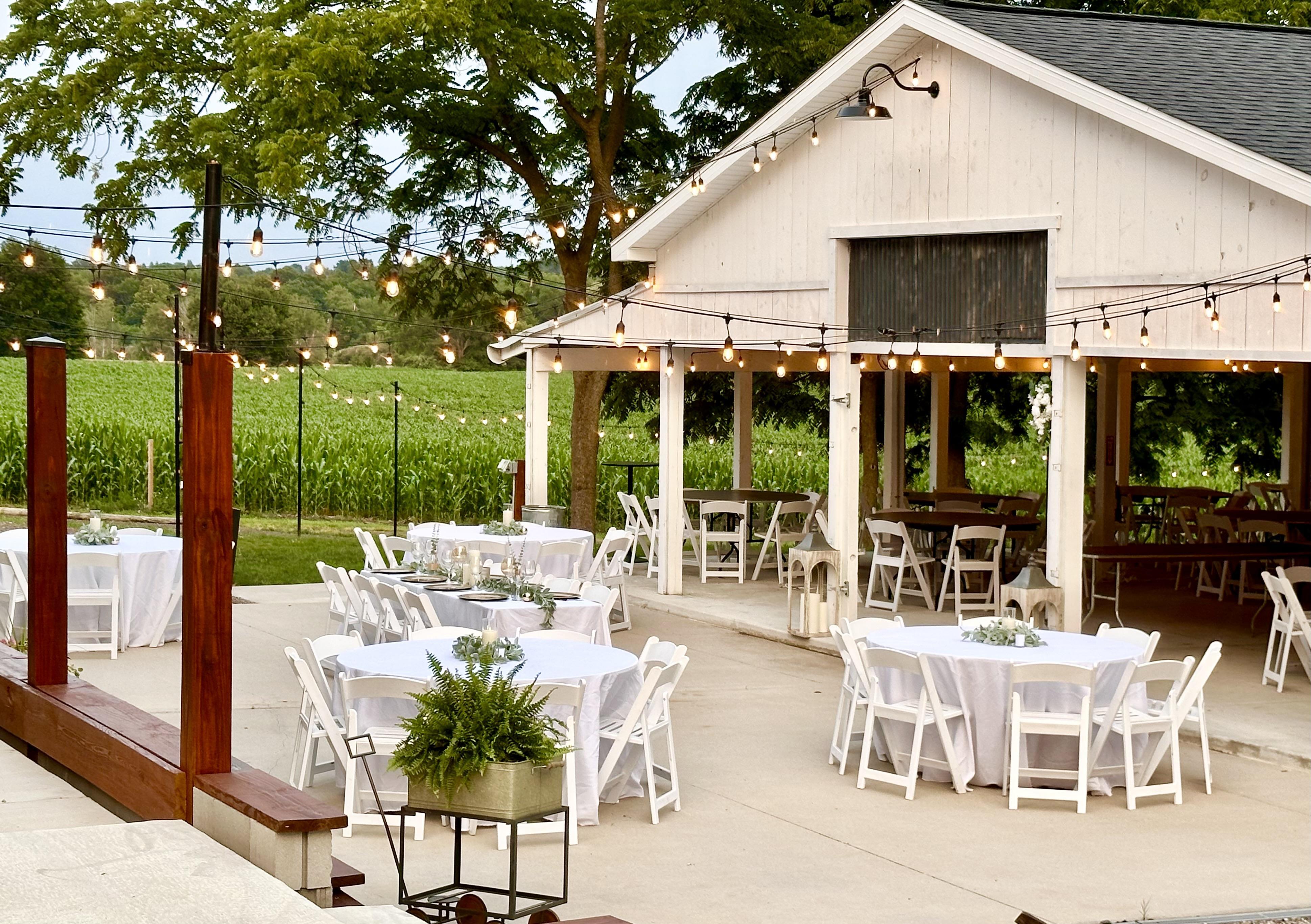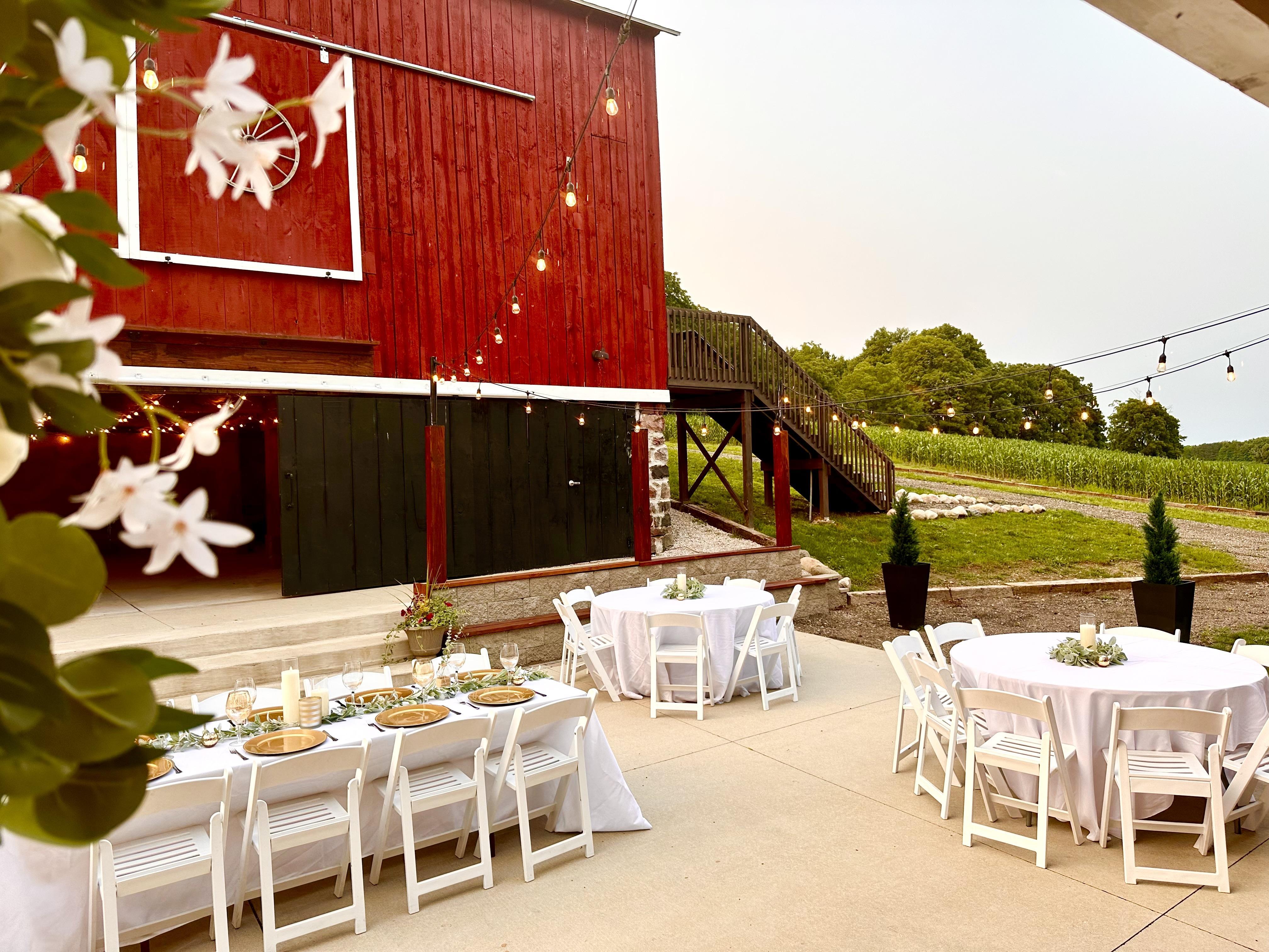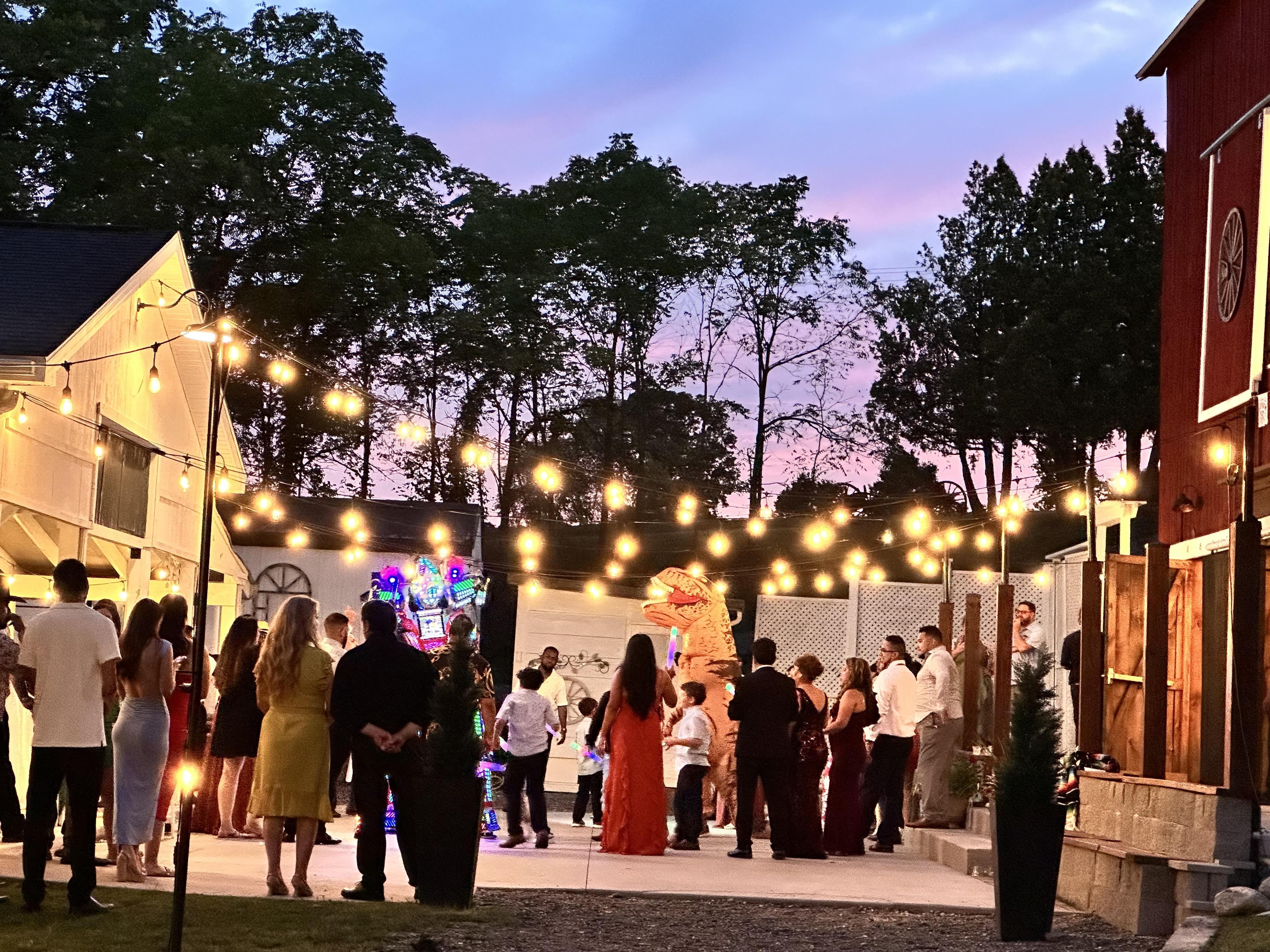 The space between the White Capel Pavilion and lower level barn is a space for mingling, dancing, and celebrating! First dances happen on this patio for a gorgeous shot of the couple dancing under the chandelier visible above their heads from the main level of the barn!