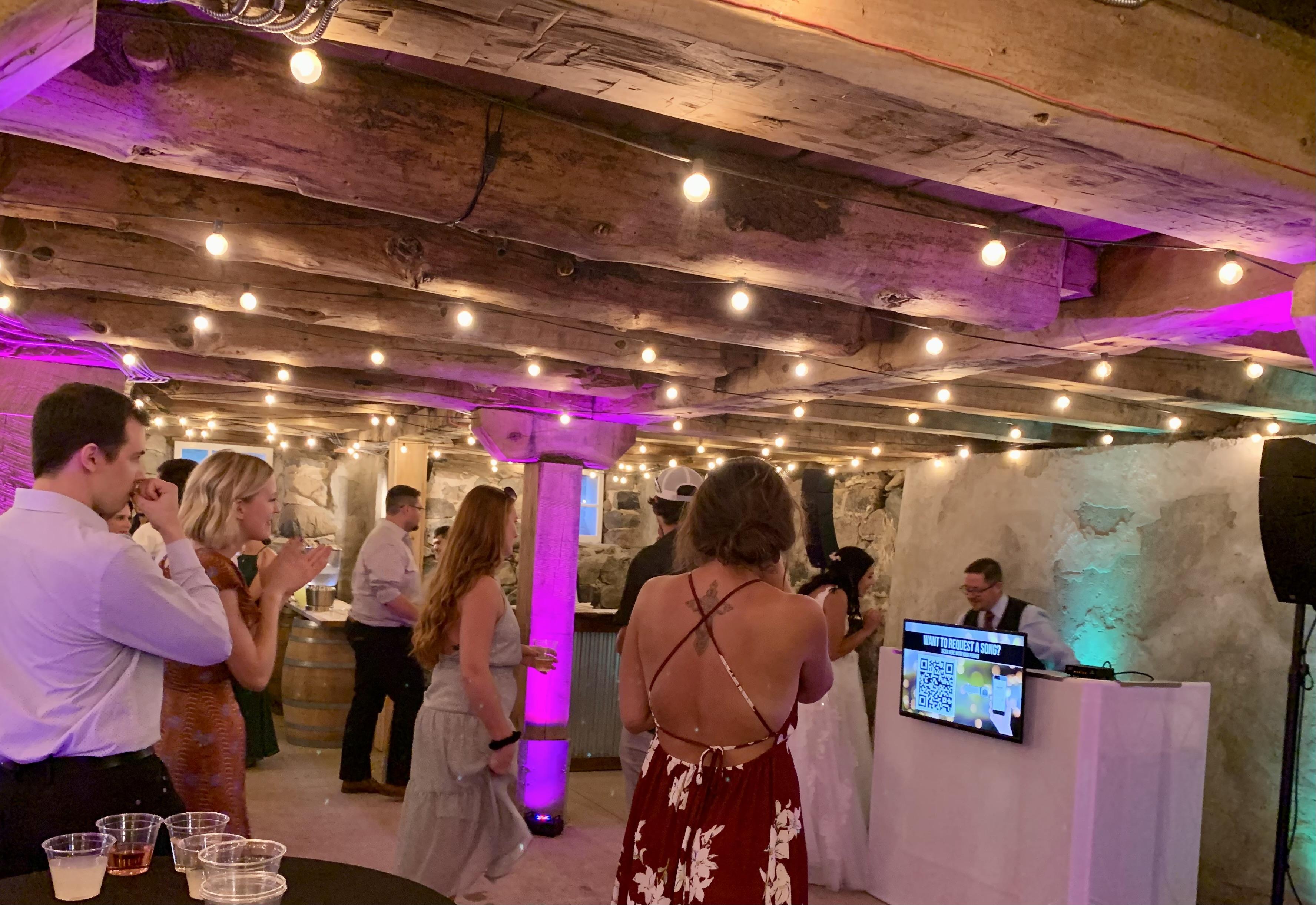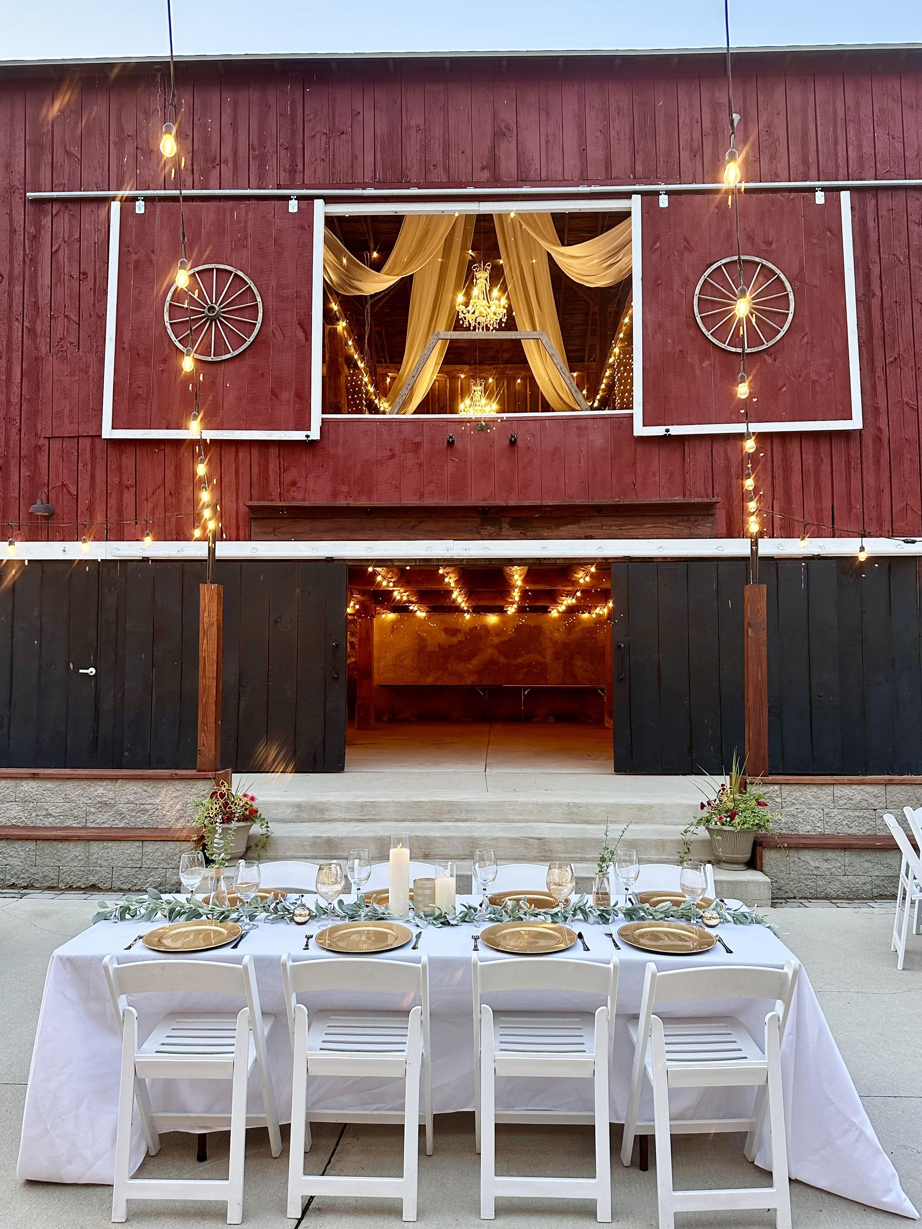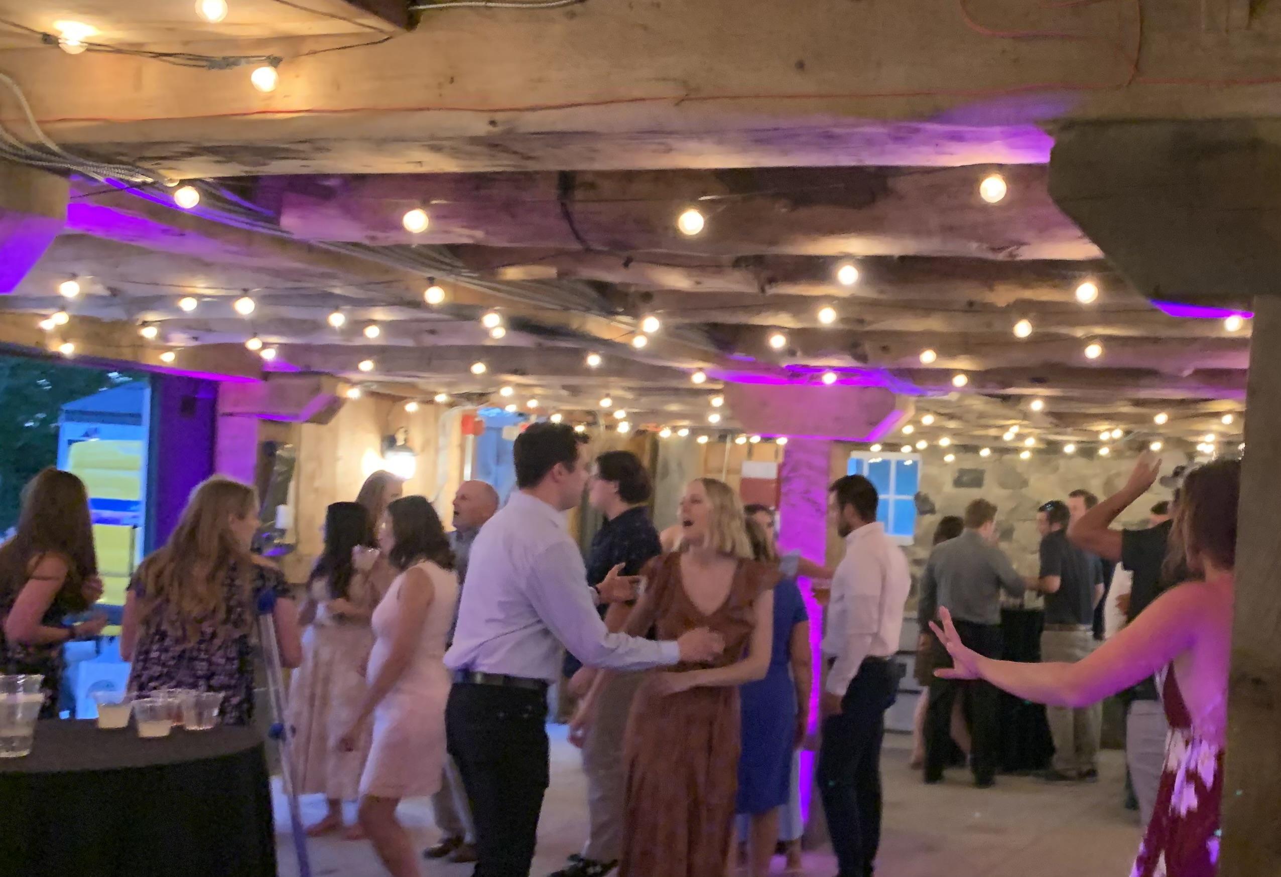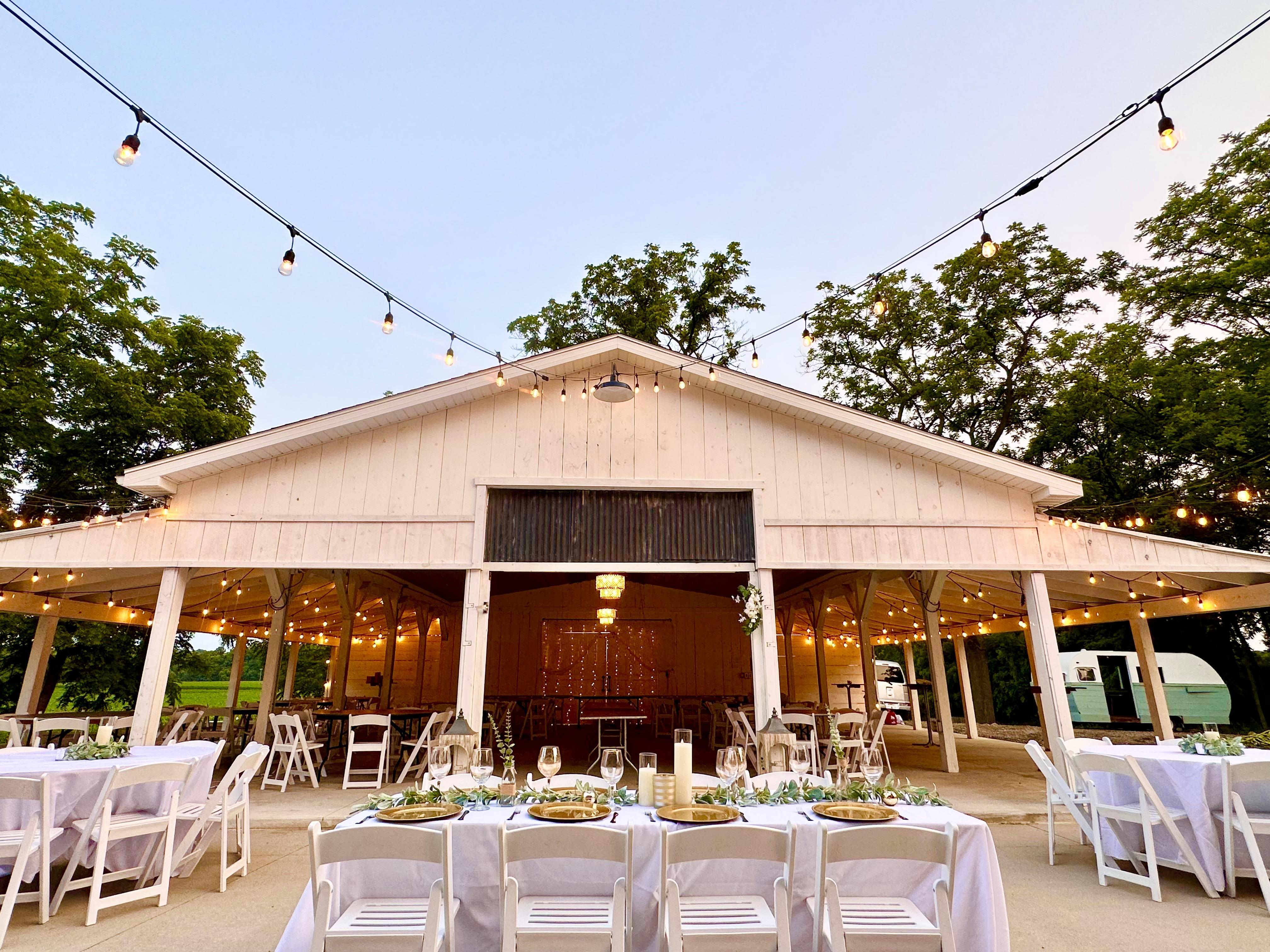 The space between the White Capel Pavilion and lower level barn is a space for mingling, dancing, and celebrating! First dances happen on this patio for a gorgeous shot of the couple dancing under the chandelier visible above their heads from the main level of the barn!