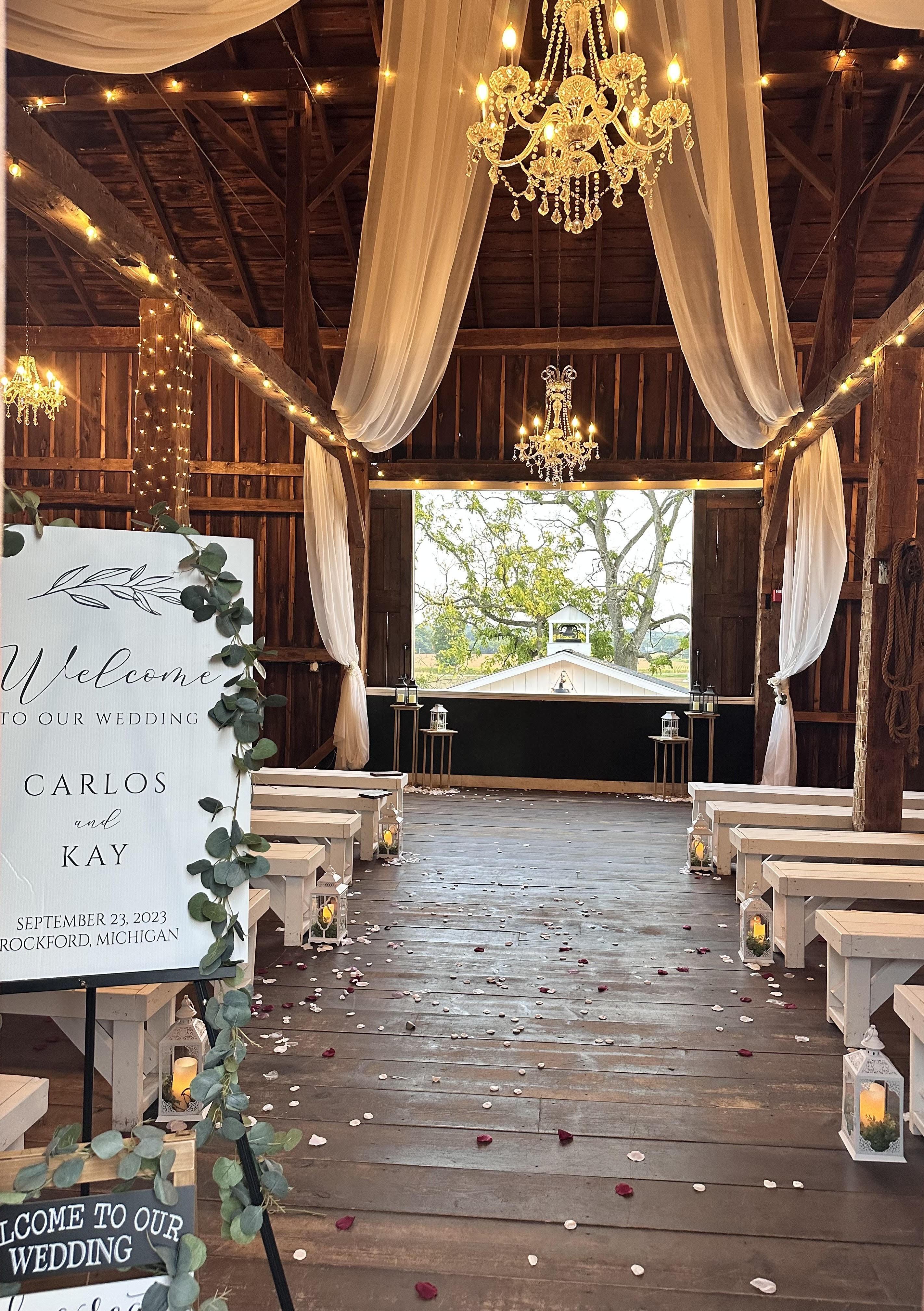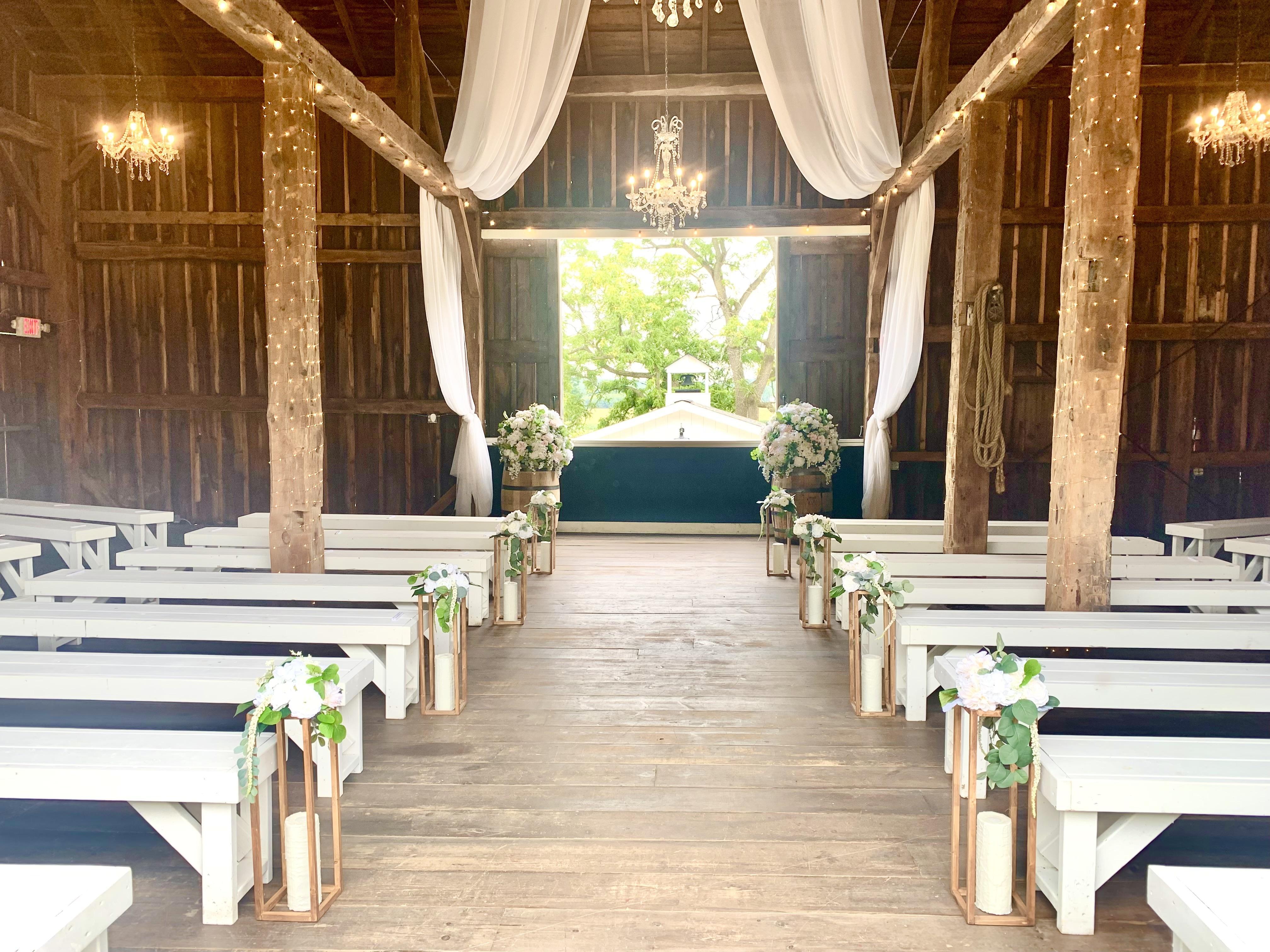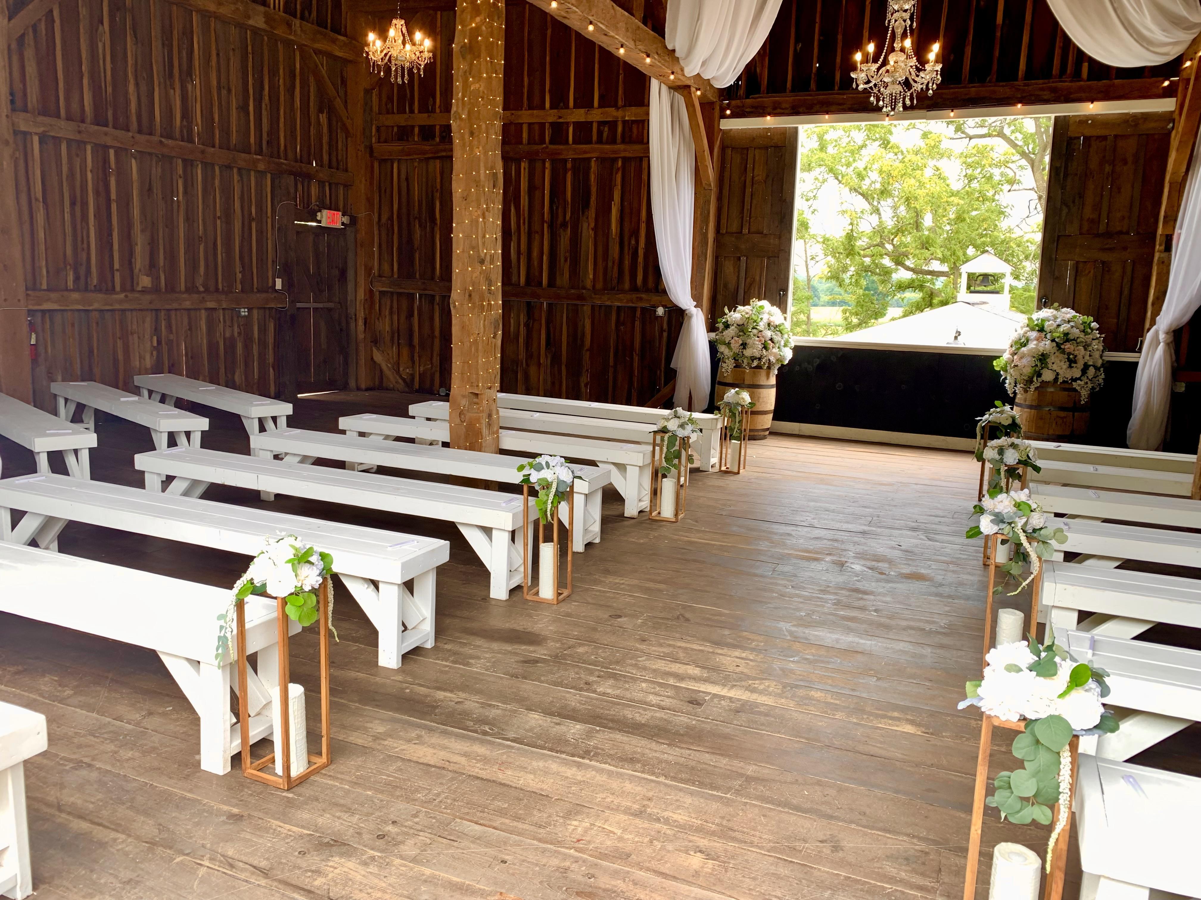 - 6 hanging chandeliers - 30 eight foot benches for ceremony - Optional octagon wedding arch - Optional pedestals for ceremony
