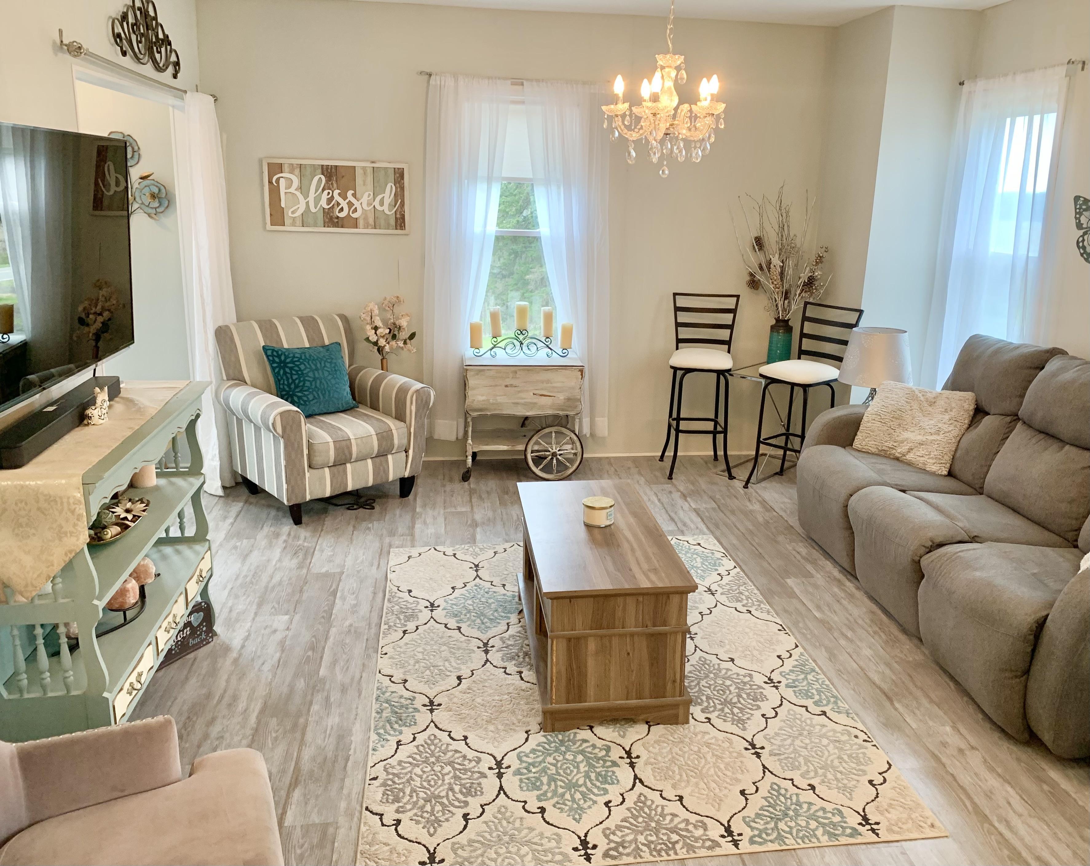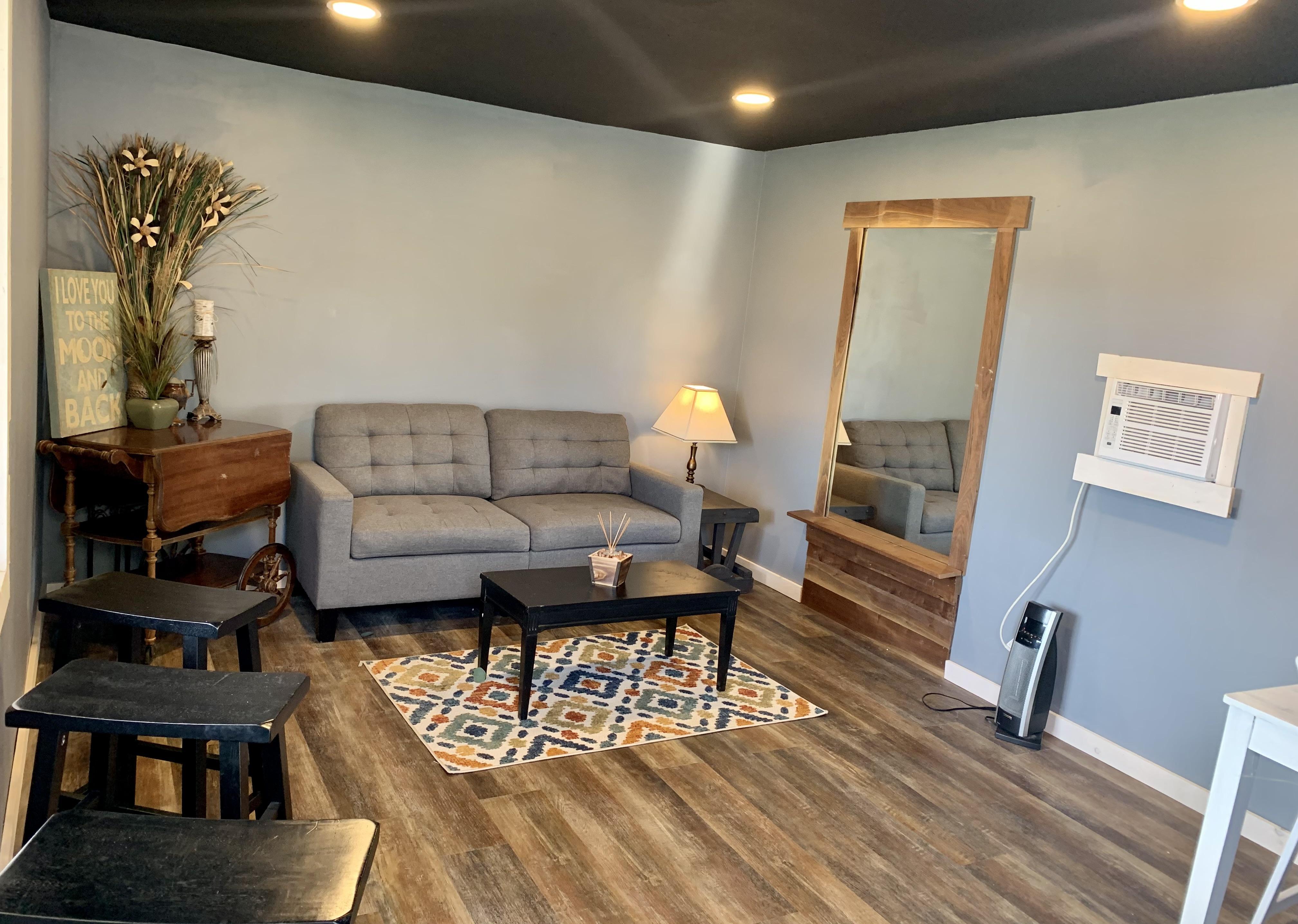 - 4 salon stations - 2 hanging chandeliers - Living room with tv - Private dressing room for 2 - Private restroom