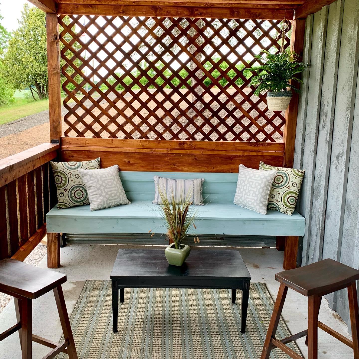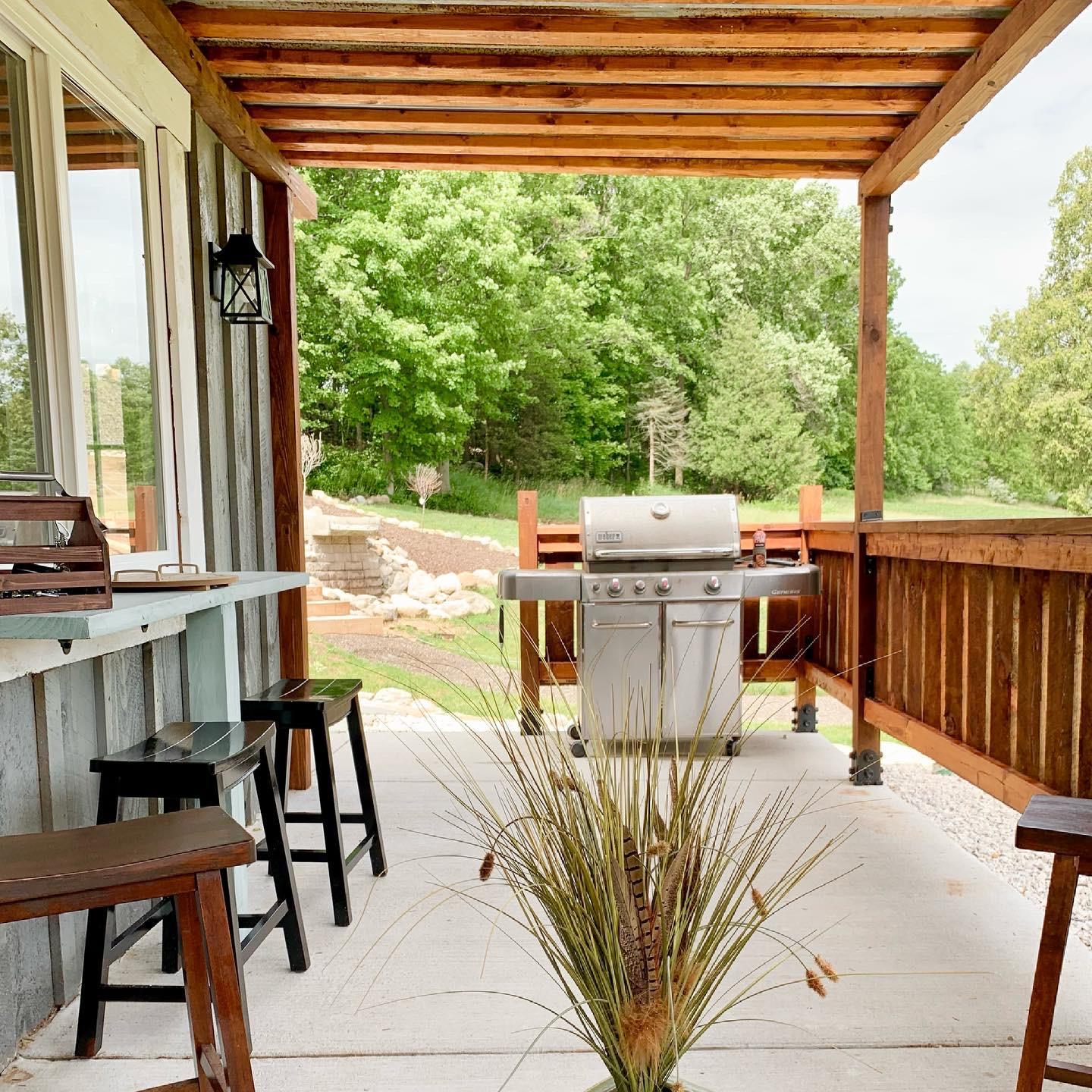 The Groom’s Quarters was designed for an amazing experience, not just a dressing room! We have a working tv, couch, table stools, and covered outdoor seating with a side slide window and bench top on either side for connection between the two spaces! We even have a grill out there for the maximum experience!