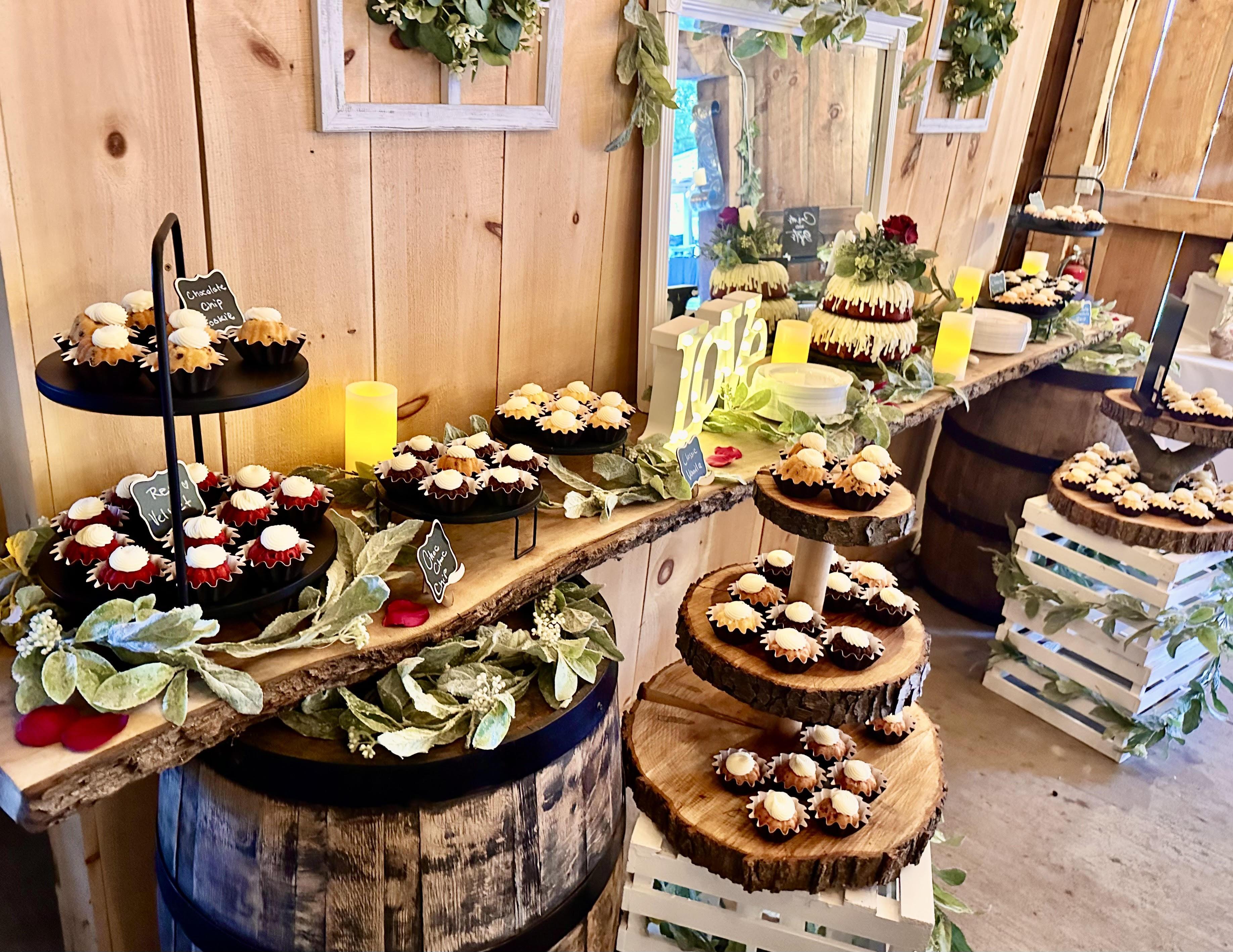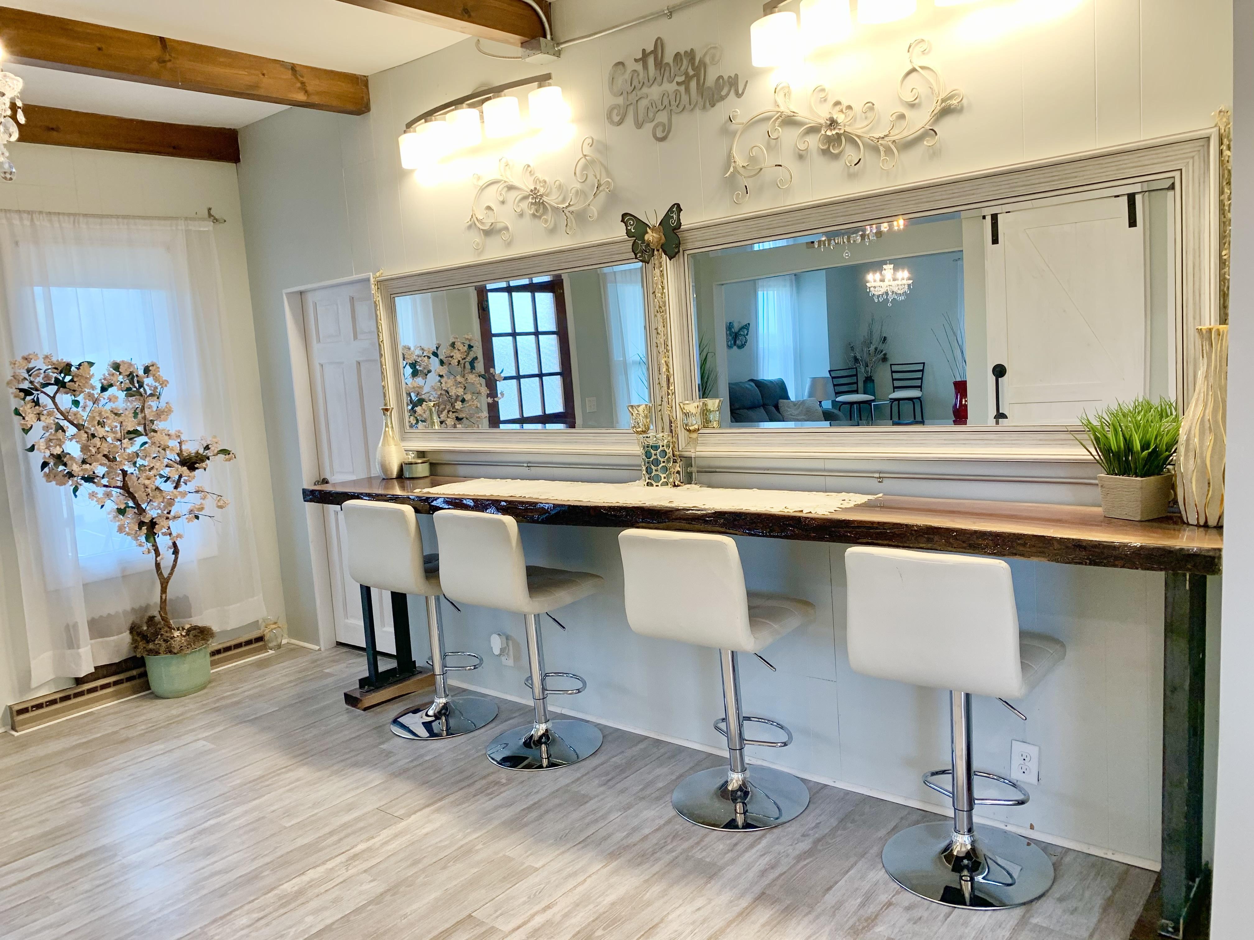- Built in bar - Small freezer for serving ice - Wine barrel display table on a live edge tabletop - Any additional tables needs