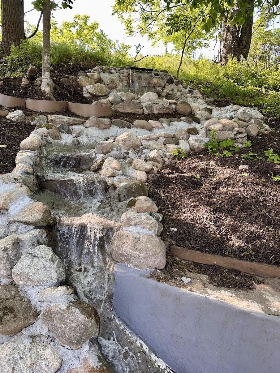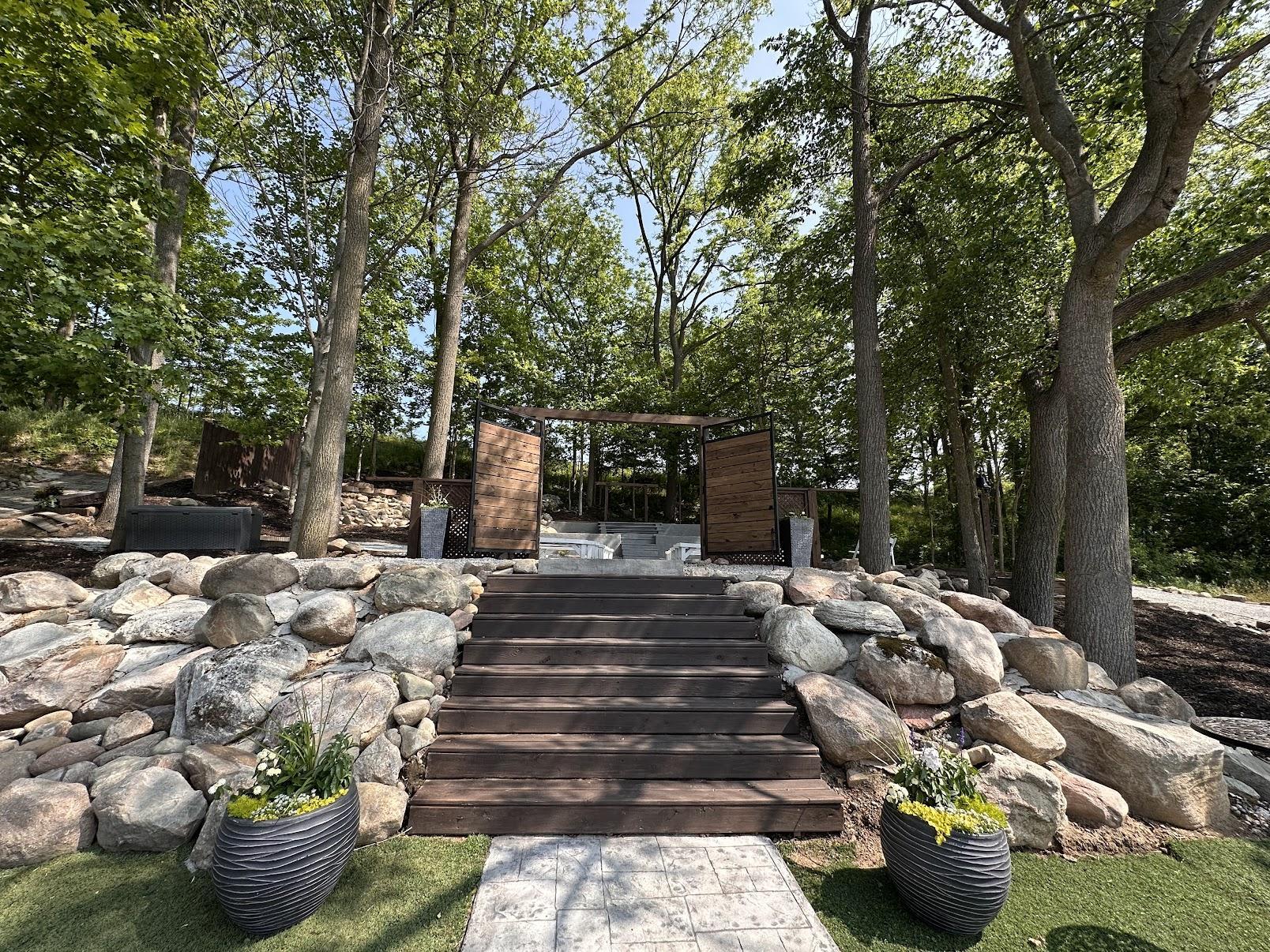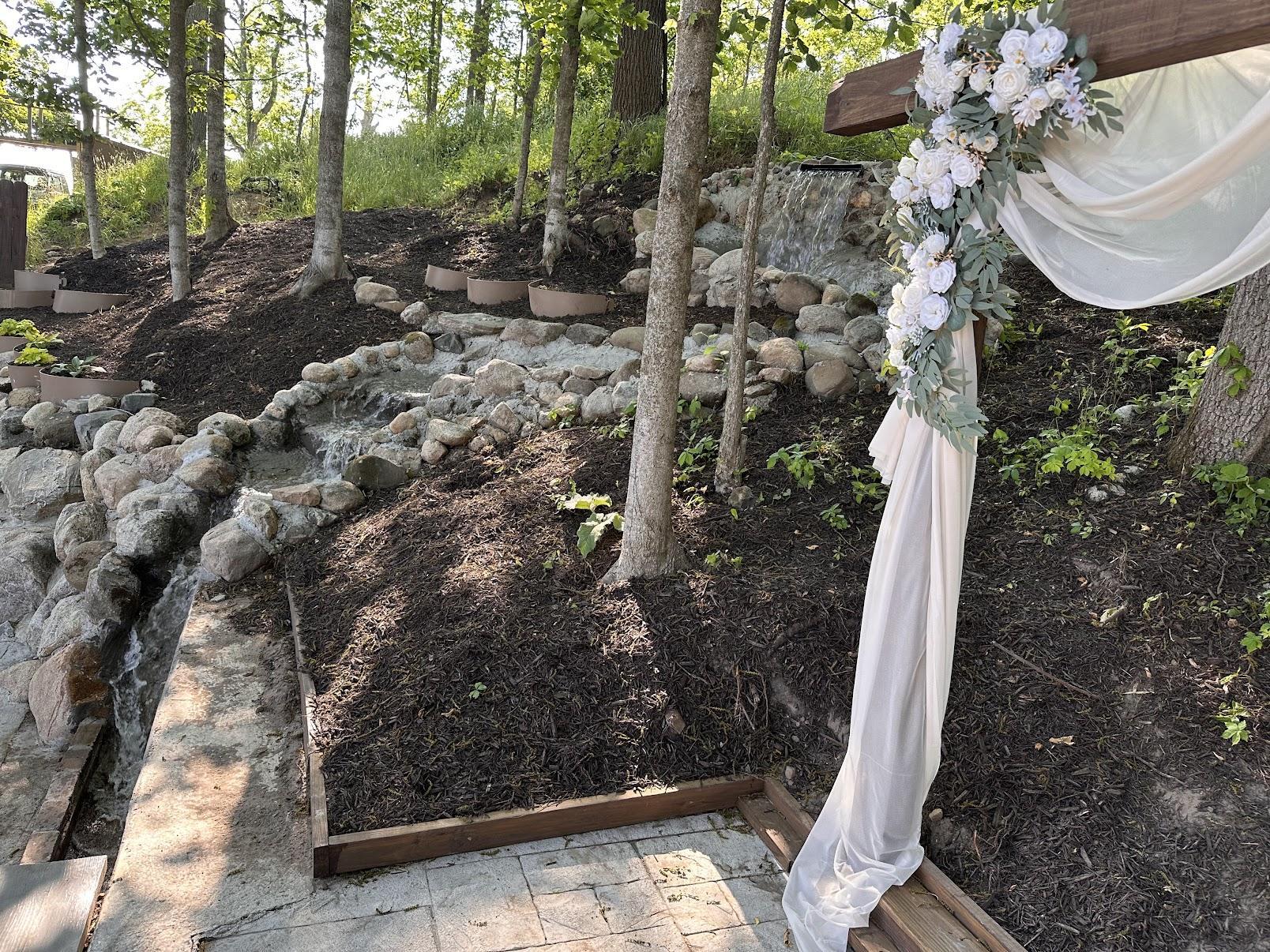 Shaded under a canopy of trees, this outdoor ceremony takes place on an elevated terrace with a cascading waterfall under your feet as you say your vows