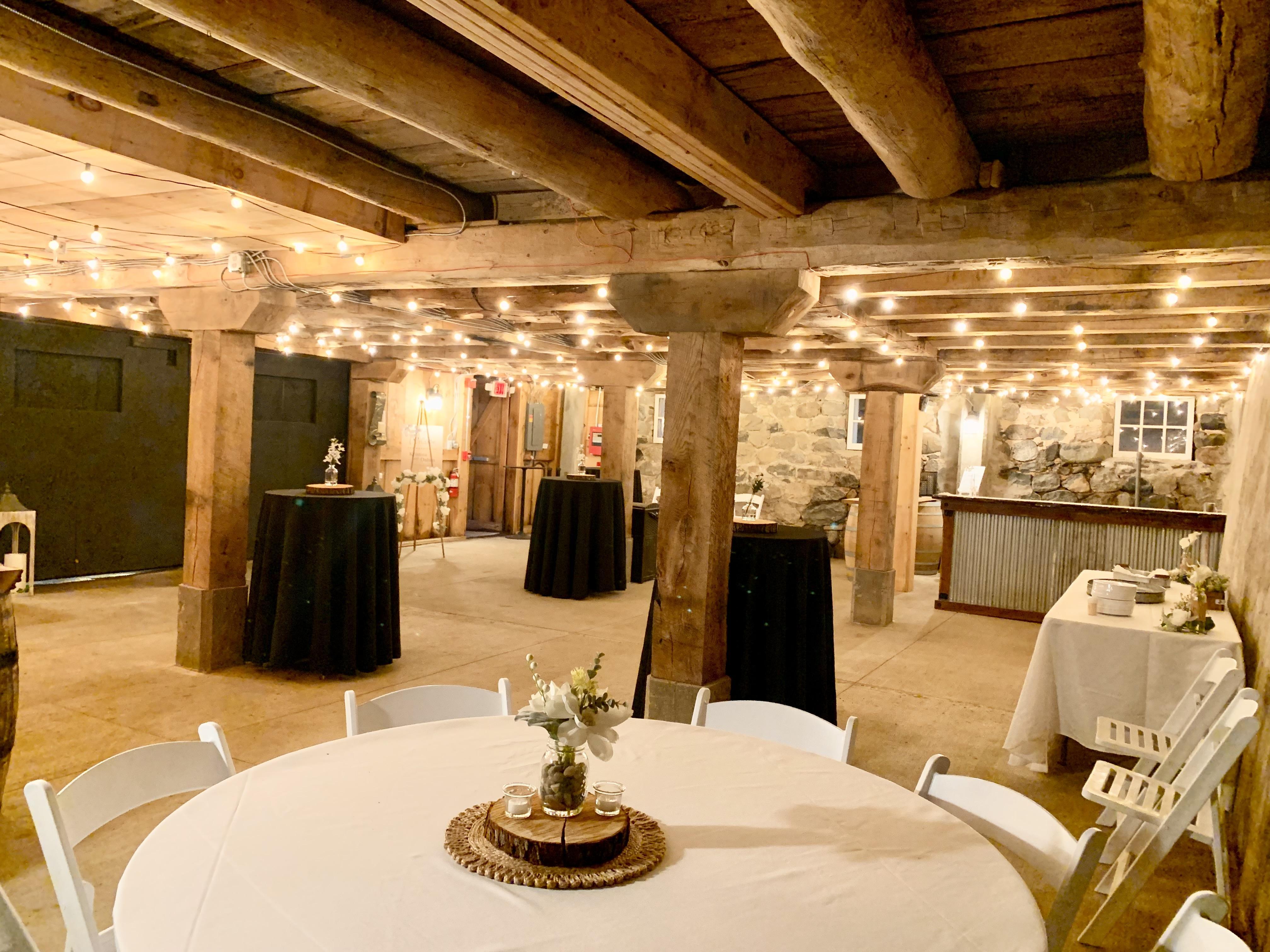 Historic beams, sort drapery, and stunning views from the top of a hill make this the perfect location for your indoor ceremony! We have opposing doors that allow for a cross breeze at the top of the hill. One side looks out to the hillside waterfall, and the other looks out to the bell tower on top of the white chapel pavilion. It is at the perfect height to stand just over your head at the alter to be rung during the ceremony!
