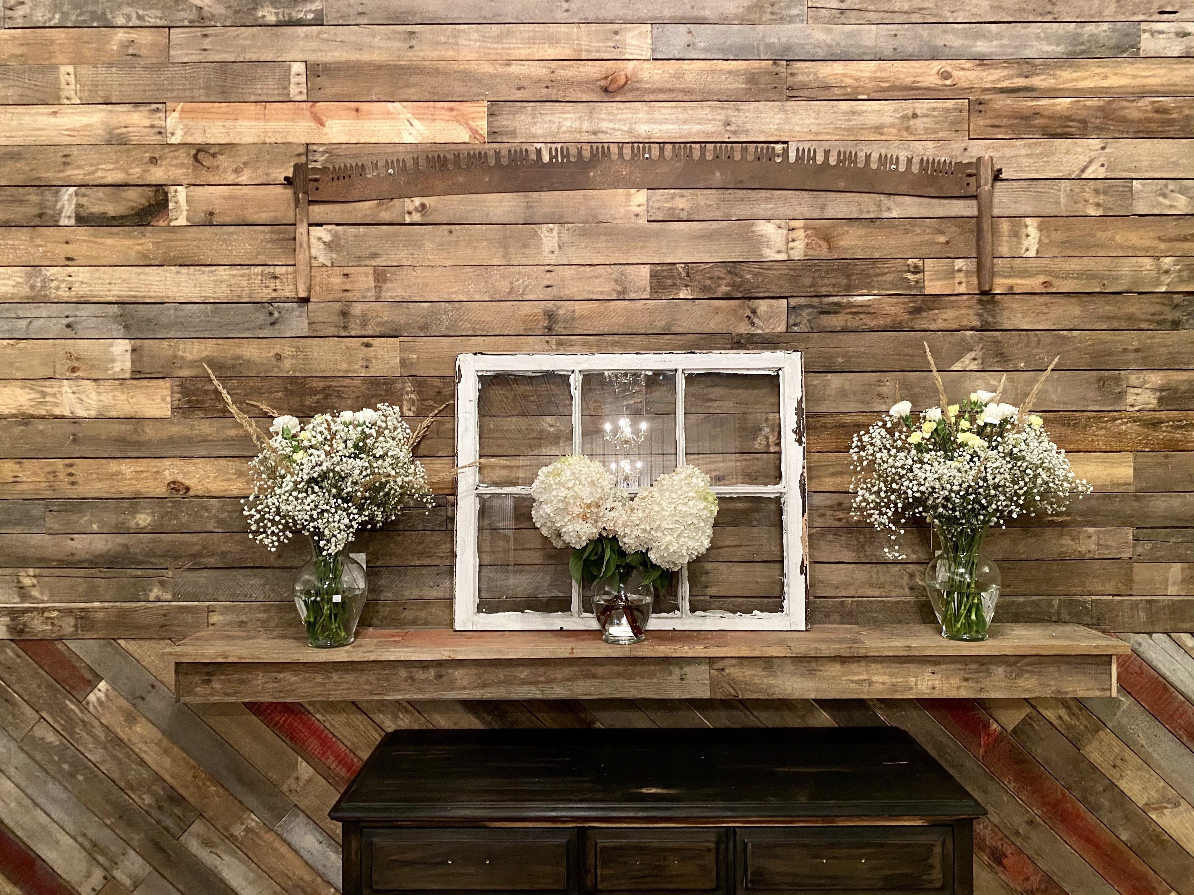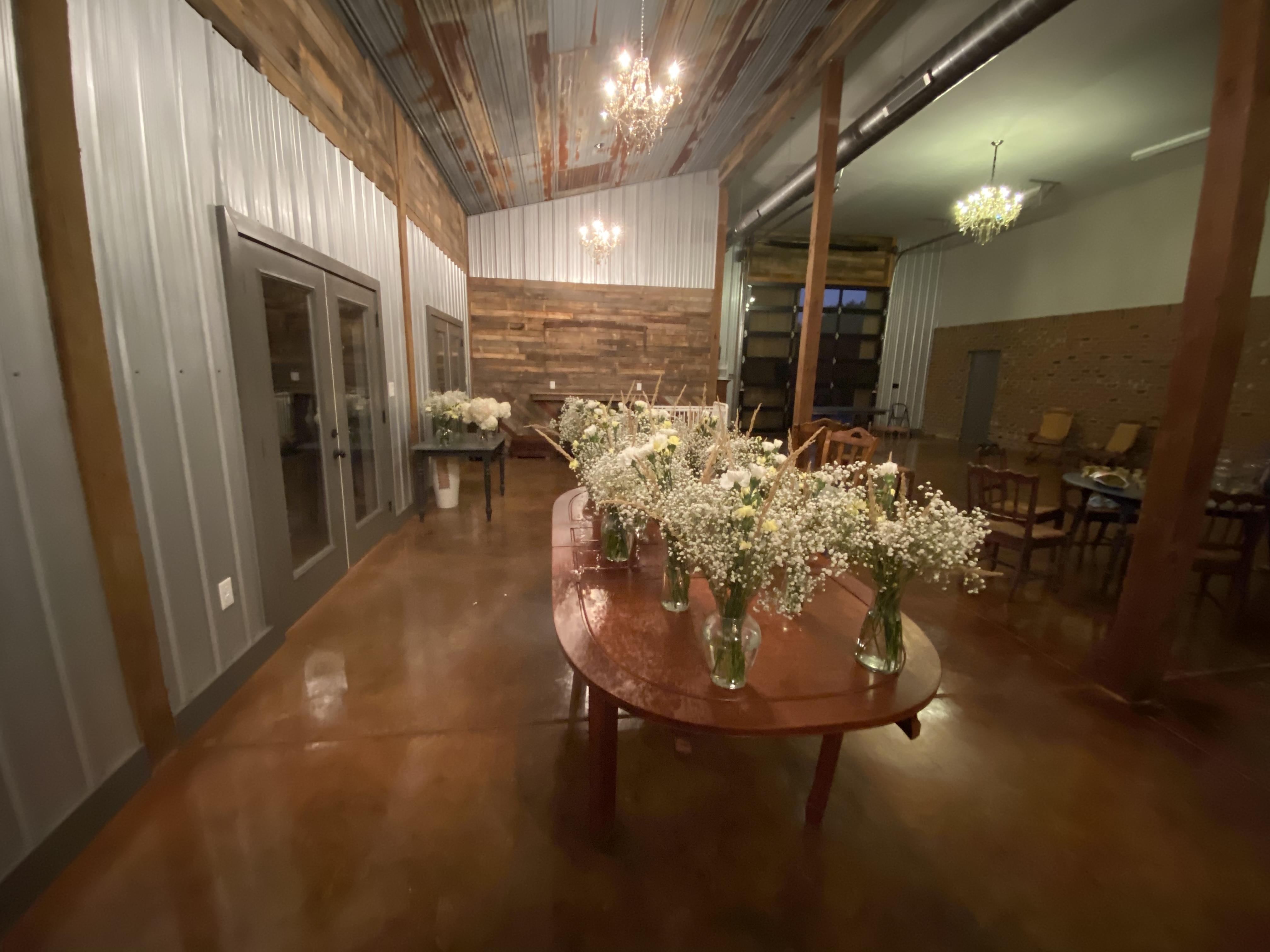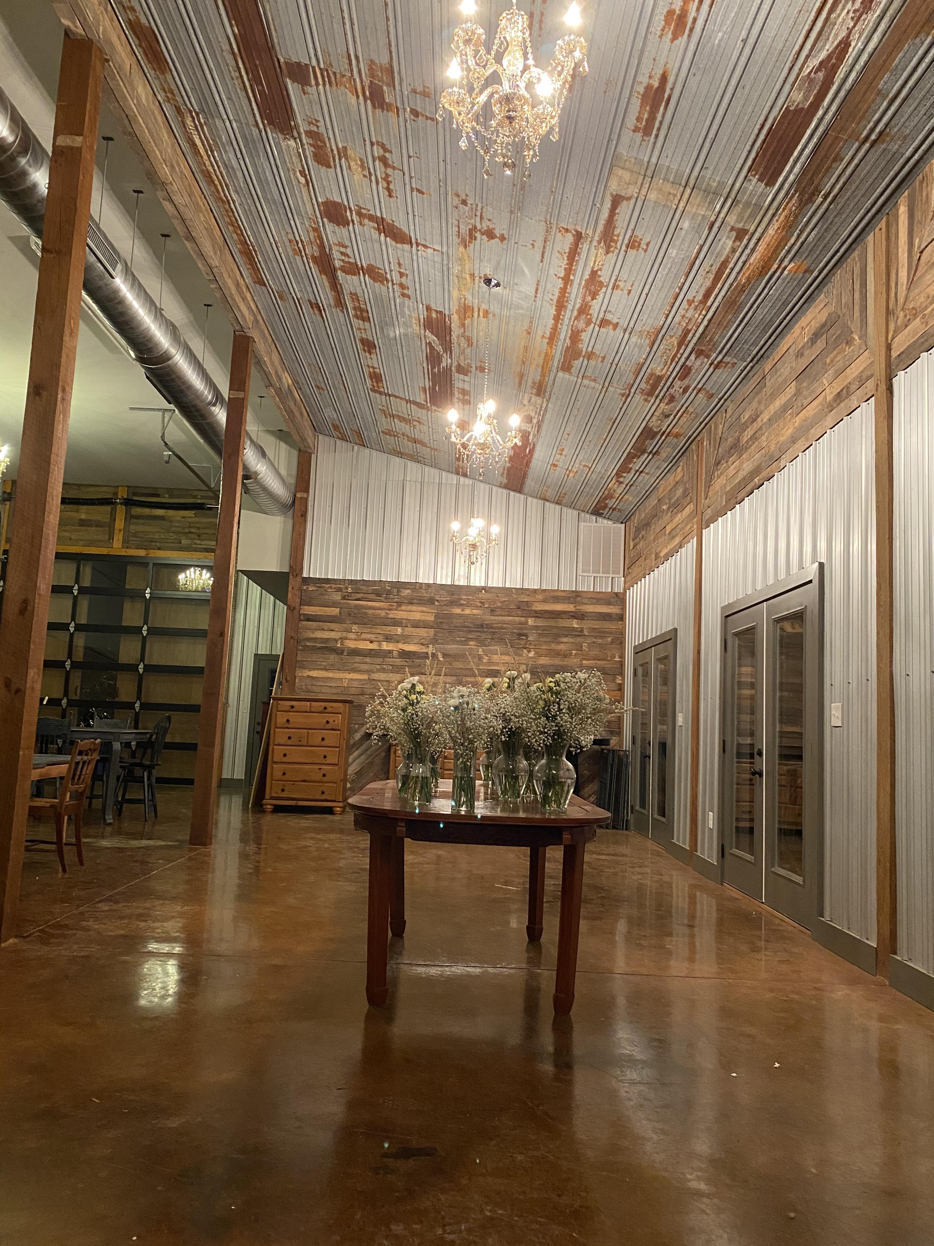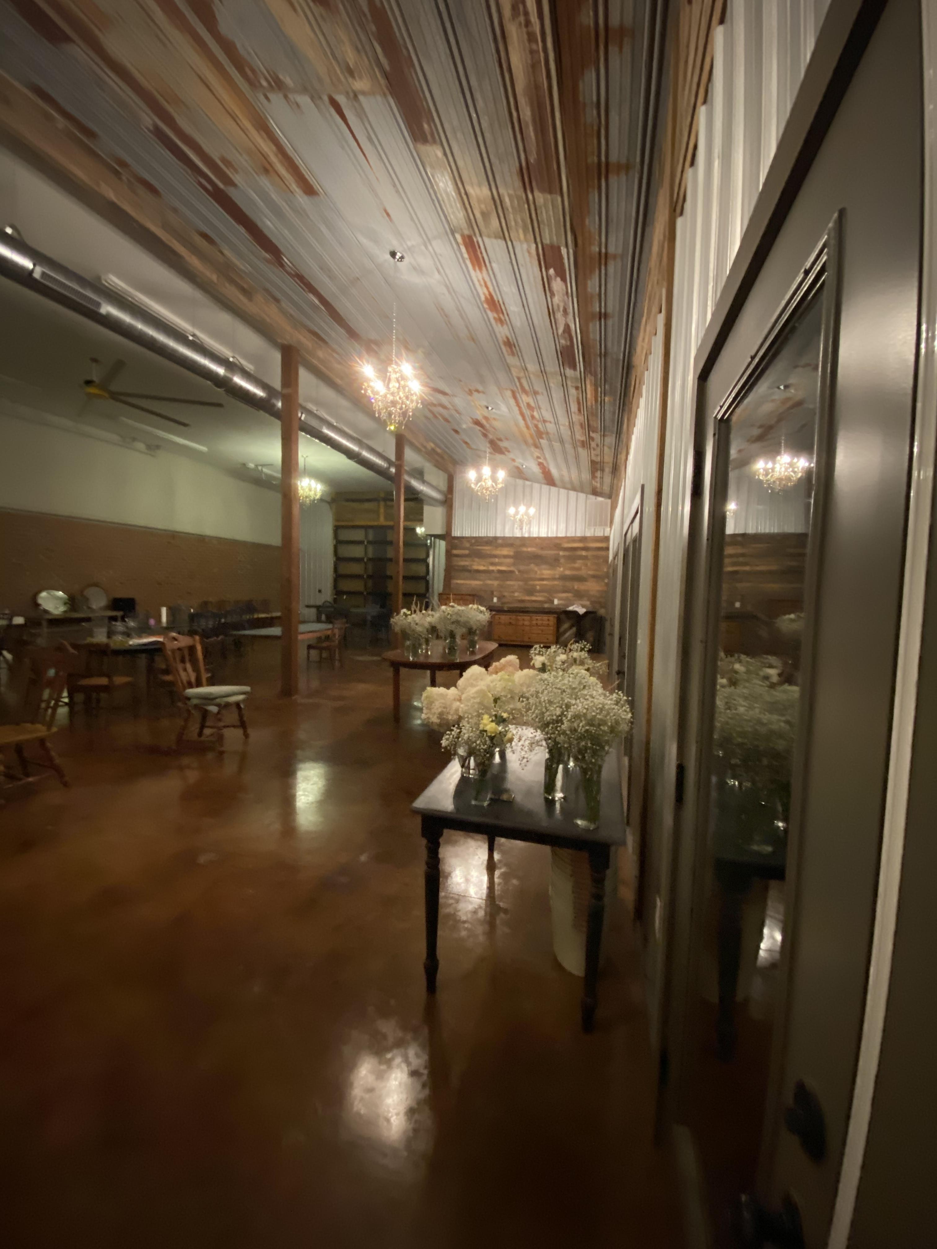 8000 square feet of rustic and glam decor. Genuine wood tables and chairs make table cloths and chair covers obsolete. There is plenty of decorations that can be used for centerpieces etc. 6 chandeliers add glamour and there are 3 light setting to pick from.