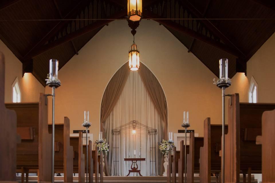 This beautiful white chapel is known for hosting magnificent wedding celebrations. The 130-year-old space has a high steeple, cathedral ceiling with hand-carved truss work, and beautiful mahogany details. This is an extremely romantic and elegant venue to host your wedding ceremony. Private bride and groom rooms are available within the chapel to help ensure a seamless day.