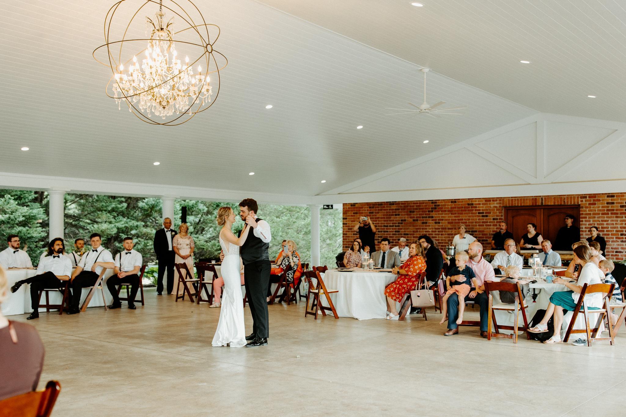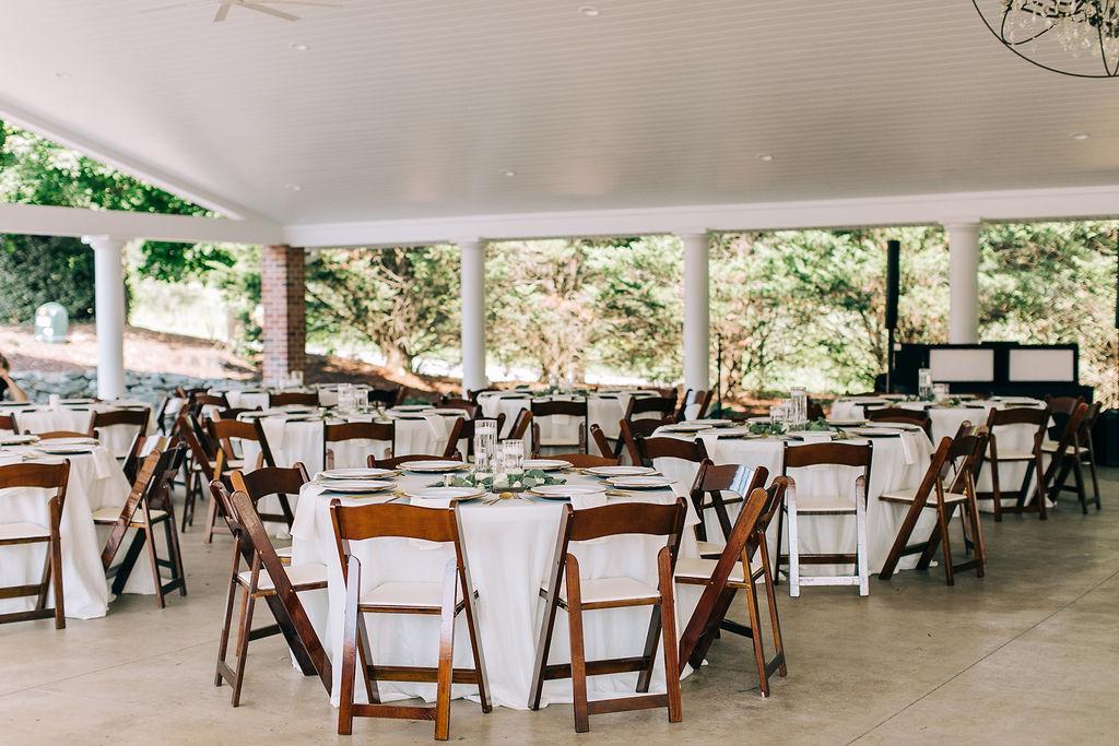 Our pavilion is an all white outdoor space that accommodates up to 200 guests. The center of the room features a large, modern crystal chandelier. The space gives endless opportunities to customize it how you want. There are temperature controlled bathrooms in the pavilion for guests. Dimmable lighting giving you the option to for mood lighting during dancing. The pavilion has the ability to be enclosed with sides for bad weather.