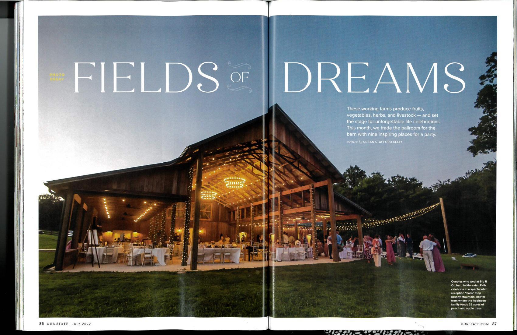 Big R Orchards - Wedding and Event Venue is located on top of Brushy Mountain in the foothills of the Blue Ridge Mountains near Wilkesboro, NC. Enjoy the beauty and romance of 150 acres of family owned & working apple & peach orchards with a 6 acre lake and golf green peninsula with amazing mountain views. The pavilion was uniquely designed and hand-crafted by friends & neighbors. The elegant bridal suite is spacious with over 1000 sf of space, private bathroom, & hair and makeup stations. There is a full commercial caterer's kitchen, public bathrooms, and grooms suite. The open but covered grand hall is 6000 sf with 2 huge chandeliers, Edison string lights, post lights, and a huge rock fireplace. There are also motorized curtains on the west side that can be closed or opened with a touch of a button. The dance floor is spacious and magical, covered with Edison string lights and open to the sky. We would love to give you a tour of this magical place! Cheers! Scott Robinson