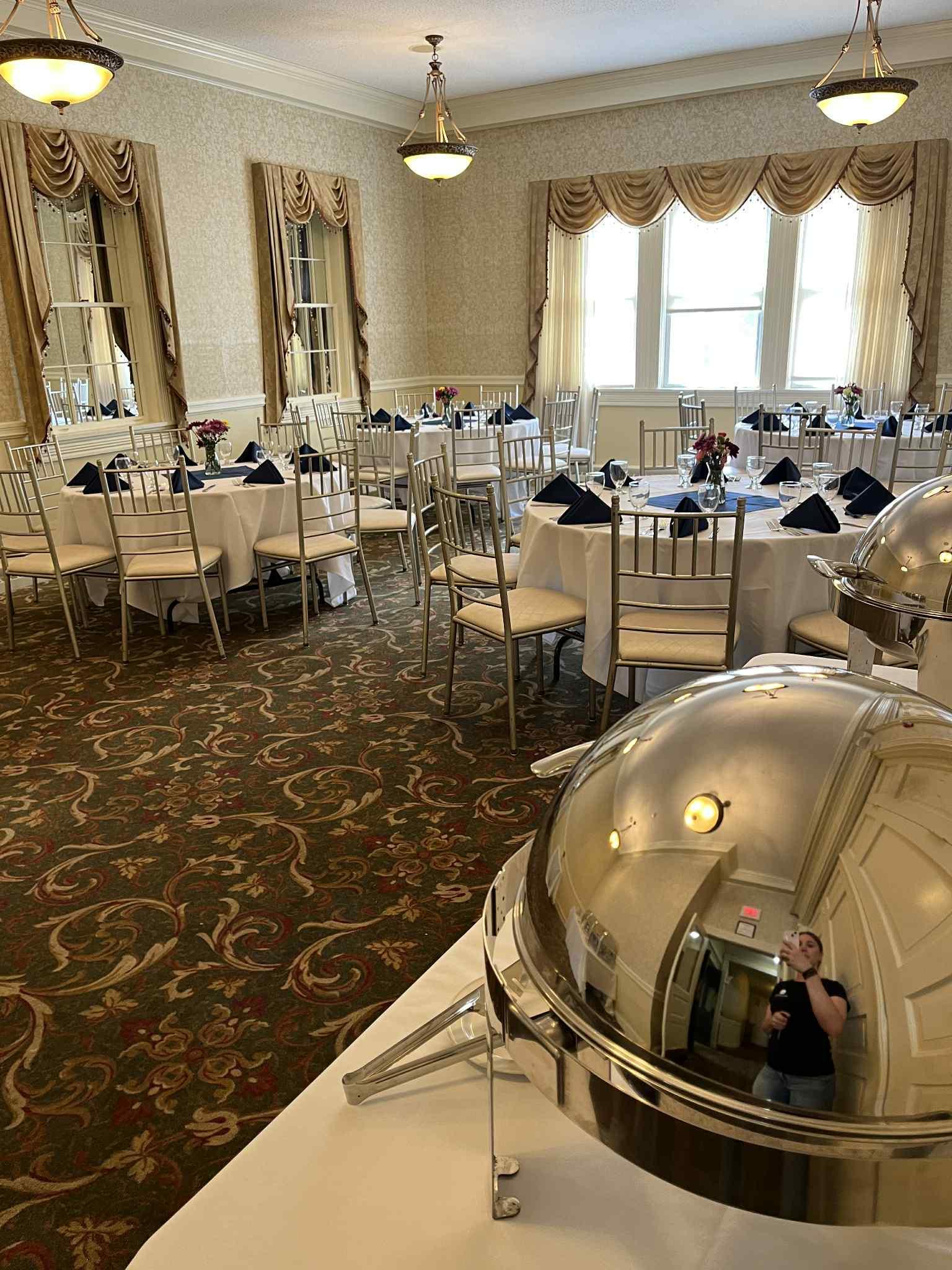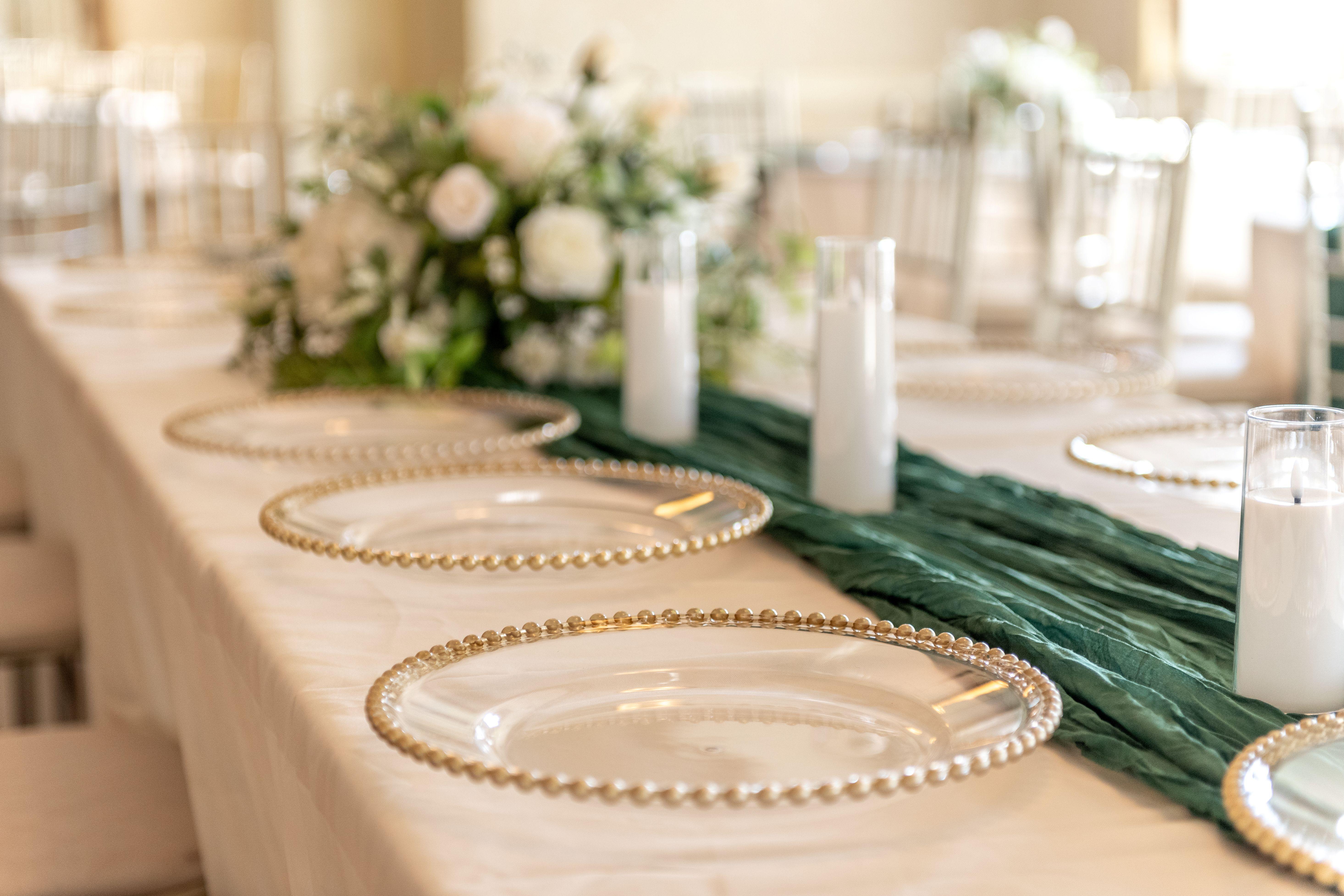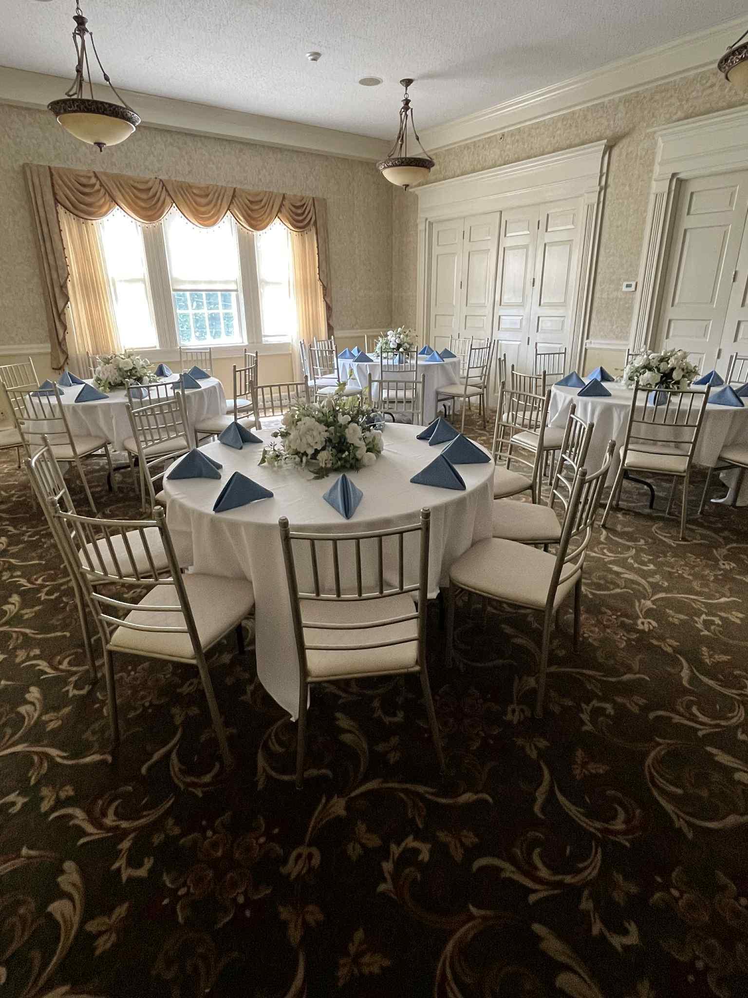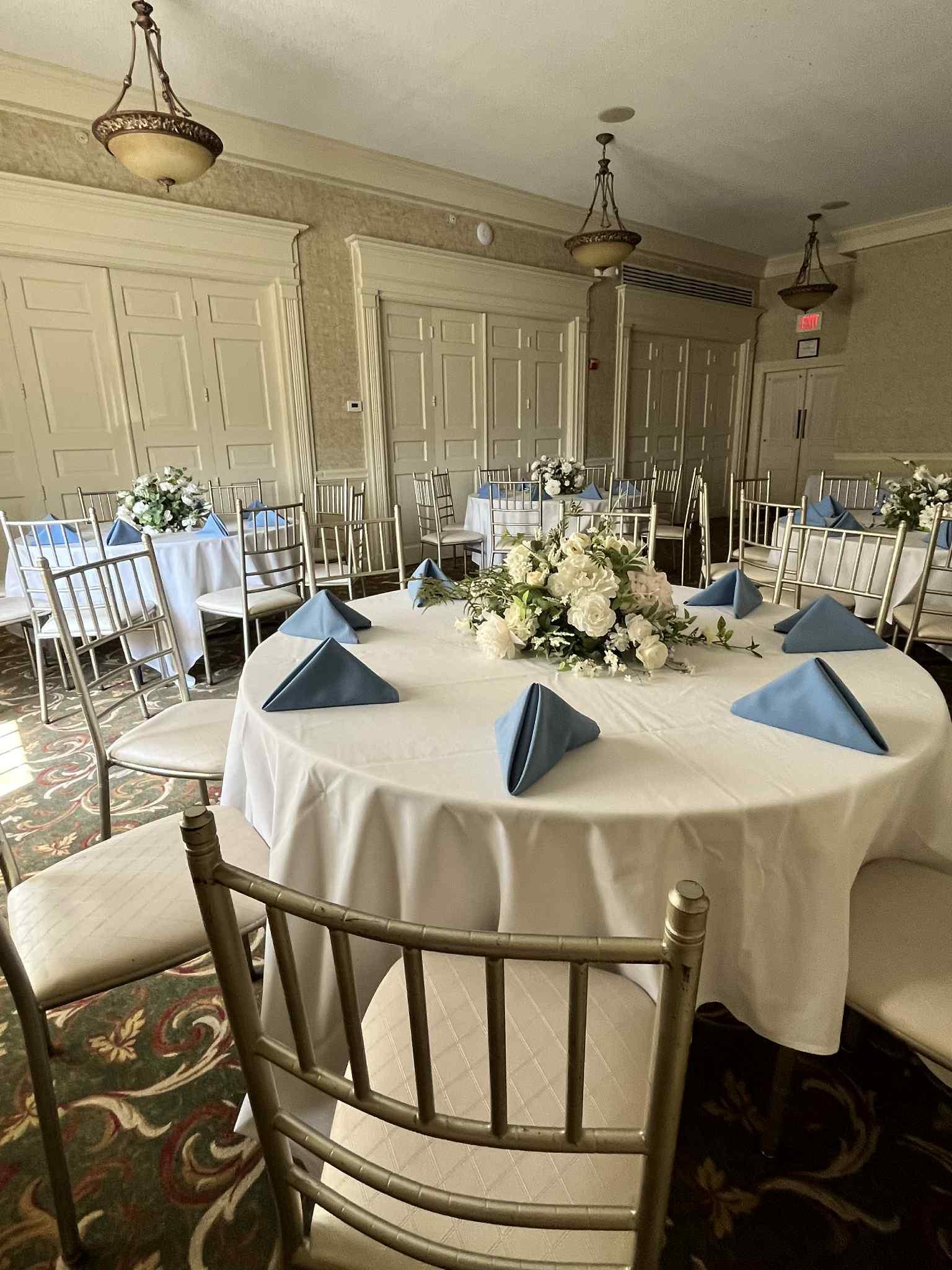 Round and Banquet Tables Champagne Chiavari Chairs Floor Length Linens Professional Event Staff Flatware, Glassware, Plateware Chandeliers and Recessed Lighting with Dimmers Classic Dance Floor Access to Decor Closet