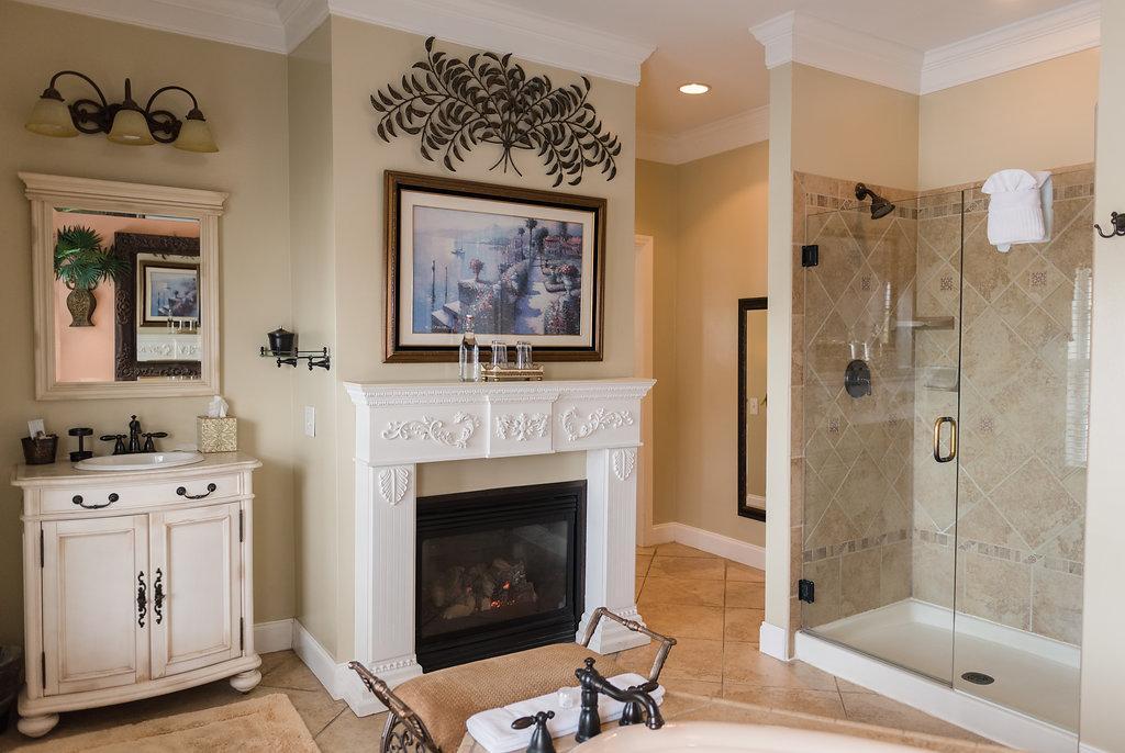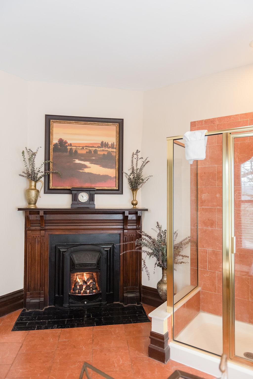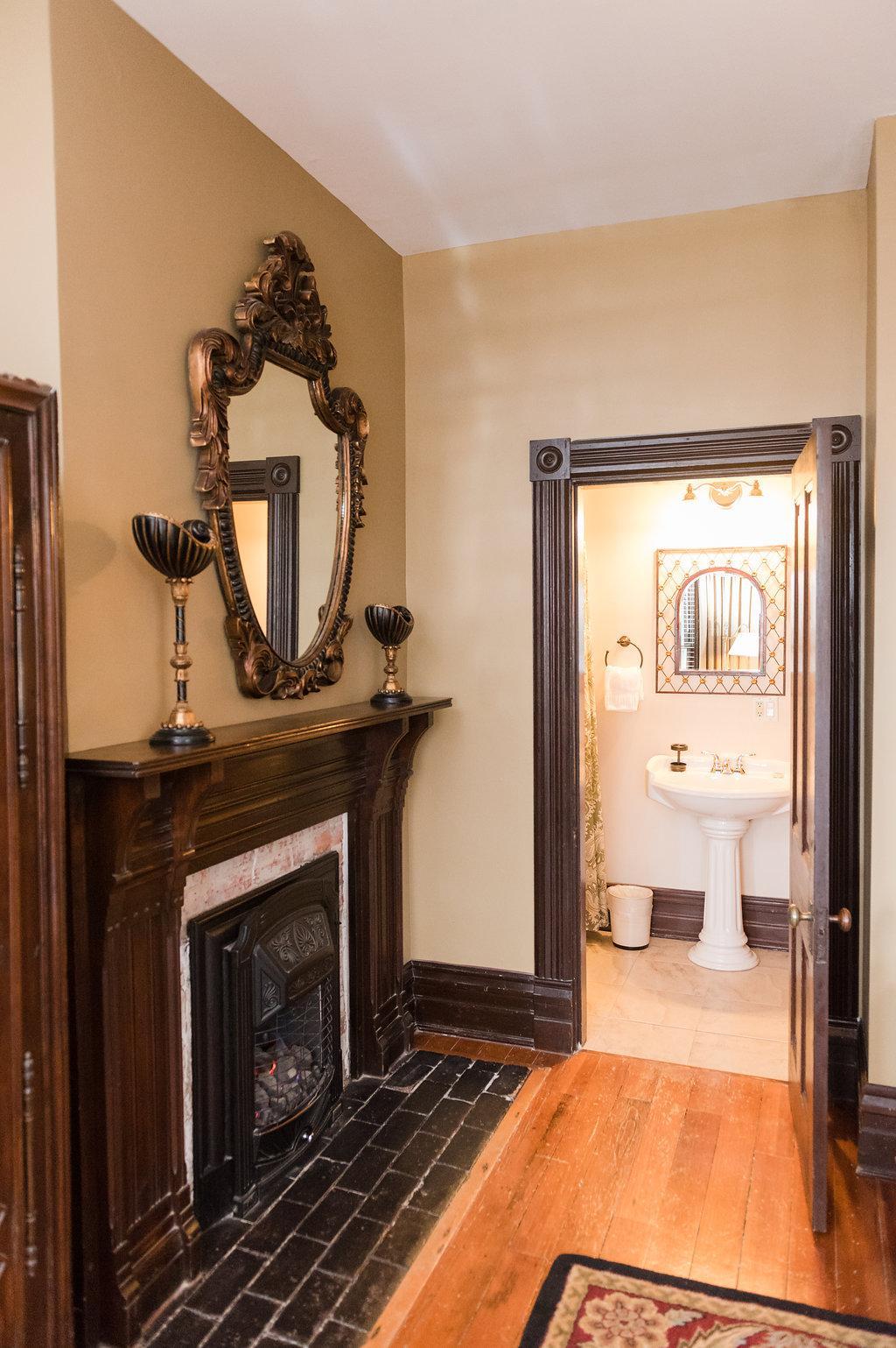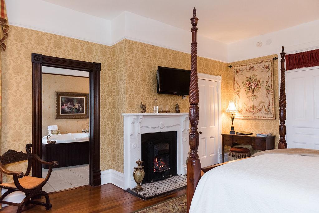 King-sized bed - Two Victorian gas-coal fireplaces - Double Jacuzzi tub - Separate shower - Flat Screen TV with DVD player - iPod alarm clock - Mini-fridge - Minx-lined plush robes - Designer bath products - Self-controlled heating and air - Hair dryer and makeup mirror - Fan - Iron and ironing board - Complimentary WiFi