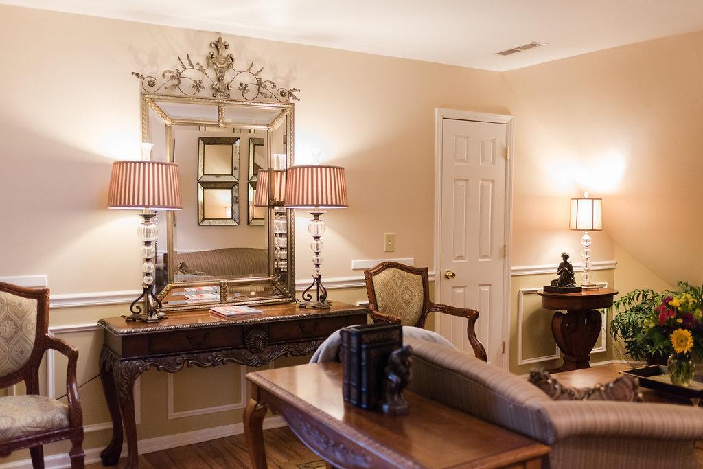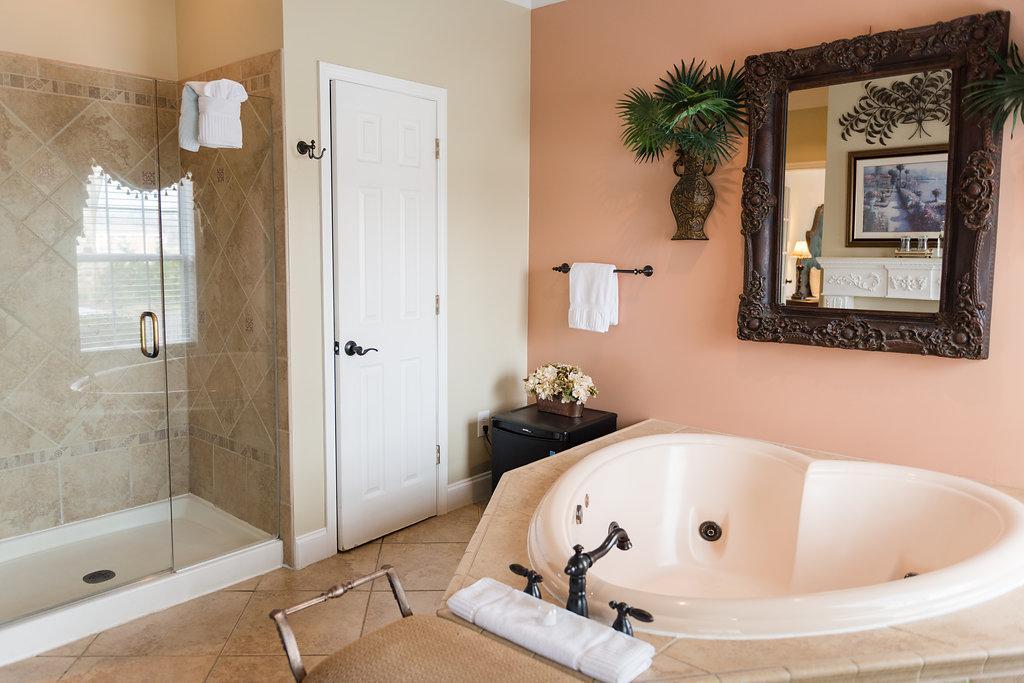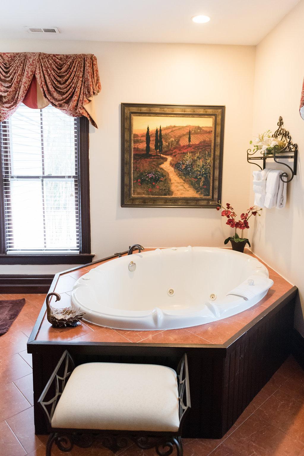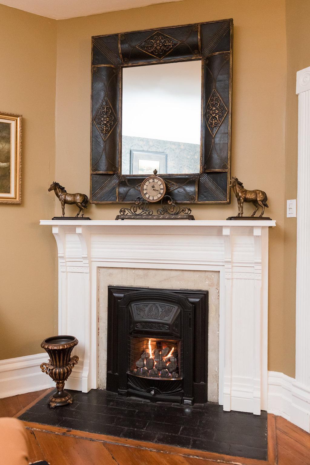 King-sized bed - Two Victorian gas-coal fireplaces - Double Jacuzzi tub - Separate shower - Flat Screen TV with DVD player - iPod alarm clock - Mini-fridge - Minx-lined plush robes - Designer bath products - Self-controlled heating and air - Hair dryer and makeup mirror - Fan - Iron and ironing board - Complimentary WiFi