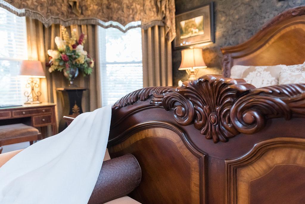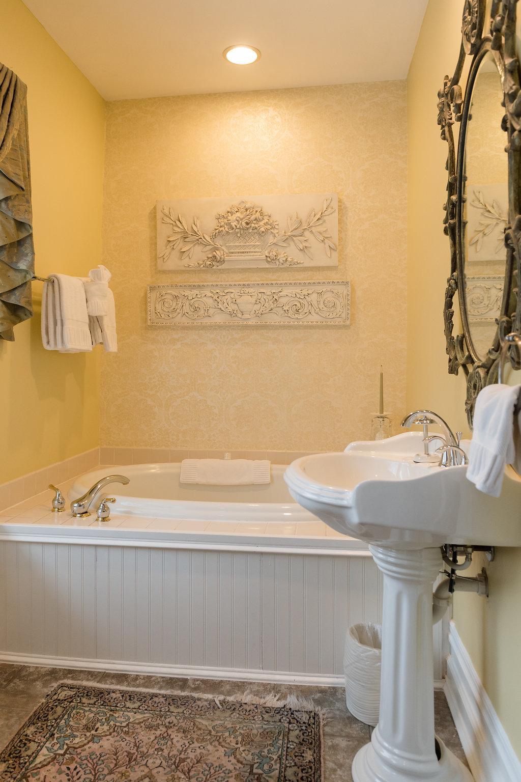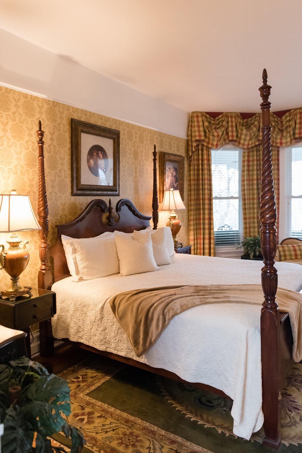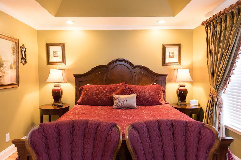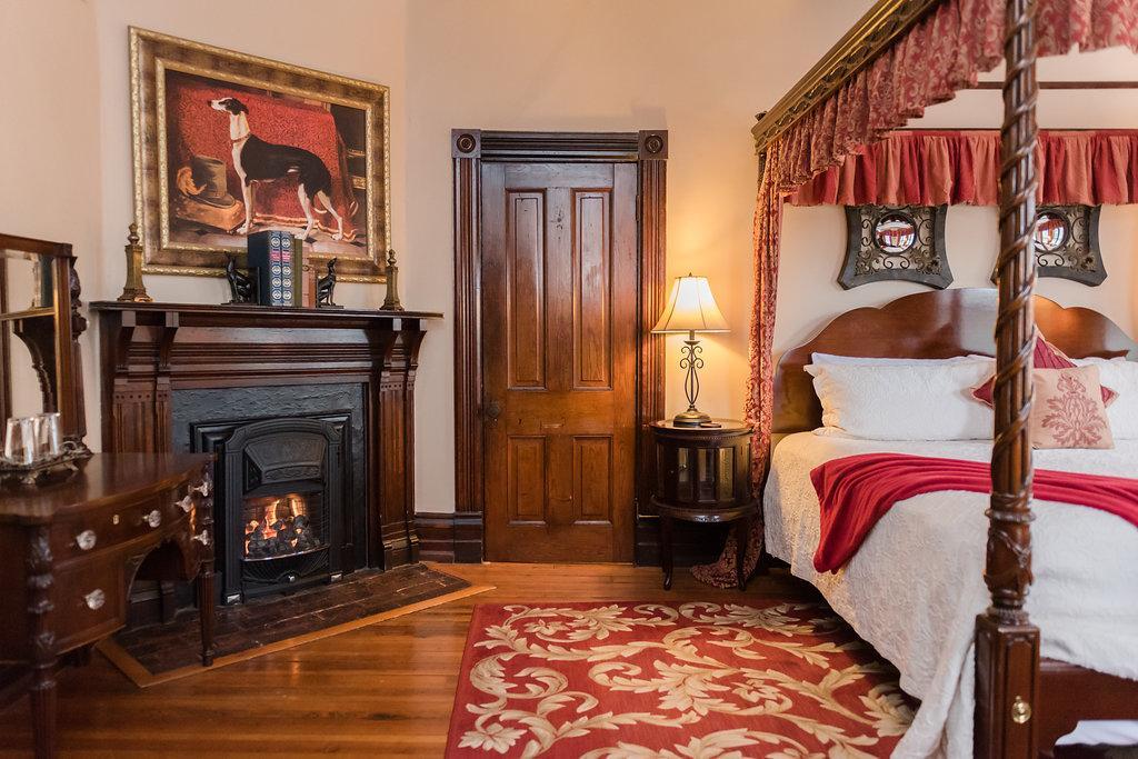 We have modeled this bright and decadent room after George Vanderbilt’s bedroom at the Biltmore Estate. With its hand carved four-poster bed, Victorian gas-coal fireplaces, and red and yellow tones, the second story Vanderbilt Room allows you to experience the elegance and grandeur of Biltmore Estate from our very own bed & breakfast.
