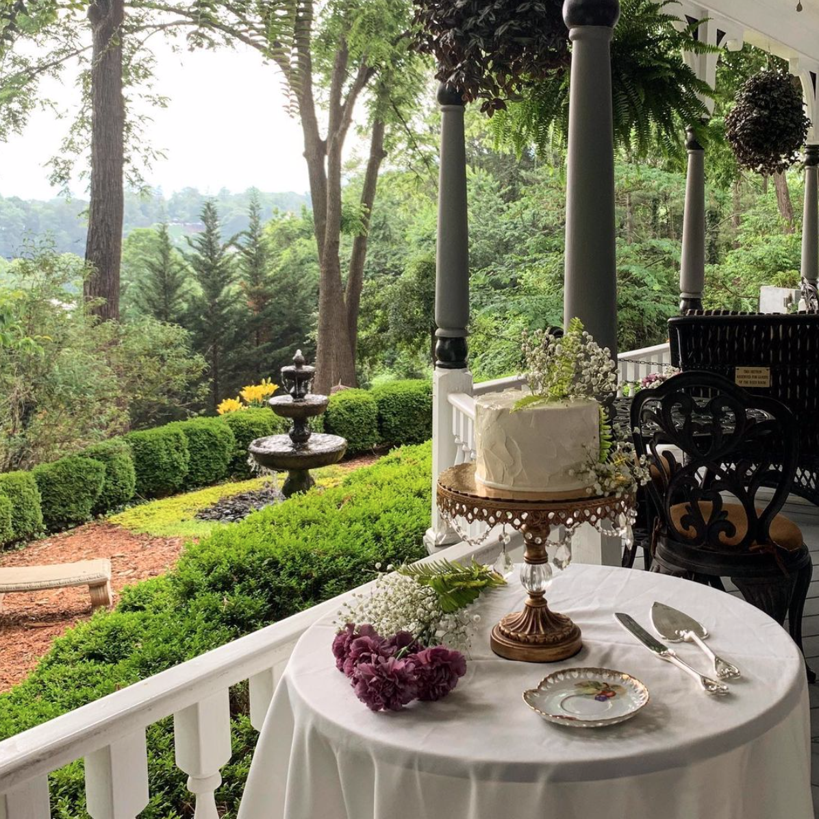 Here you may hold a private ceremony for you and your beloved or dine with your closest friends and family in the shade of our Victorian, wrap-around porch featuring breezy overhead fans, overflowing ferns and the accompanying trickle of our three-tiered water fountain.