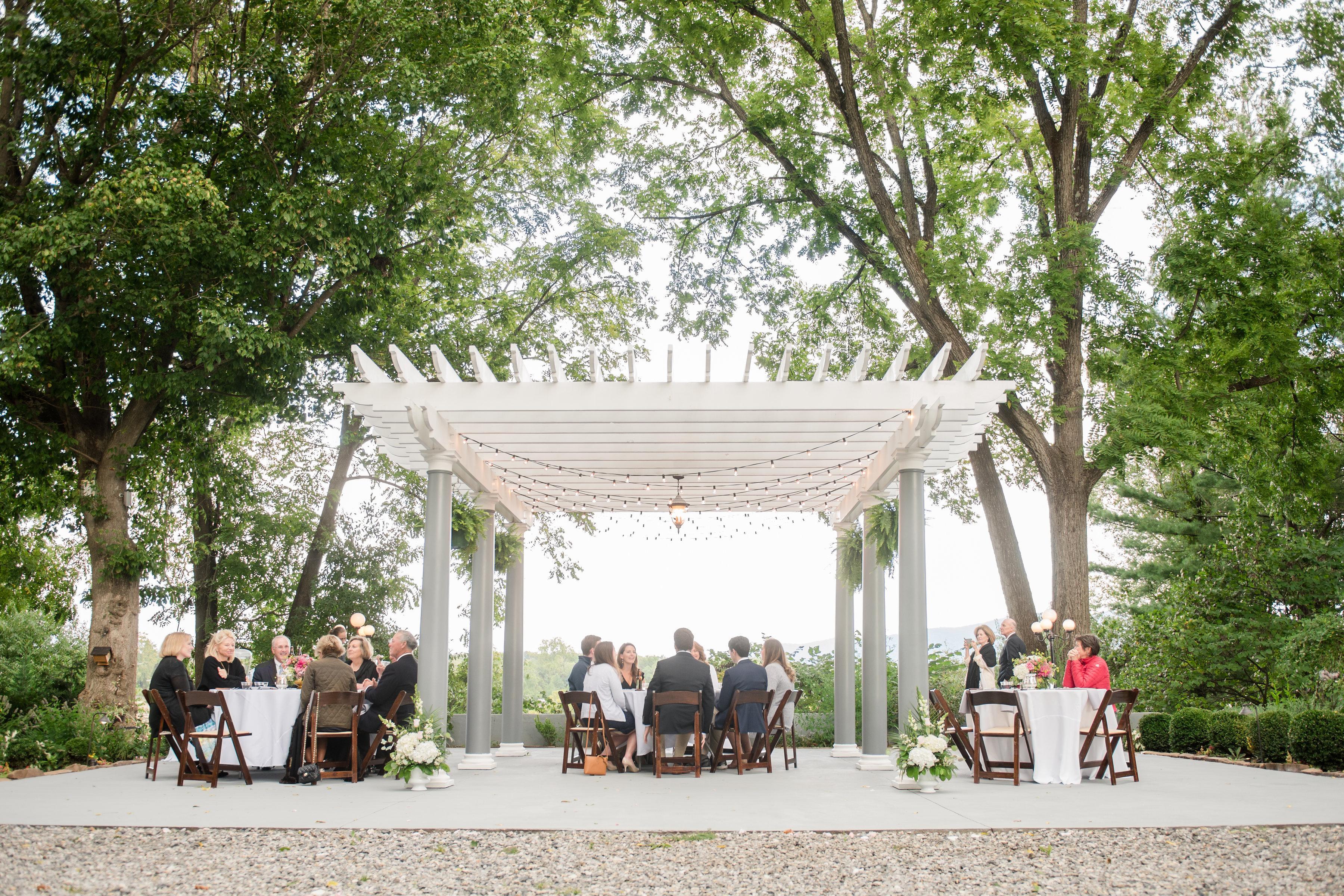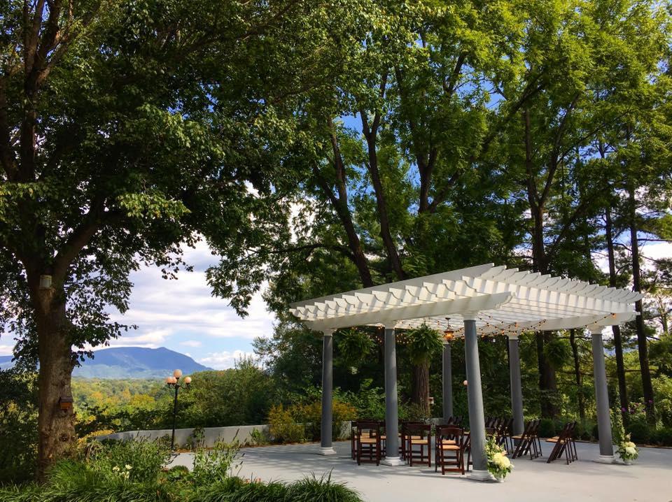 Mountain and garden views - Overhead lighting - Victorian rug decor and outdoor speaker system - Electric hookup for amplification and/or live music needs - Bistro or folding chair seating for your guests - Complete set up for dinner reception - All vendor services booked and coordinated according to agreed upon package details - Some customization and upgrades available