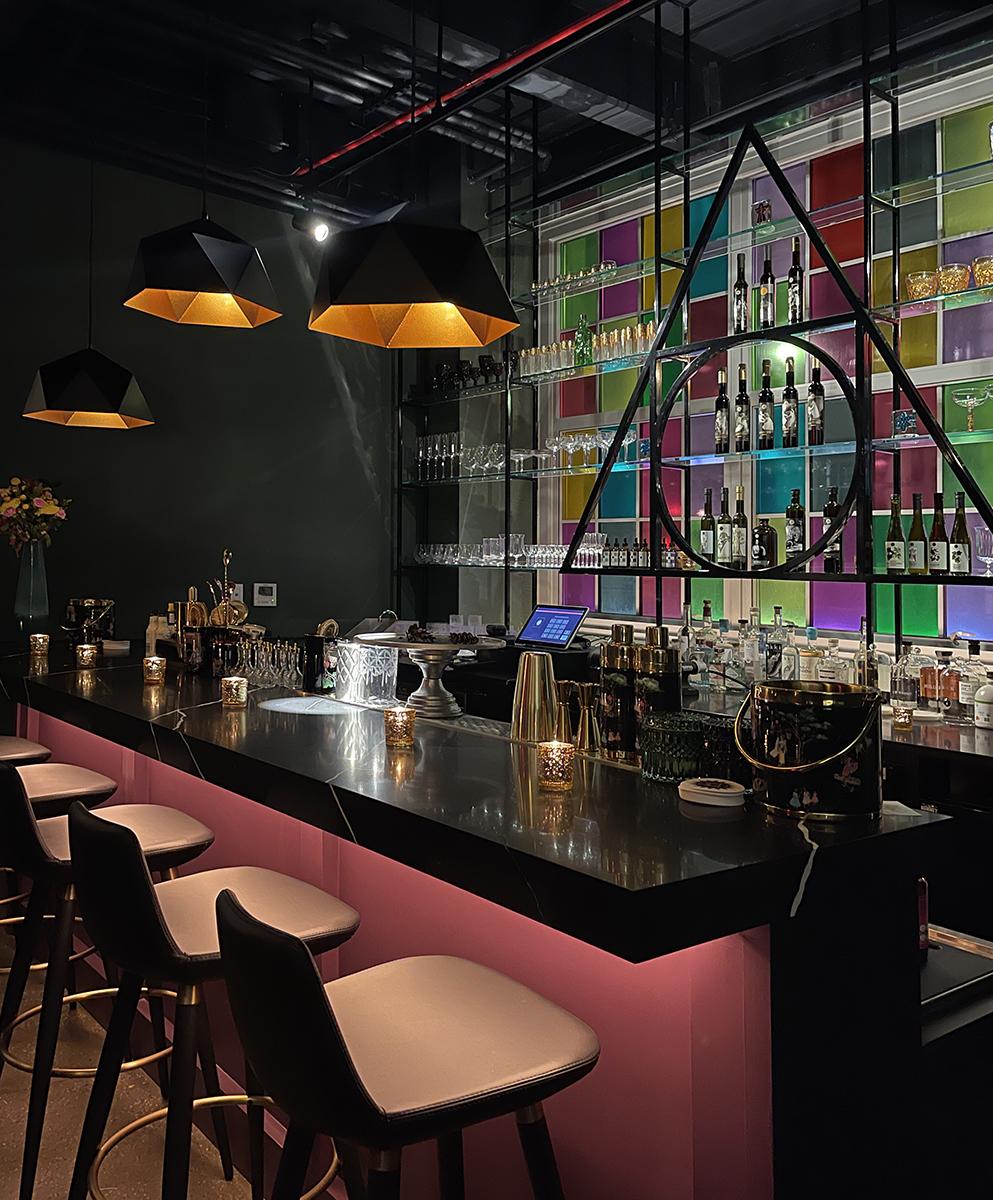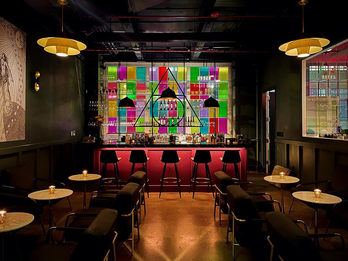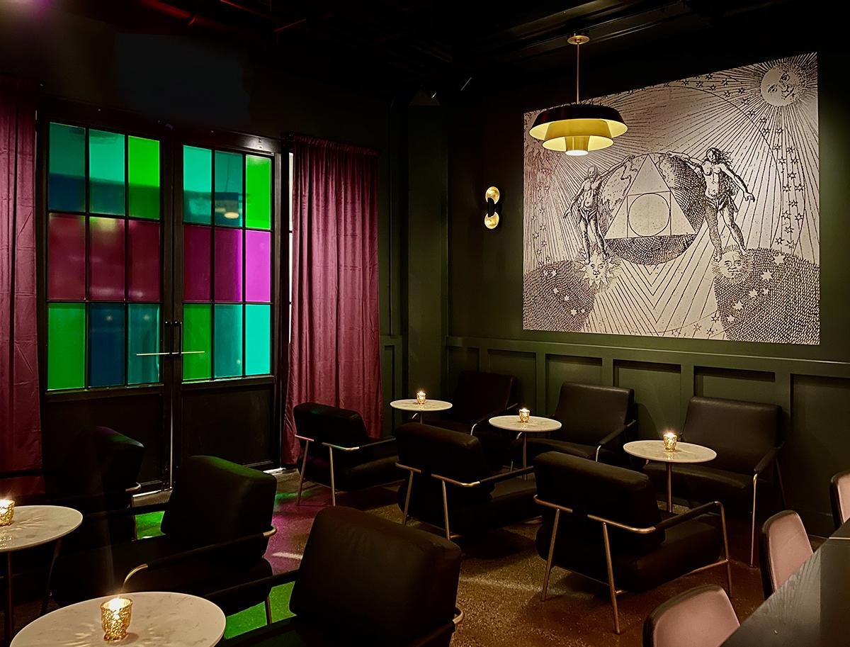 Experience the intimate ambiance of our 17-seat venue, thoughtfully designed by Jutras with a modern-industrial vibe in a green-and-plum color palette. Soft leather chairs and mid-century-inspired marble tables complement the space, illuminated by dimmed golden lighting. A stunning mosaic of 48 colored glass panels adorns the wall behind the bar, casting vibrant stained-glass patterns throughout the room. Central to our design is the Philosopher's Stone symbol, representing our ambition to exceed expectations. Guests can peek into our kitchen through a large window, witnessing the magic behind our creations in real-time.