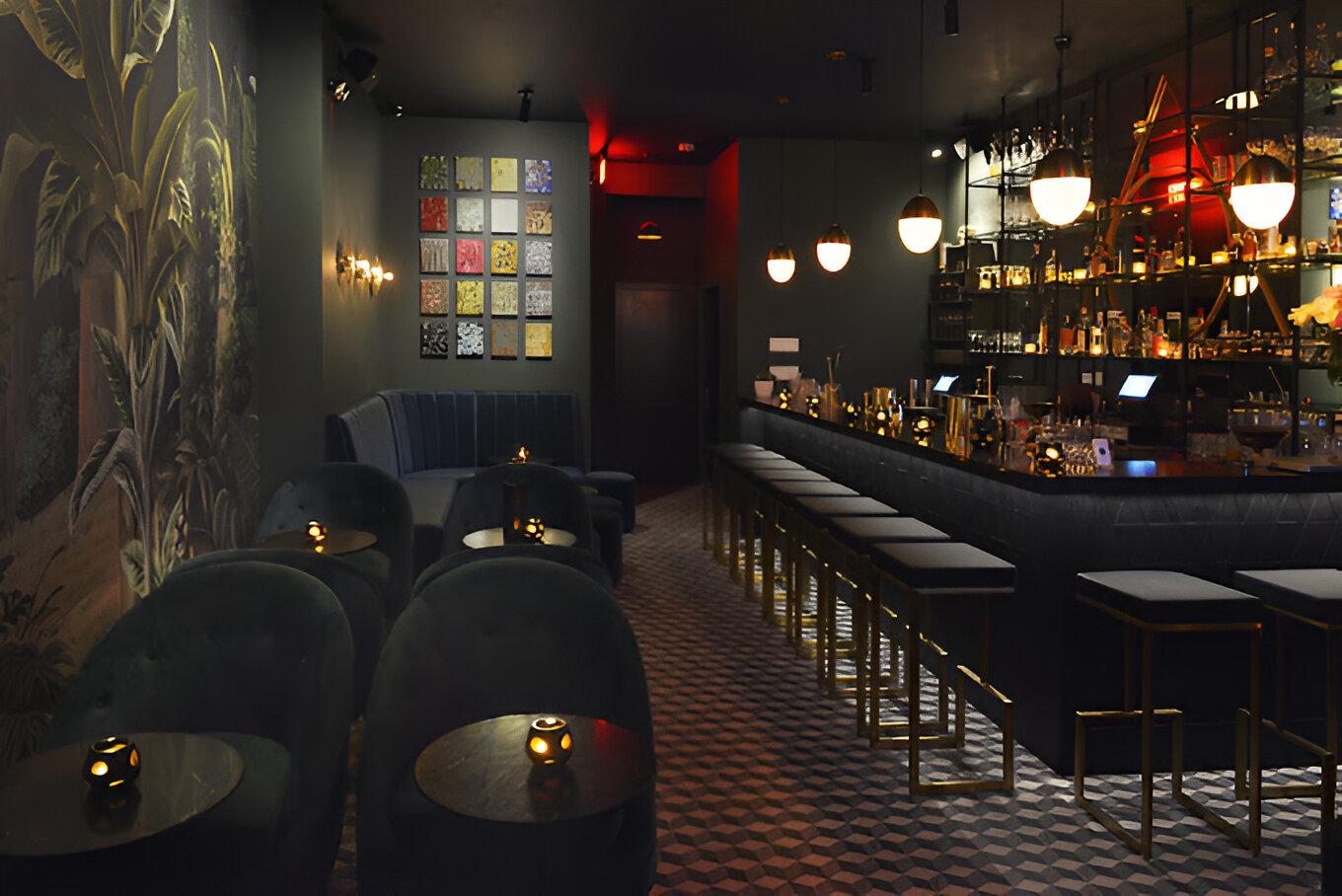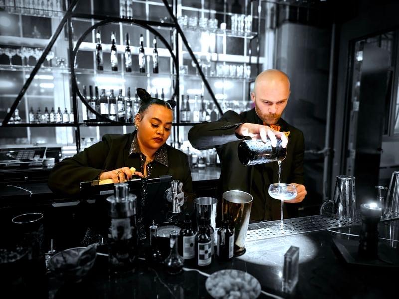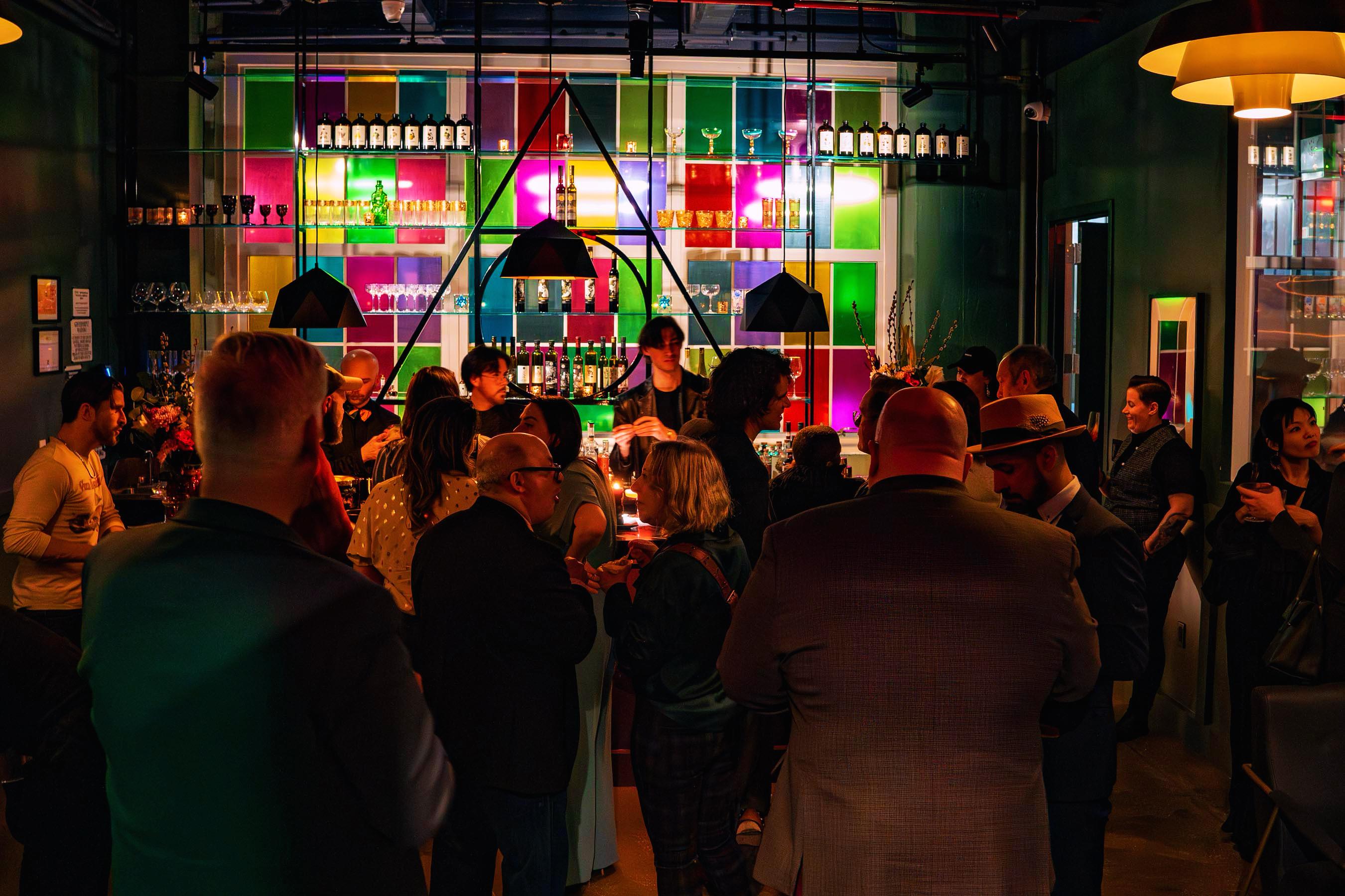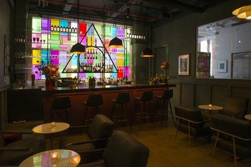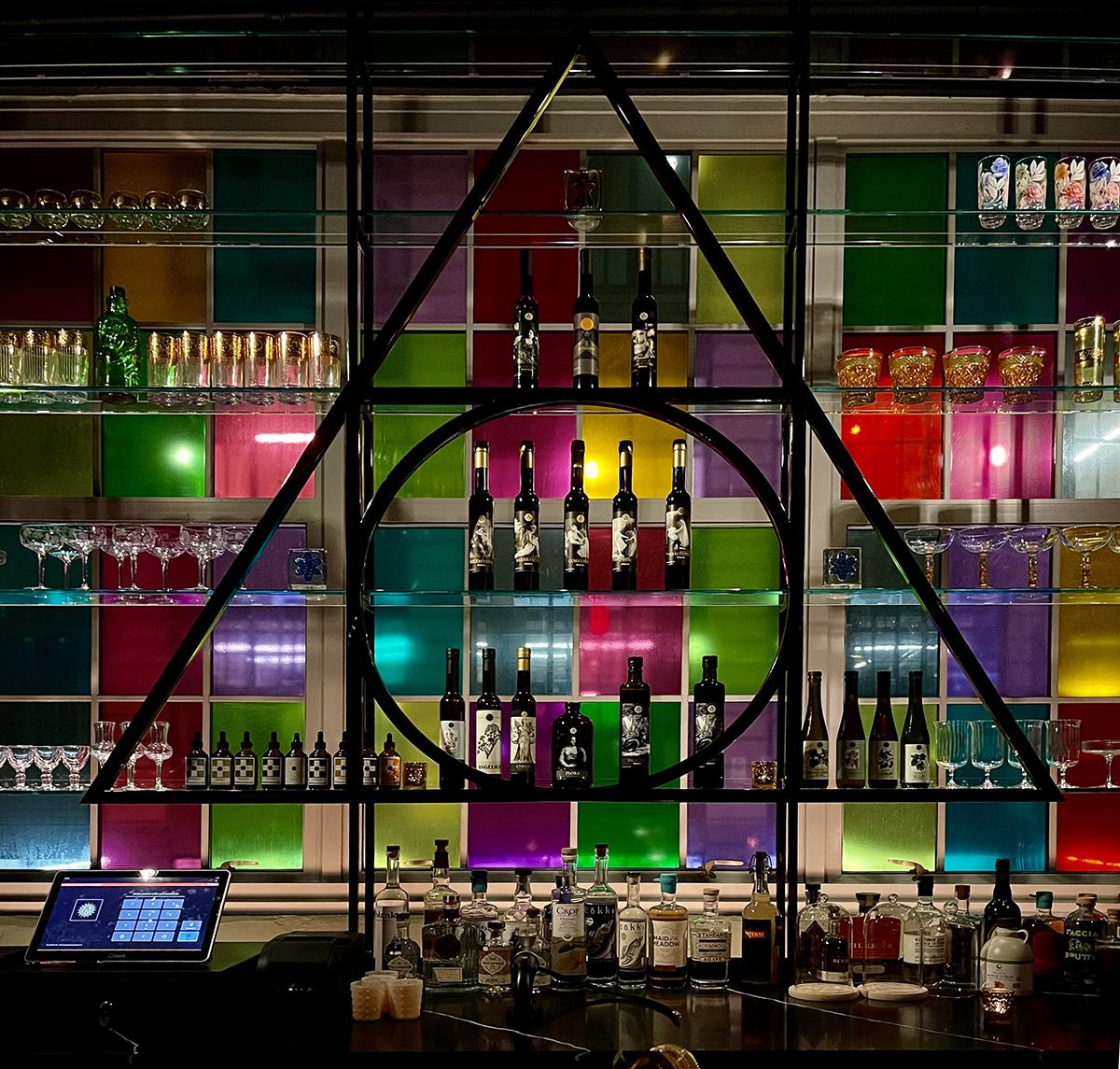 Experience the intimate ambiance of our 17-seat venue, thoughtfully designed by Jutras with a modern-industrial vibe in a green-and-plum color palette. Soft leather chairs and mid-century-inspired marble tables complement the space, illuminated by dimmed golden lighting. A stunning mosaic of 48 colored glass panels adorns the wall behind the bar, casting vibrant stained-glass patterns throughout the room. Central to our design is the Philosopher's Stone symbol, representing our ambition to exceed expectations. Guests can peek into our kitchen through a large window, witnessing the magic behind our creations in real-time.