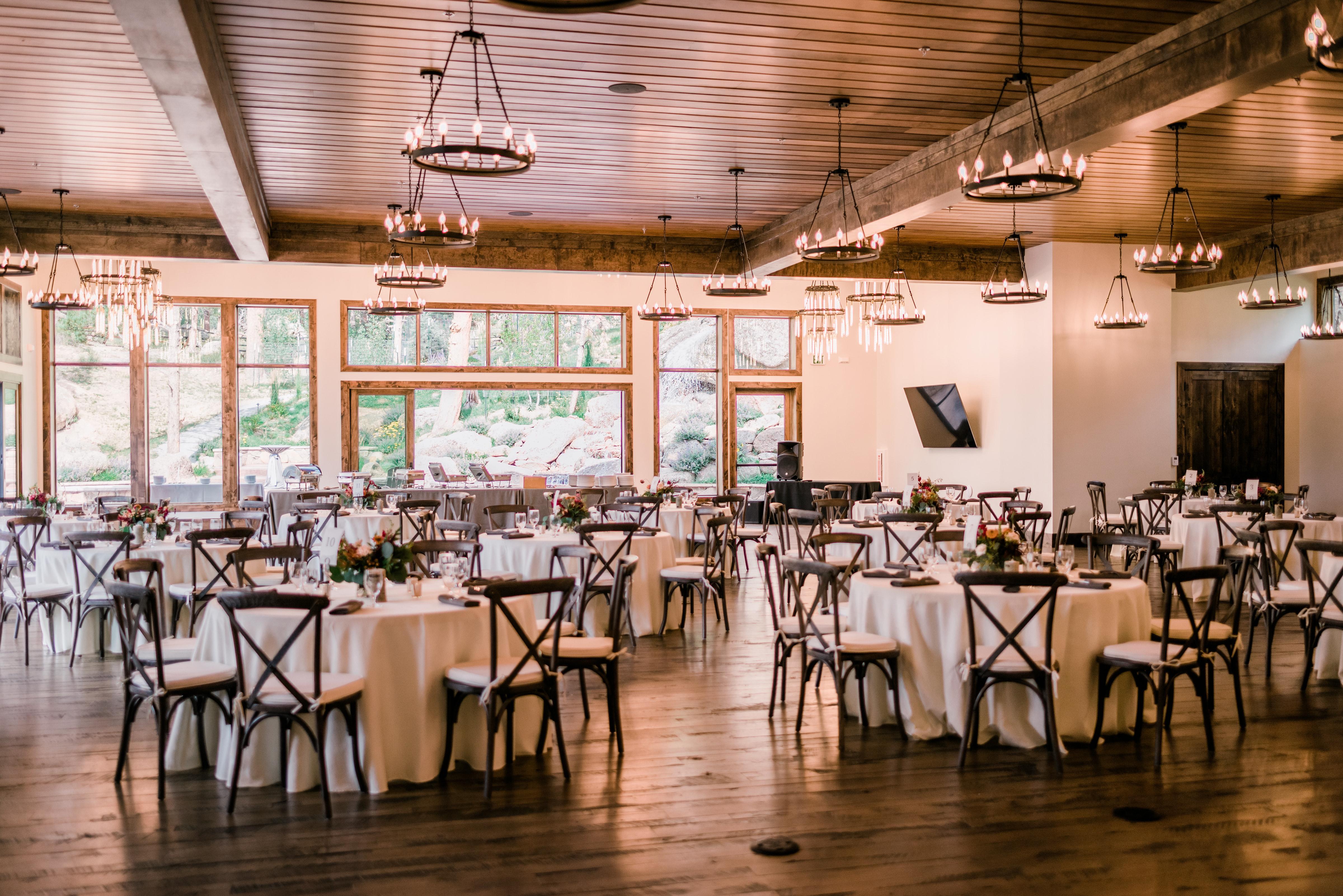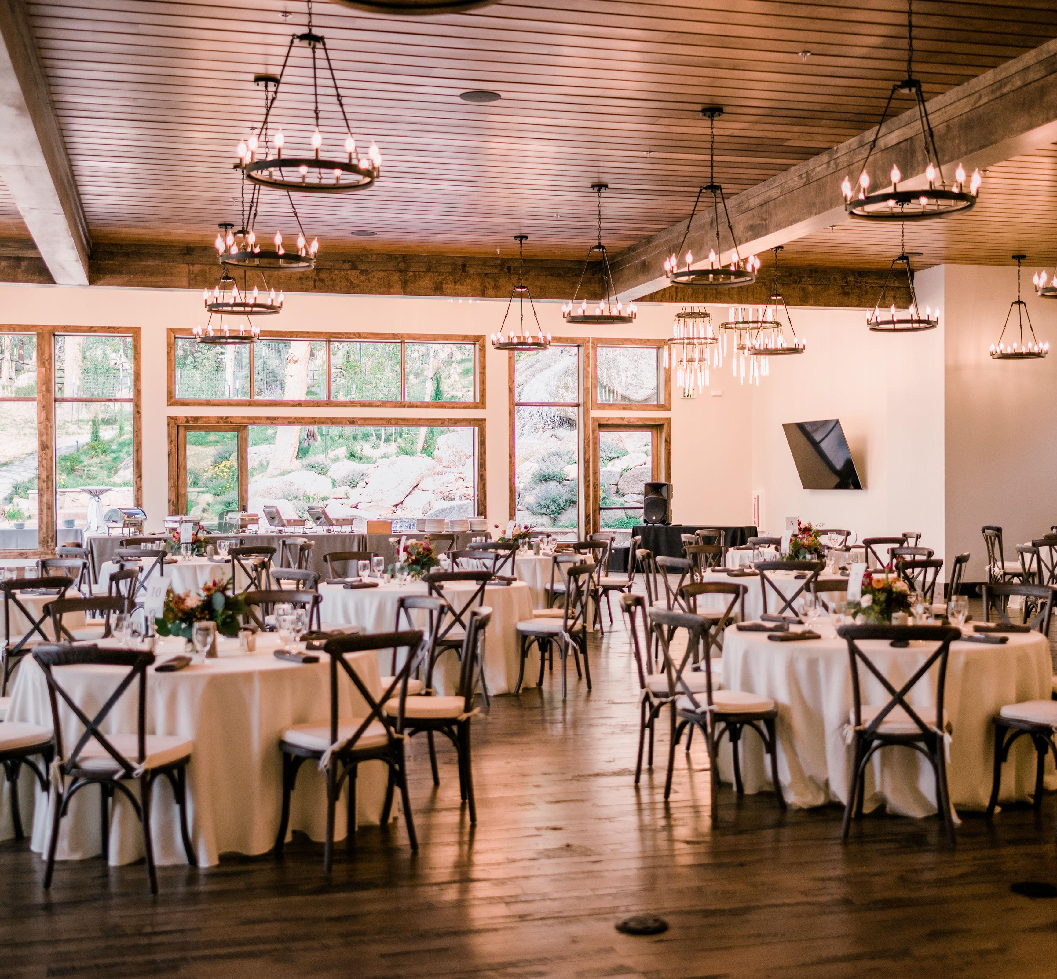 The Boulders venue can accommodate up to 200 guests and aesthetically is a modern event space with natural rock and industrial chandelier lighting. The ceremony and reception take place within the two-story building and there are large accordion opening windows for mountain views for your ceremony and reception. Beautiful wrap around outdoor deck for cocktail hour with fire pits and a waterfall.