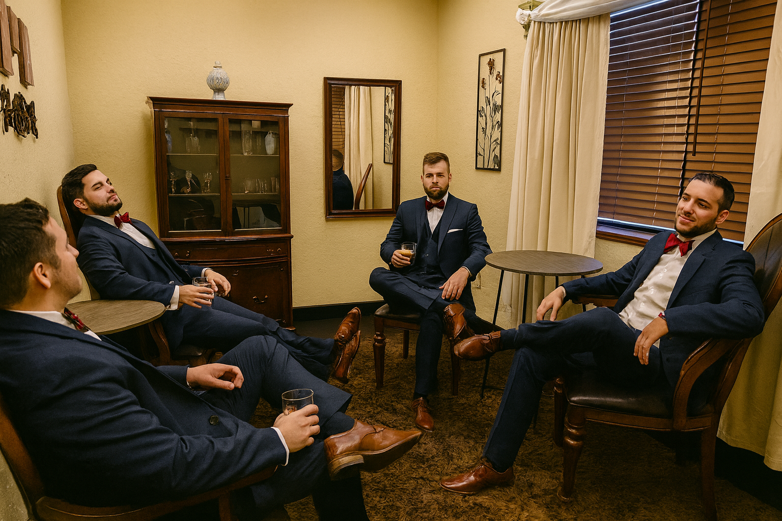 A gathering and get ready room for the groom and his crew. Fit for a gentleman with a bottle of bourbon to match.