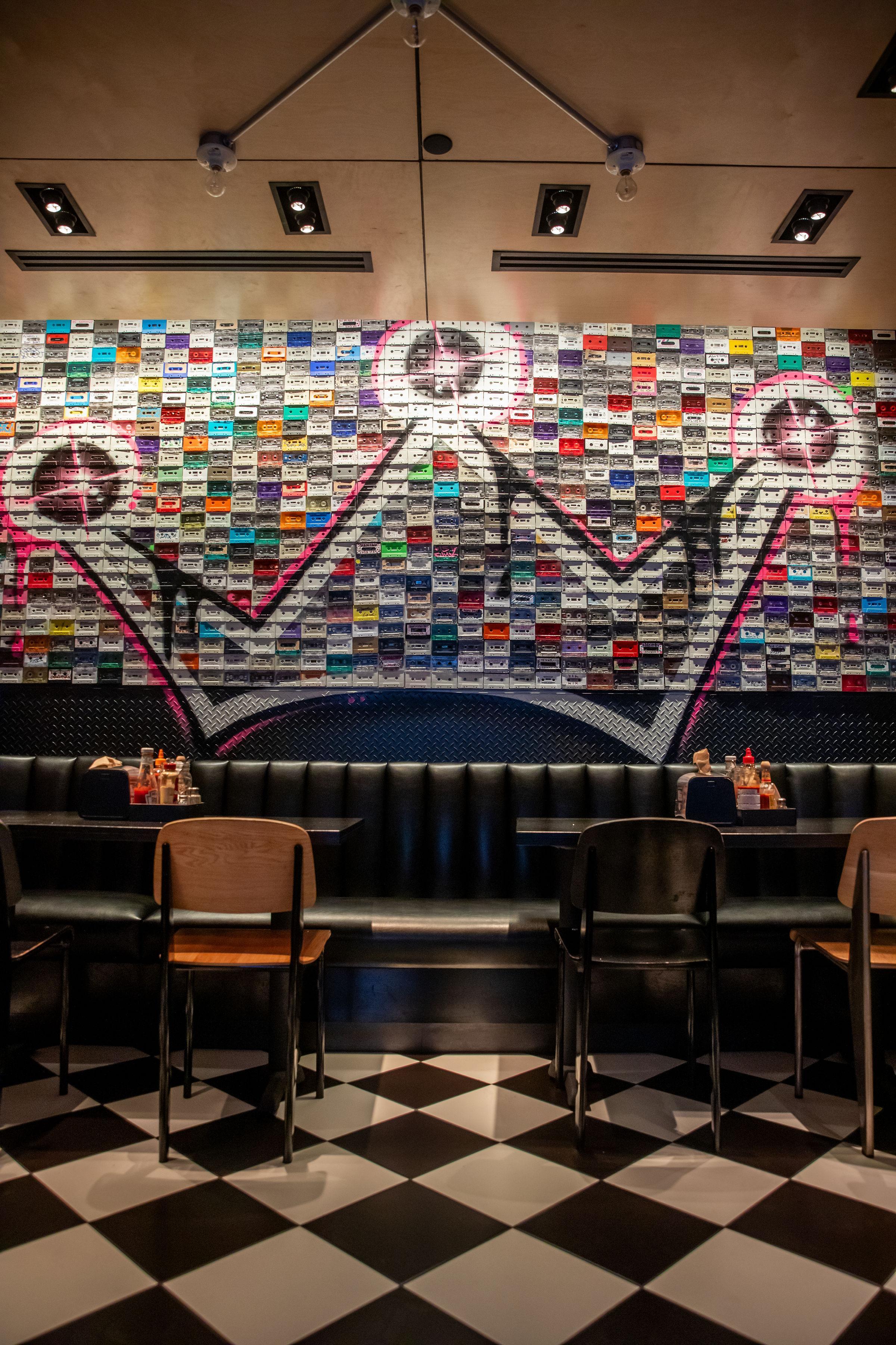 The Mixed Tape Room boasts a 90s-inspired decor, featuring graffiti walls, cassette tapes, and photos of iconic 90s artists, creating a nostalgic and vibrant atmosphere. The speakers play singalongs from the era, enhancing the lively environment.