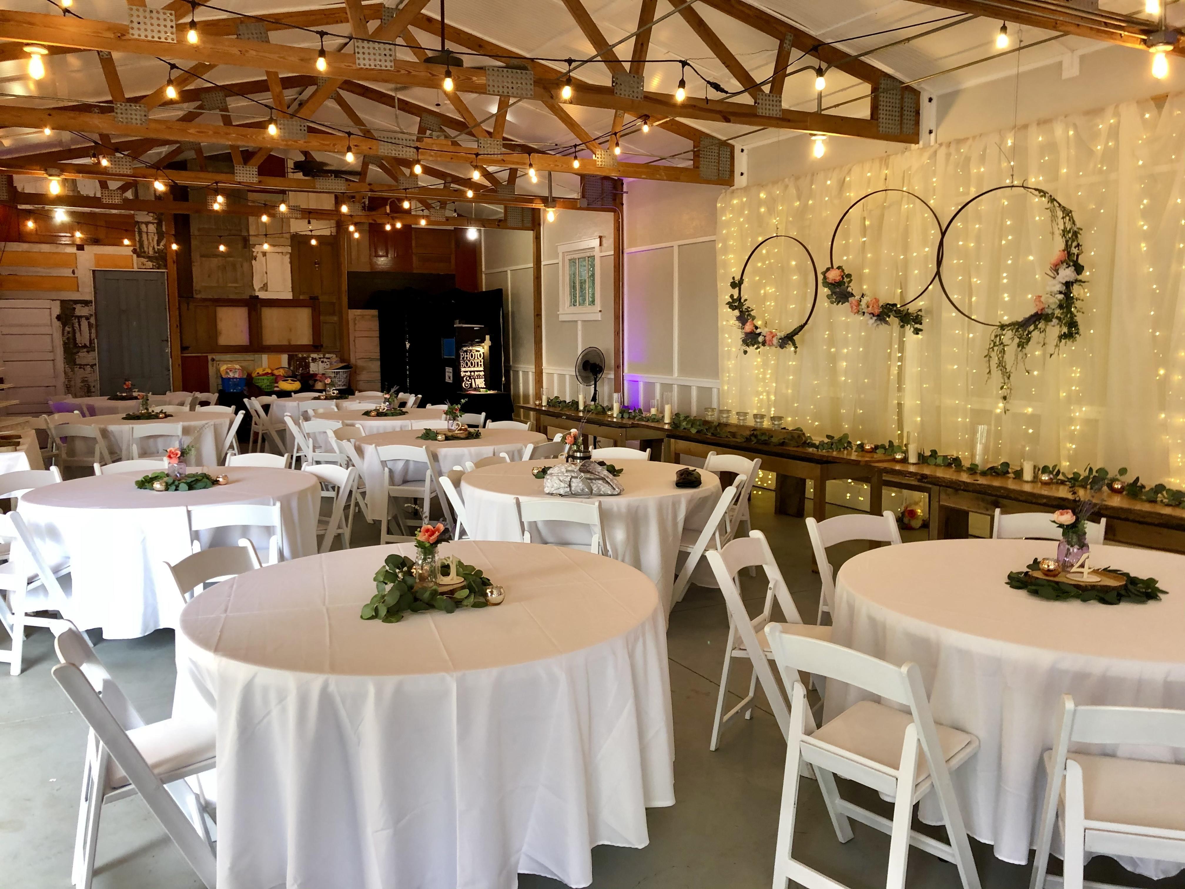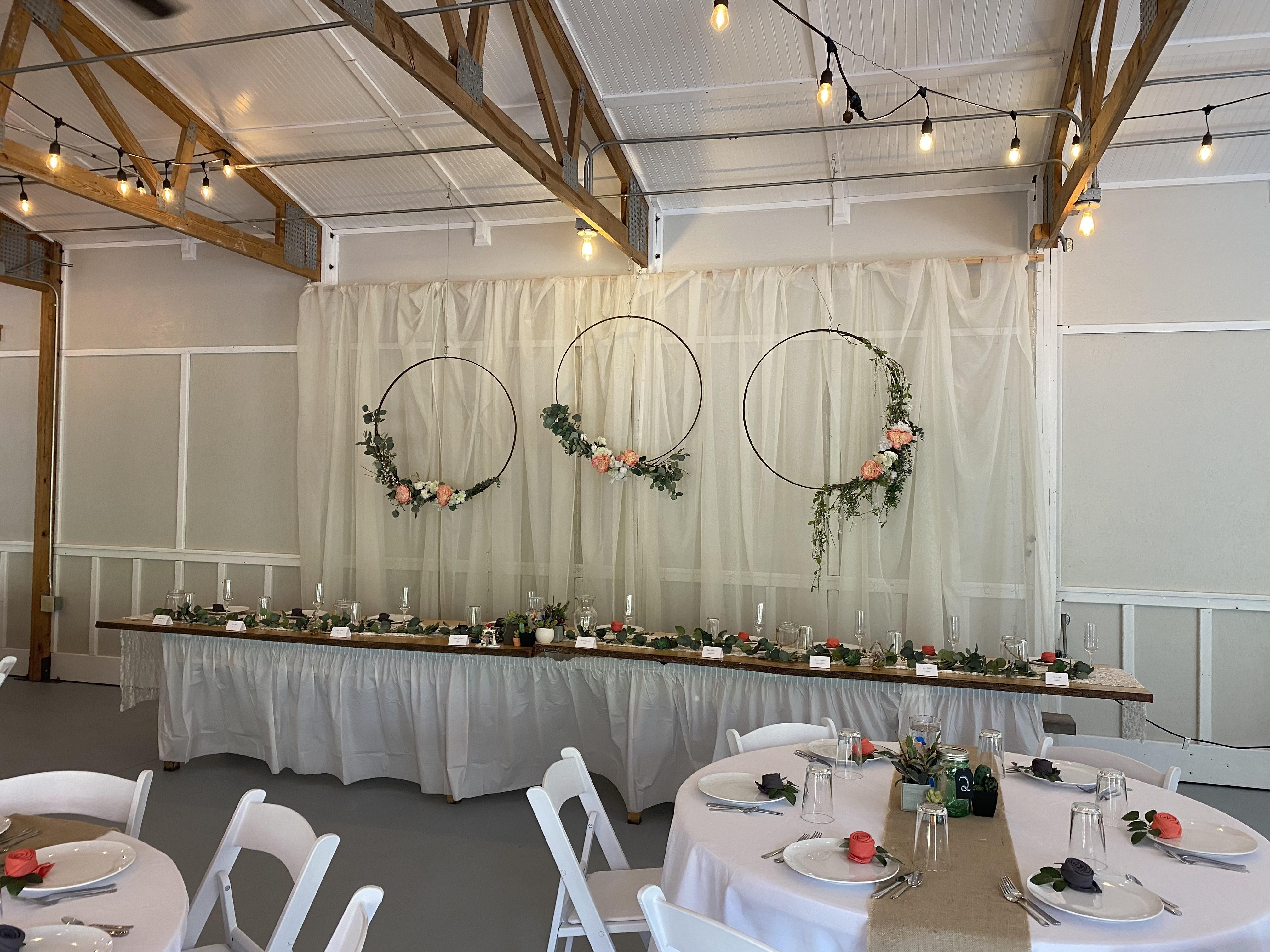 - Reclaimed wood door wall - Optional floral hoops, which can be customized for your wedding - Optional tent to extend seating space to 200 guests - Live edge wood tables - Live edge wood counters/ cabinets - Restrooms - Romantic bistro lighting