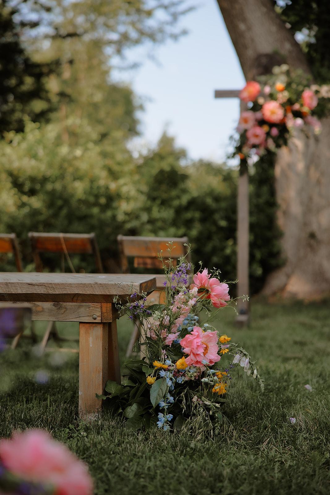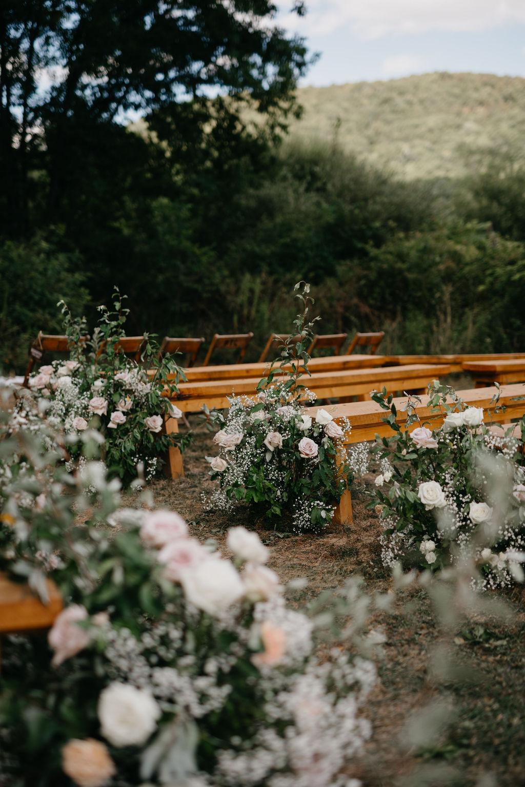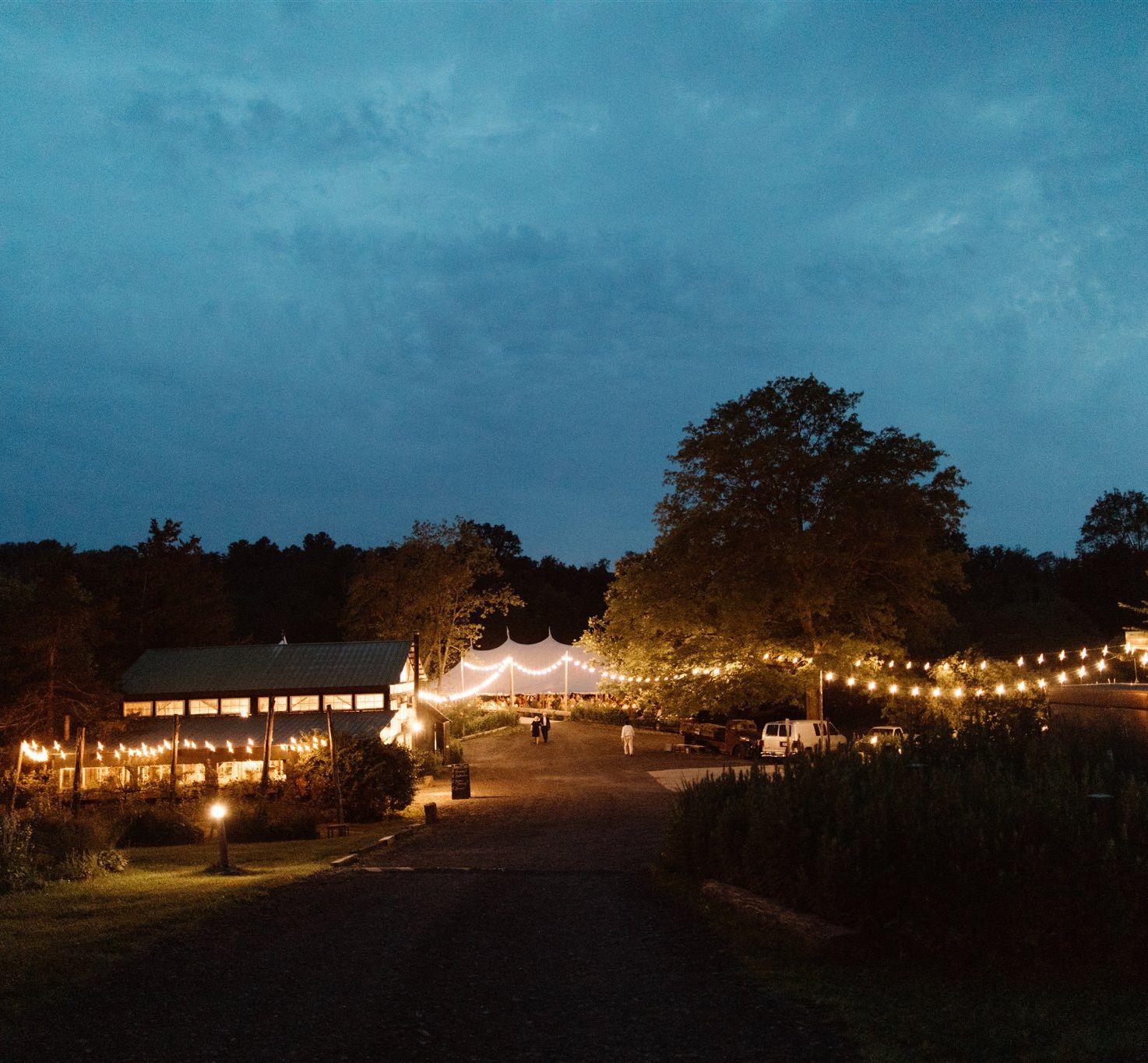 Our permanent reception tent is situated on a wooden platform beside a stream and fields of wildflowers, offering ample space for up to 200 guests. Enjoy picturesque views of rolling hills while your loved ones savor a farm-to-table meal and dance the night away. The temperature-controlled tent features handmade wooden bars, farm tables, vintage wooden chairs, and twinkly Edison bulb bistro lighting, and a cozy fire pit outside invites guests to enjoy s'mores under the stars.